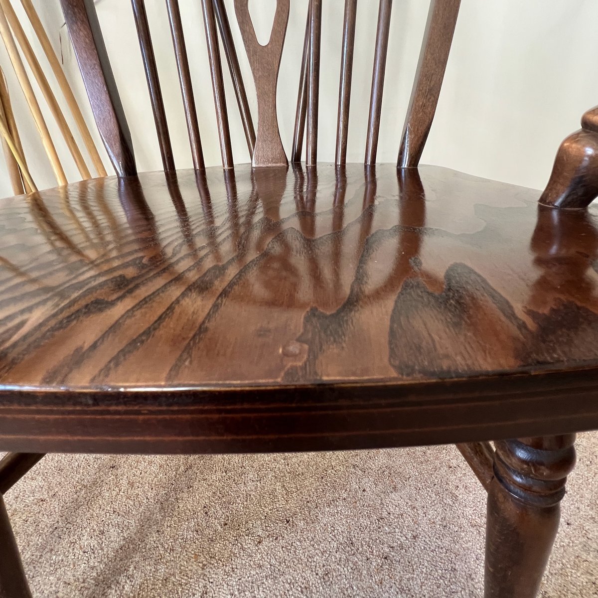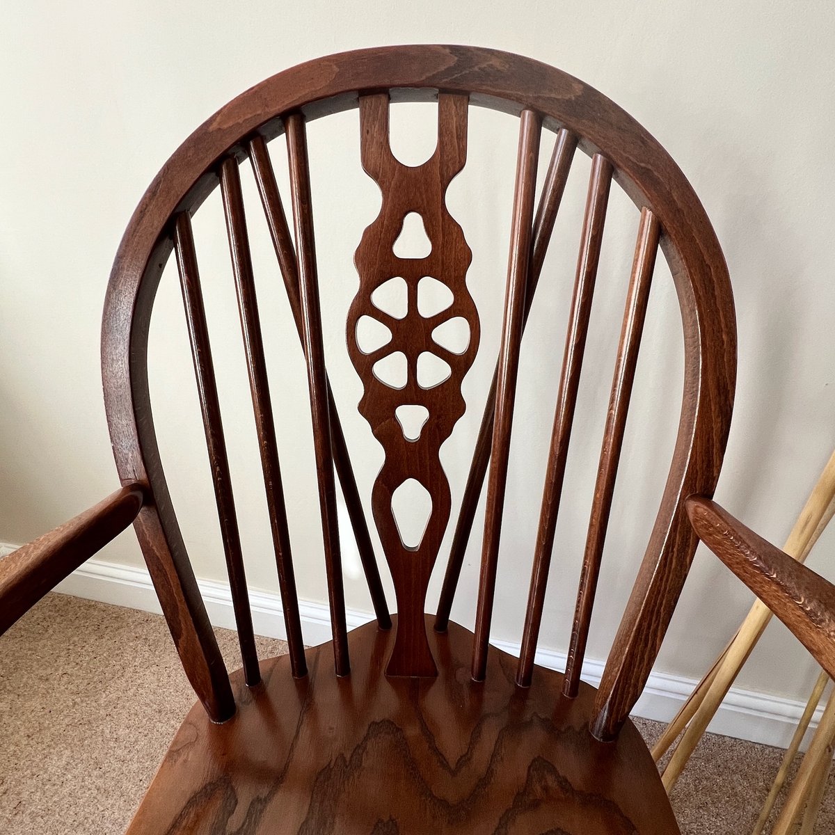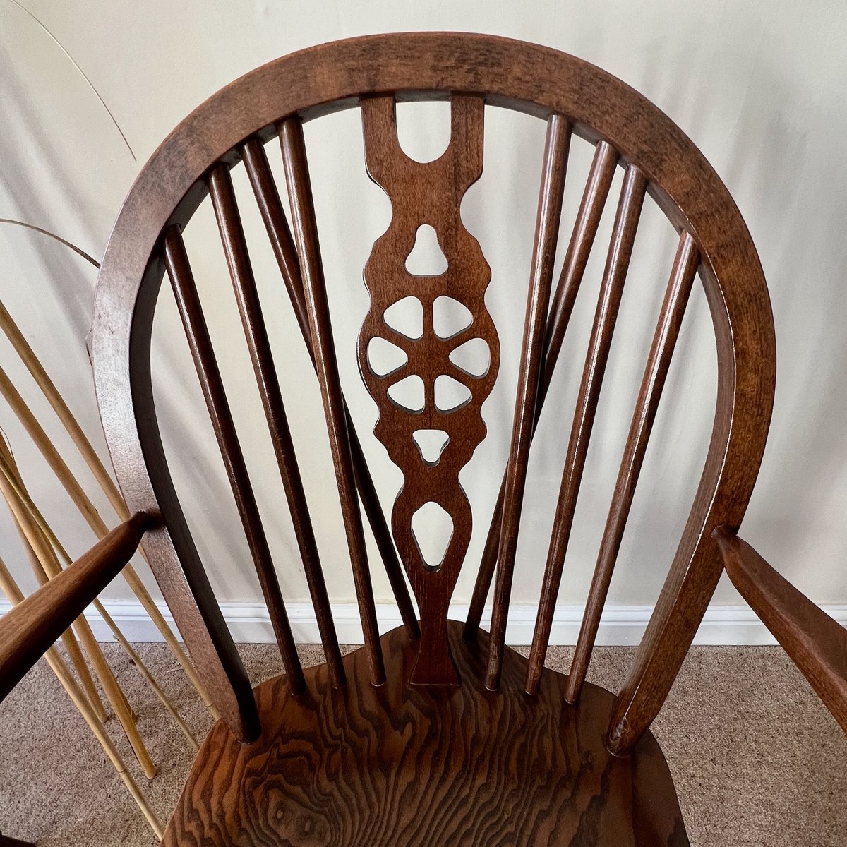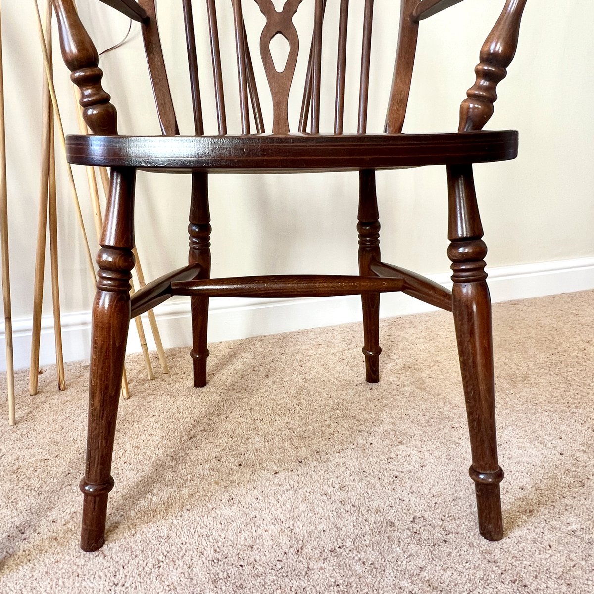 A pair of vintage English Windsor wheelback armchairs in the traditional country style. Each chair features a steam-bent hoop back with slender spindle supports and a distinctive wheelback splat, shaped arms on turned supports, and a broad saddle seat. The turned legs are joined by stretchers, combining strength with elegance, with the additional bracing spindles into the back for extra stiffness.