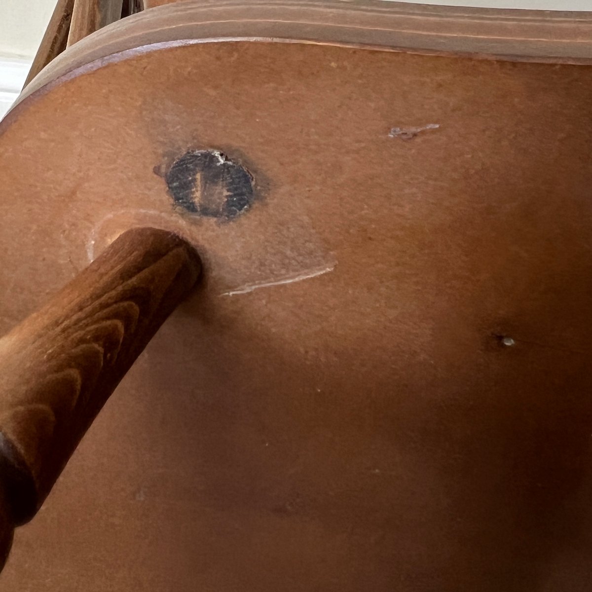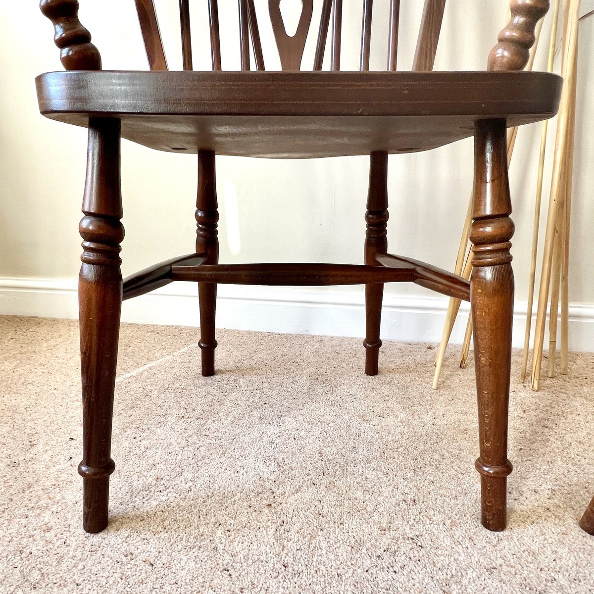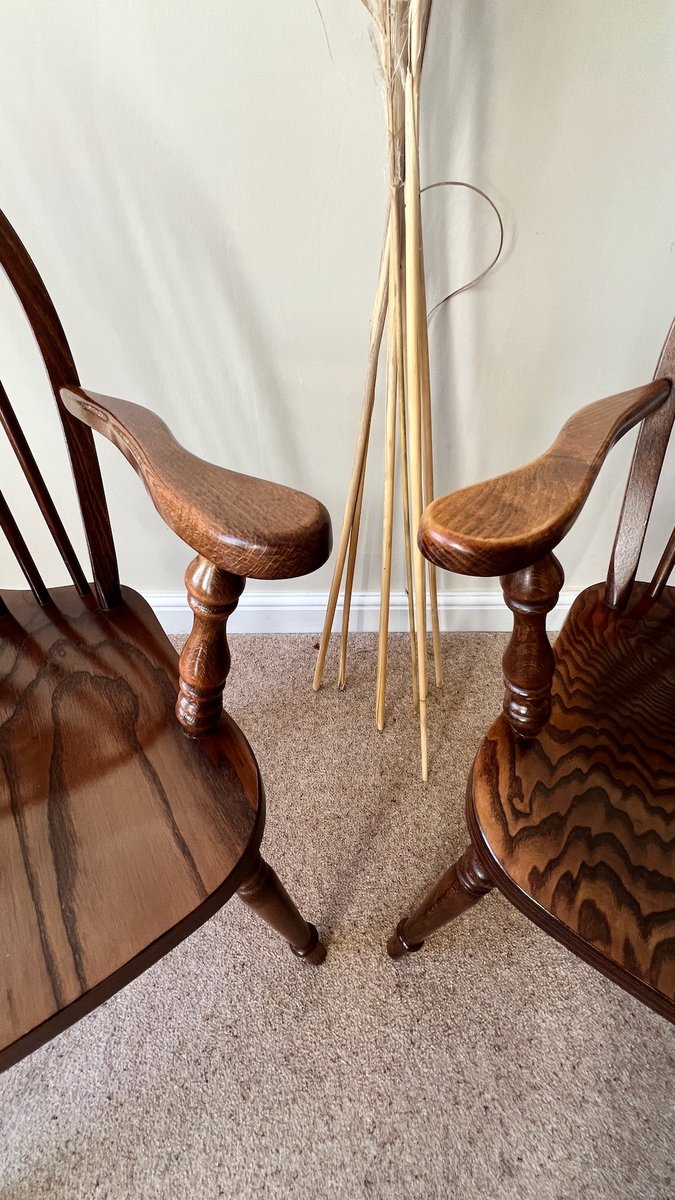Fabricadas a mediados del siglo XX, estas sillas reviven las formas clásicas de las sillas Windsor inglesas de estilo georgiano y regencia, al tiempo que ofrecen la solidez de la construcción de época. Los asientos están fabricados con chapa de roble sobre un núcleo de madera contrachapada, complementada con un armazón de madera maciza y patas torneadas, todo ello acabado en un cálido teñido pulido. Su estilo atemporal las hace ideales como sillas de comedor, asientos de escritorio o sillas decorativas de acento en interiores rústicos y contemporáneos por igual.