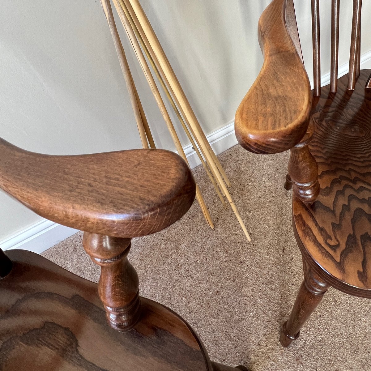 Crafted in the mid-20th century, these chairs revive the classic English Georgian and Regency Windsor forms while offering the sturdiness of vintage construction. The seats are made with oak veneer over a plywood core, complemented by a solid wood frame and turned legs, all finished in a warm stained polish. Both chairs are very solidly made and remain strong, stable, and practical for everyday use.Their timeless style makes them ideal as dining chairs, desk seating, or decorative accent chairs in rustic and contemporary interiors alike.