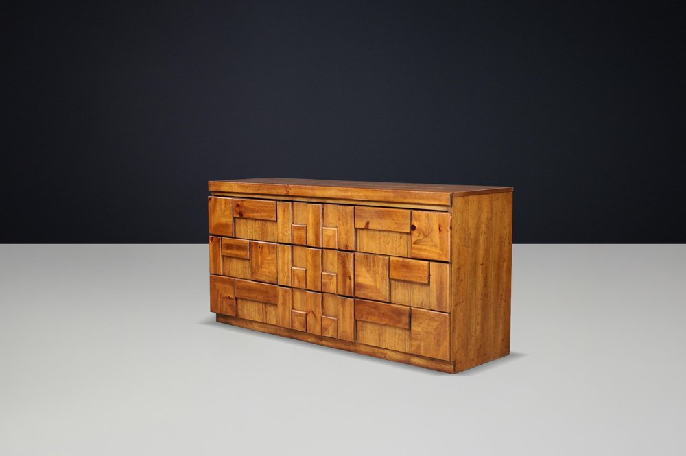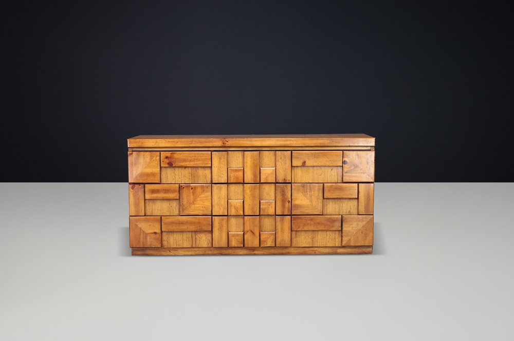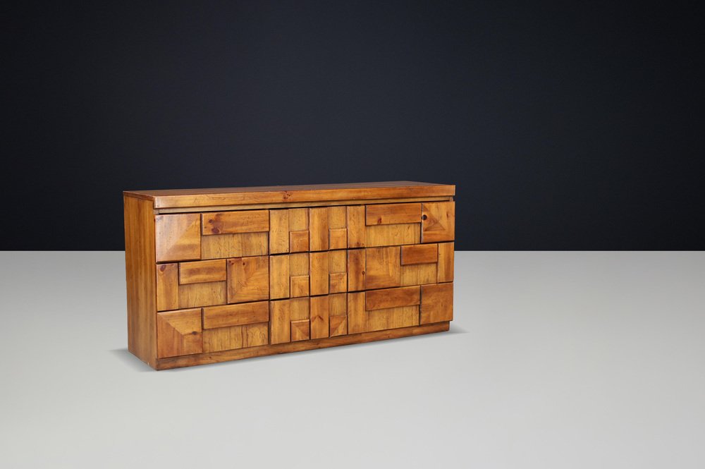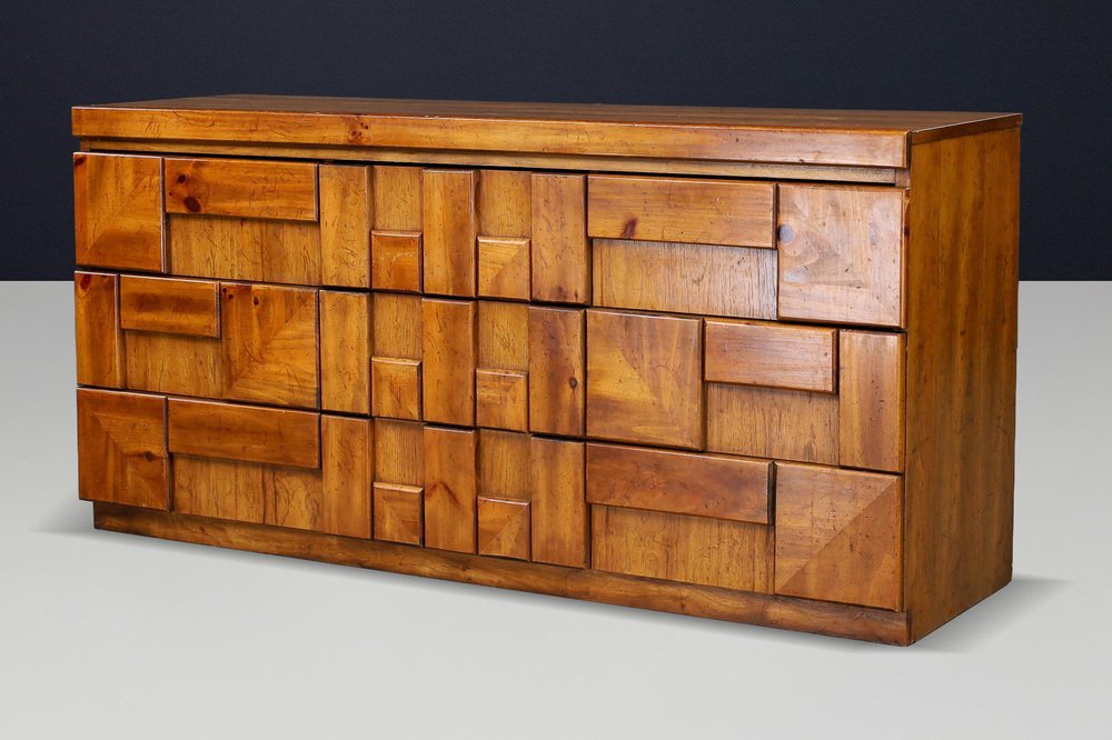 Brutalist “Staccato” Dresser by Lane Furniture, USA, 1970s Striking Brutalist dresser from the “Staccato” series by Lane Furniture, USA, 1970s. This architectural piece showcases Lane’s signature geometric sculpted front, composed of raised walnut blocks arranged in a rhythmic pattern that plays with depth and shadow. The solid walnut and walnut veneer construction displays a warm honey-brown tone with beautiful natural grain. Featuring nine drawers, this piece offers generous storage while maintaining a strong sculptural presence. The dresser’s bold, textured facade exemplifies the Brutalist design language of the 1970s—where craftsmanship meets modernist architecture. This model pairs perfectly with the matching tallboy chest from the same series, creating a complete Brutalist bedroom ensemble. A true statement piece for collectors and interior designers seeking authentic American mid-century Brutalism. Condition Very good original condition with attractive patina and minimal signs of age. Structurally solid, drawers run smoothly. Dimensions Height: 76 cm (29.9 in.) Width: 158 cm (62.2 in.) Depth: 47 cm (18.5 in.) Details Design: Lane Furniture, USA Model: “Staccato” series Period: 1970s Material: Walnut and walnut veneer Nine drawers Style: Brutalist / Mid-Century Modern Original finish with warm patina