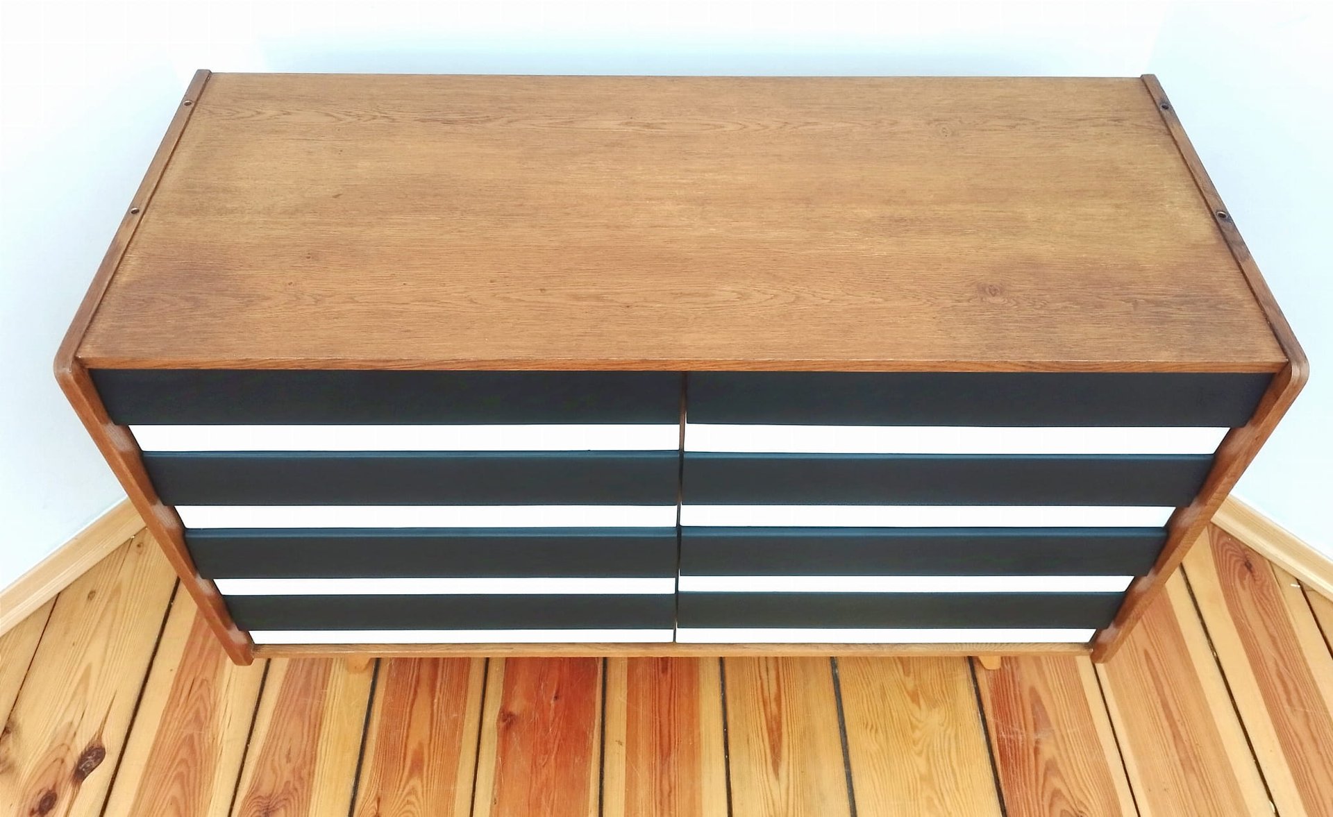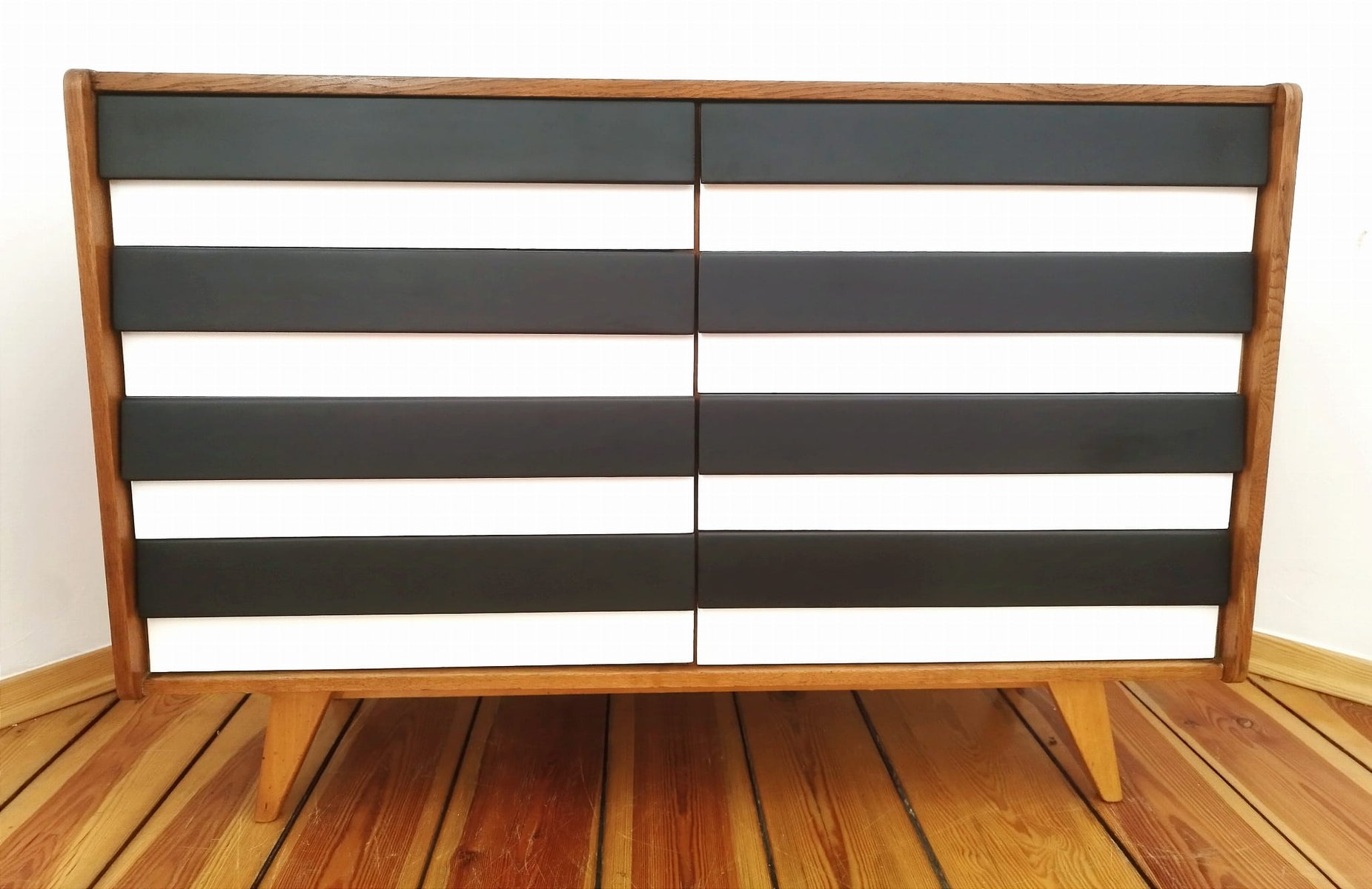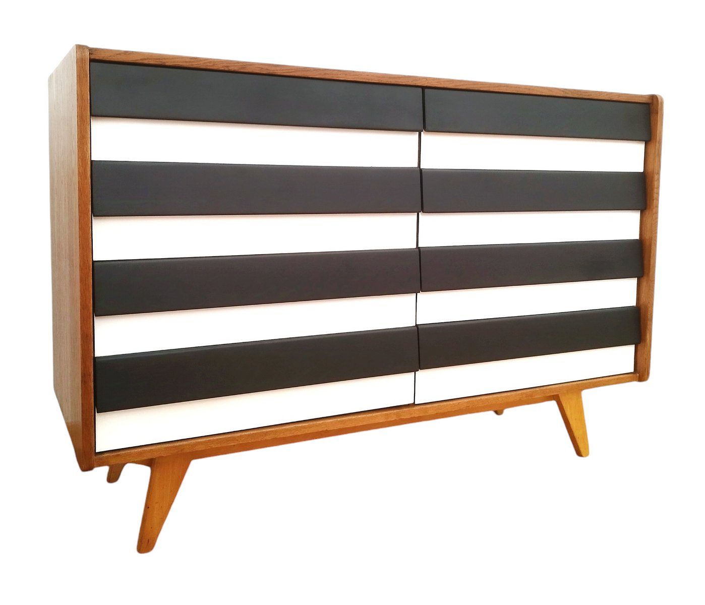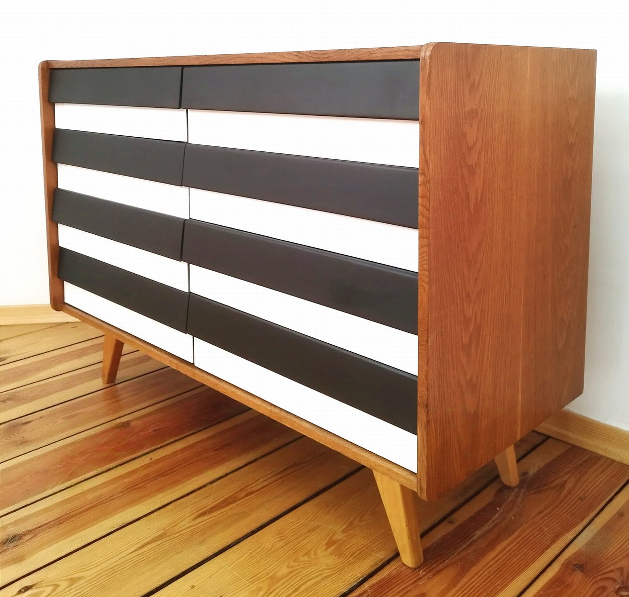 On the heels of early successes, Jiroutek became the head of design at Interier Praha in 1958 and soon after began work on the U-450 series. The designs were heavily inspired by the watershed ’58 Expo in Brussels, which moved Czech postwar design generally toward a “softer” modernism—one characterized by pastel colors, new geometries, and the use of modern materials like engineered composites, glass, and concrete. Jiroutek became know especially for the simple morphologies of oak-veneered sideboards and cabinets with sleekly color-blocked sliding doors and drawers.
