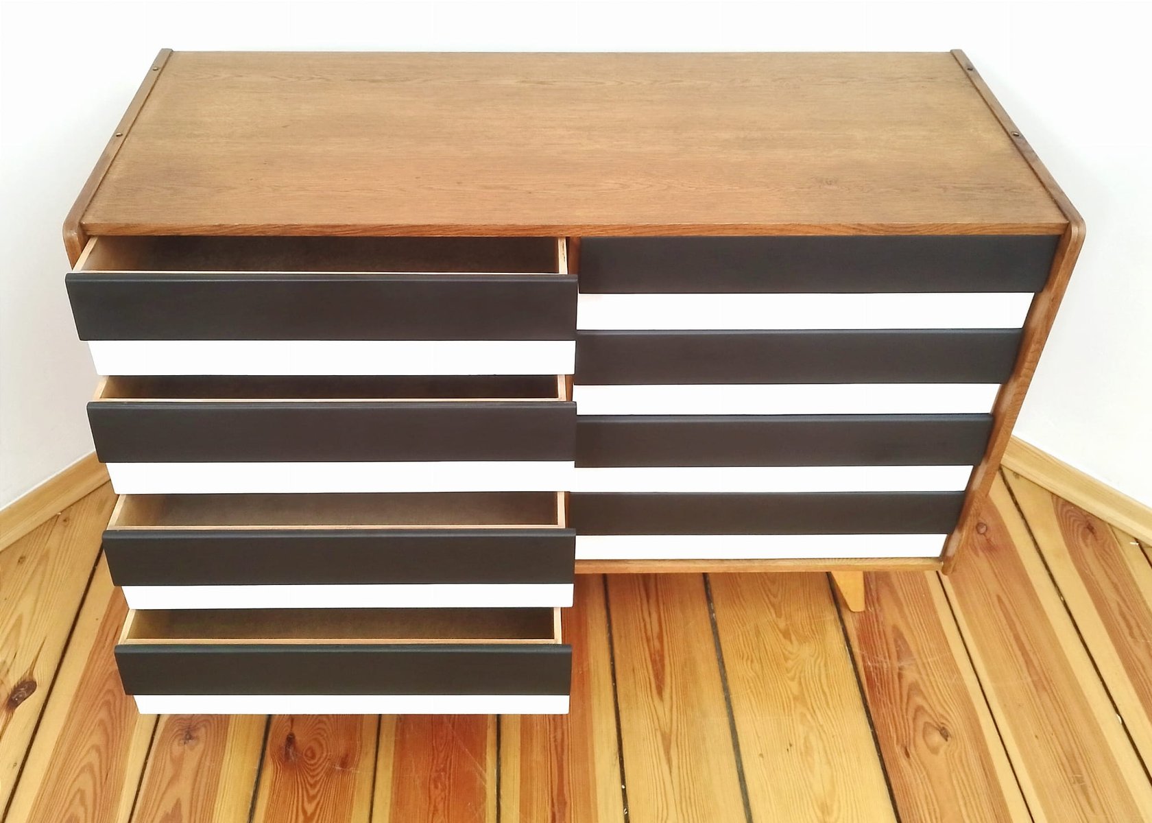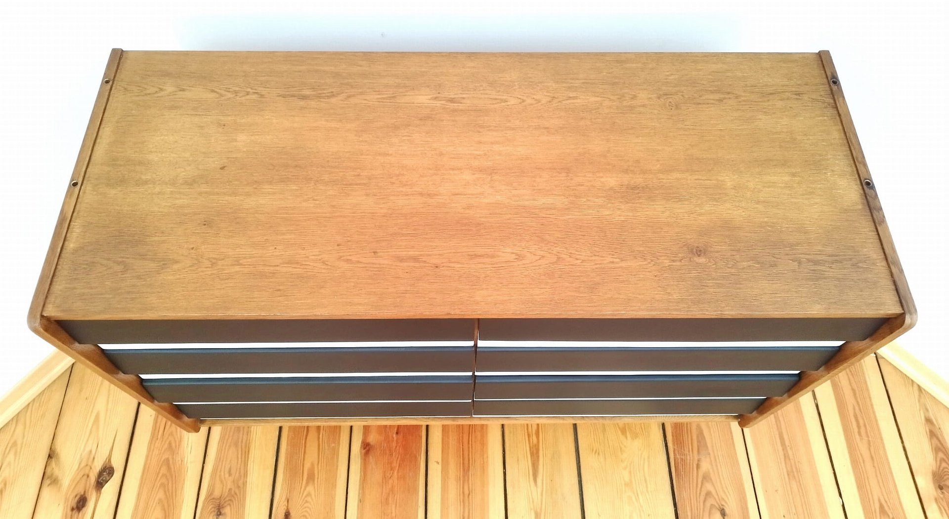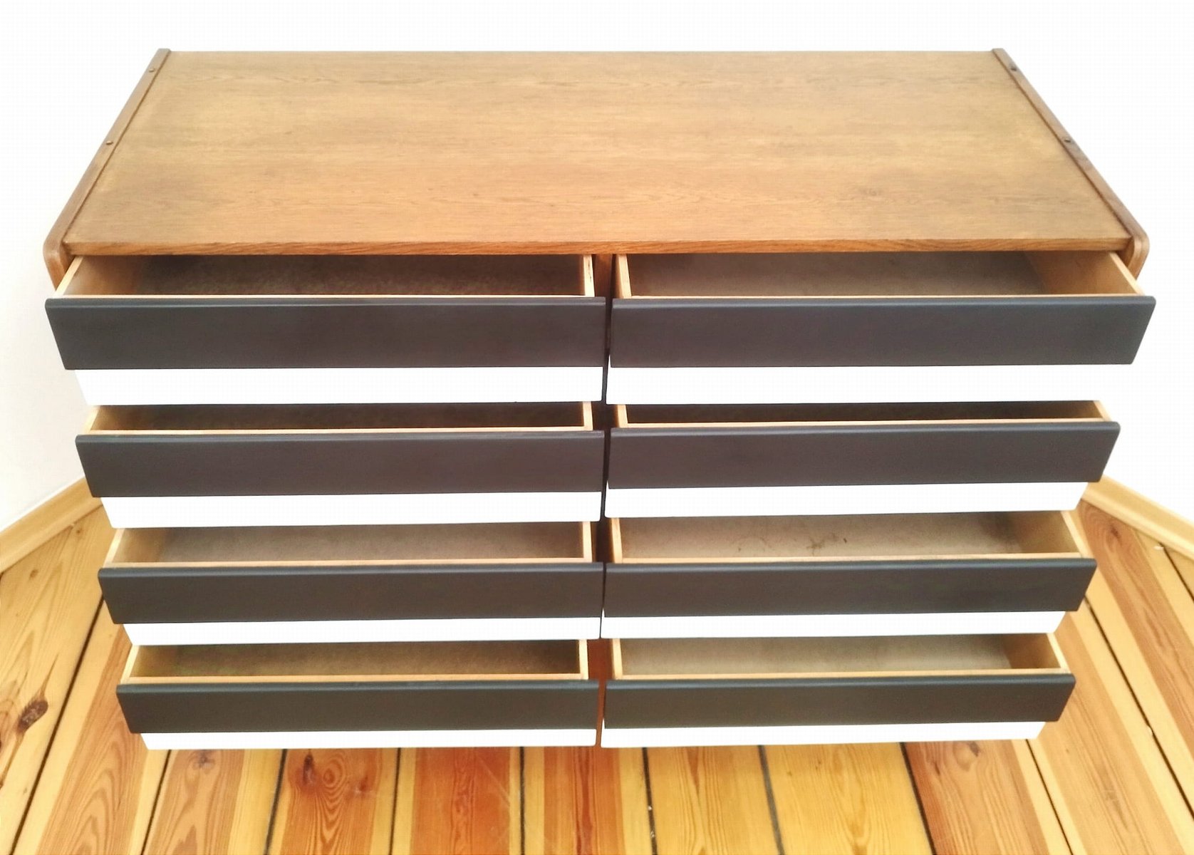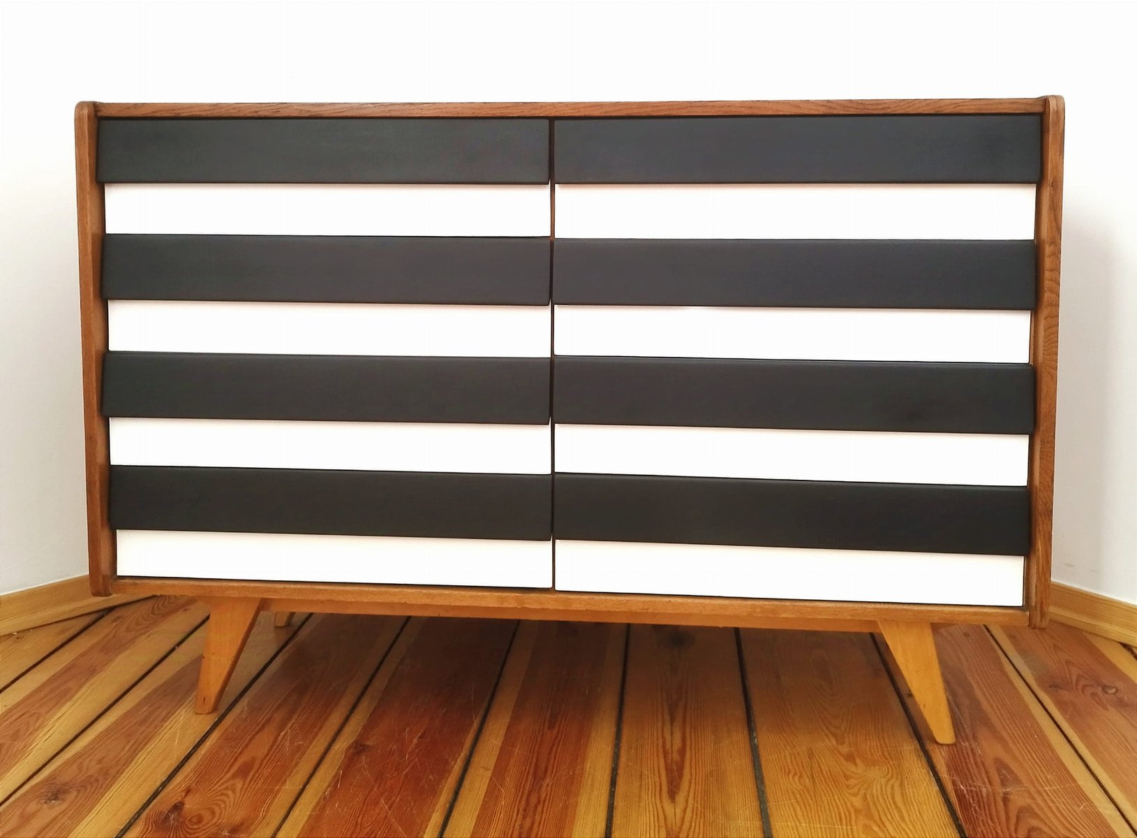 On the heels of early successes, Jiroutek became the head of design at Interier Praha in 1958 and soon after began work on the U-450 series. The designs were heavily inspired by the watershed ’58 Expo in Brussels, which moved Czech postwar design generally toward a “softer” modernism—one characterized by pastel colors, new geometries, and the use of modern materials like engineered composites, glass, and concrete. Jiroutek became know especially for the simple morphologies of oak-veneered sideboards and cabinets with sleekly color-blocked sliding doors and drawers.