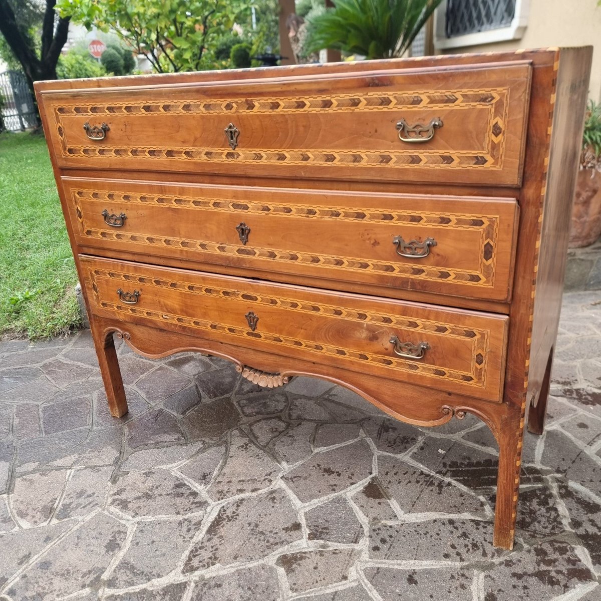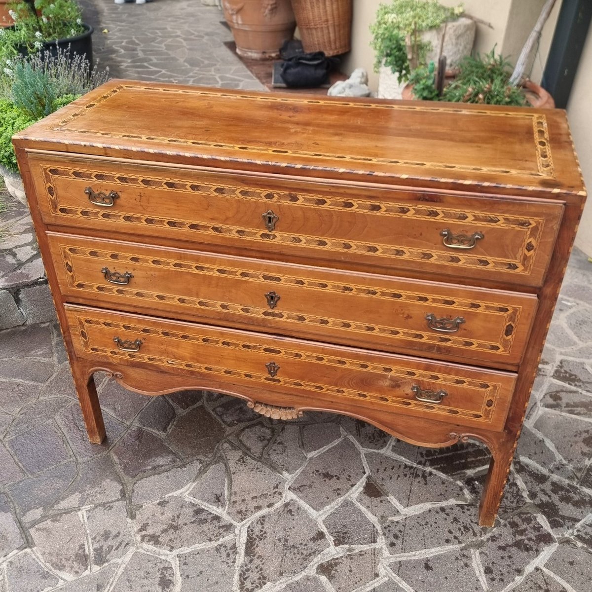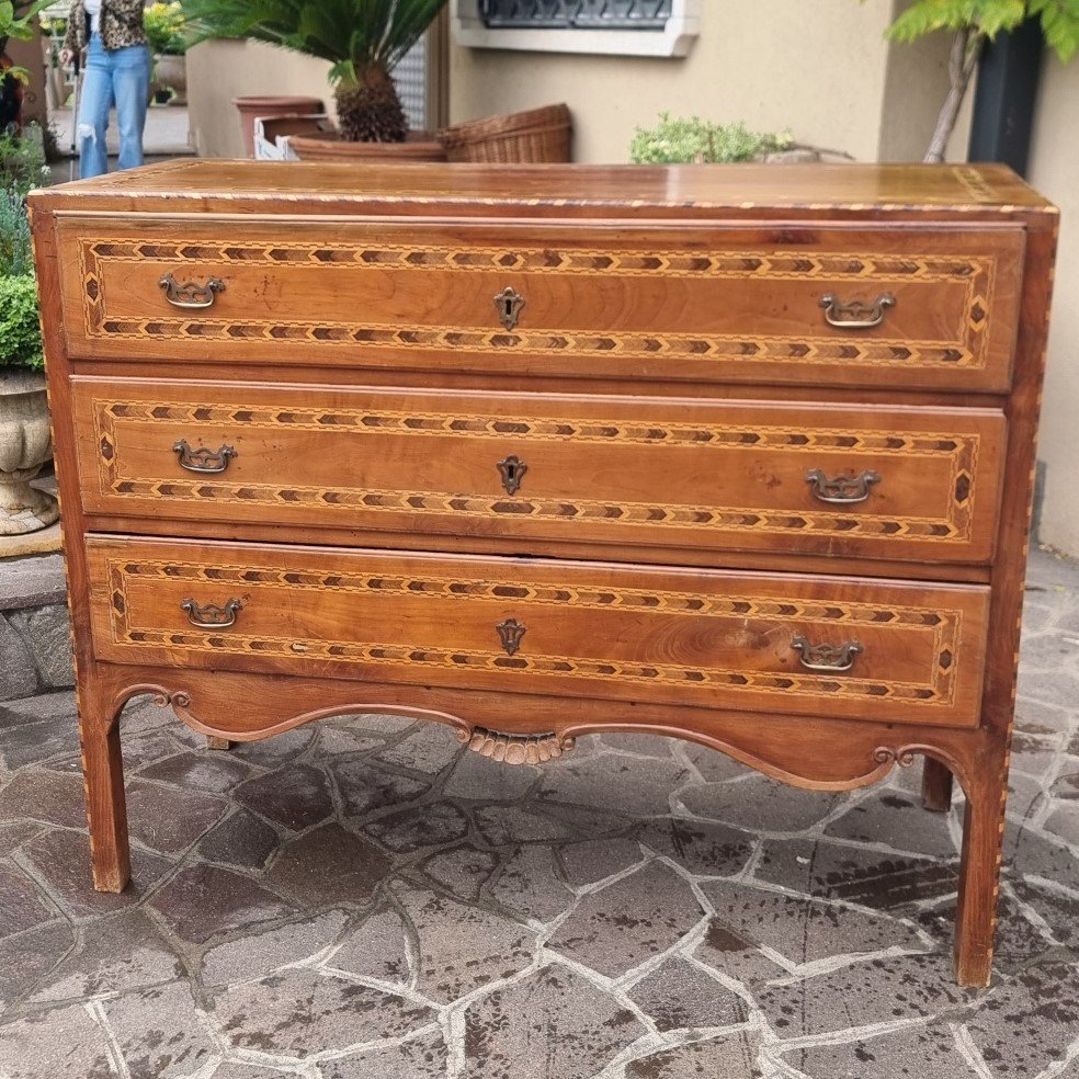 Directory chest of drawers from the 18th century in Vicenza in walnut and cherry inlays