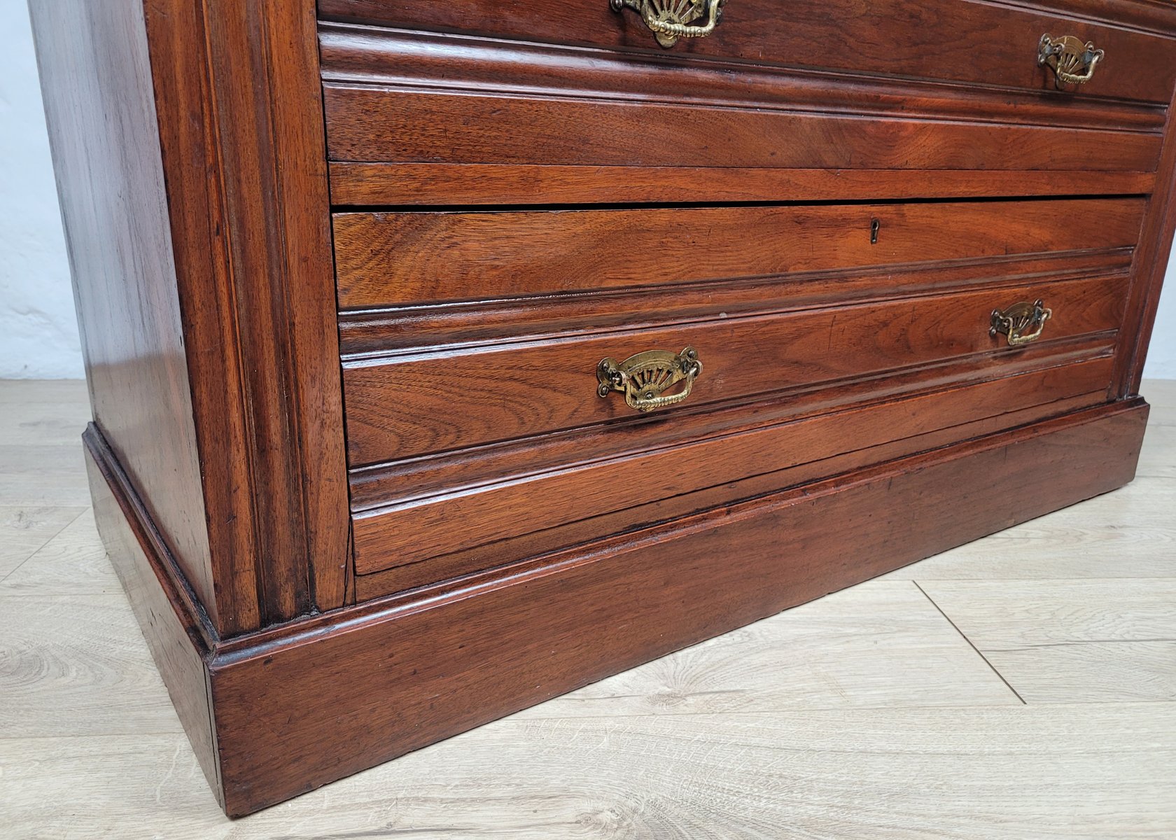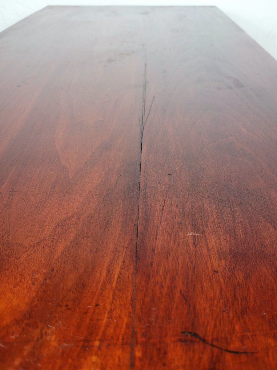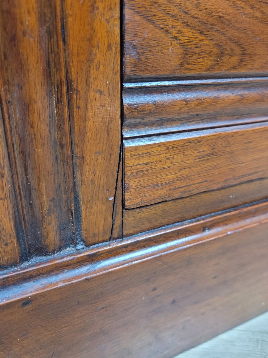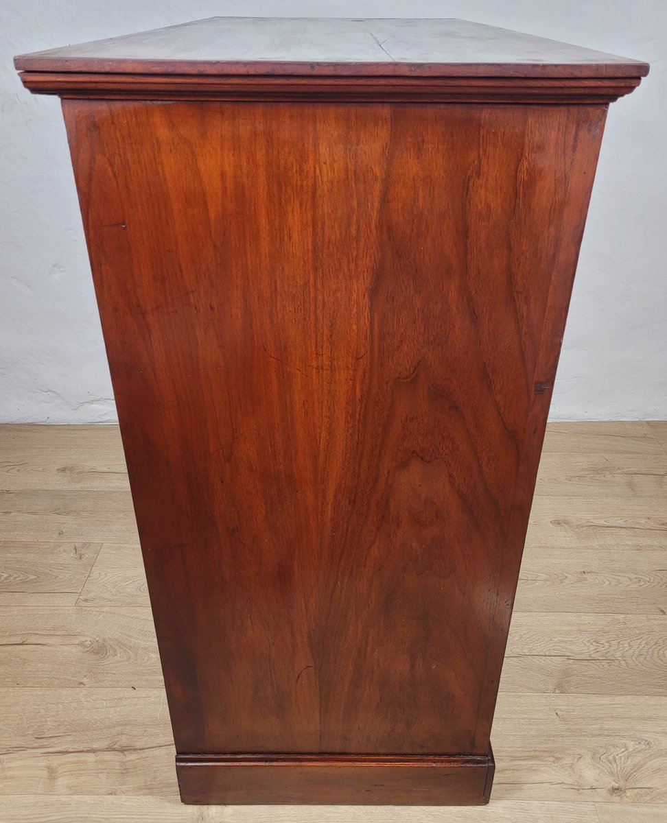 En general, esta cómoda se encuentra en muy buen estado, con signos de uso y desgaste, como es de esperar en un mueble de esta antigüedad (véanse las fotografías). Presenta grietas históricas en la madera de la parte superior, los laterales y la base inferior, acordes con su antigüedad (véanse las fotografías). Hay una pequeña mella en la esquina derecha de la cómoda (véase la fotografía). Medidas aproximadas: