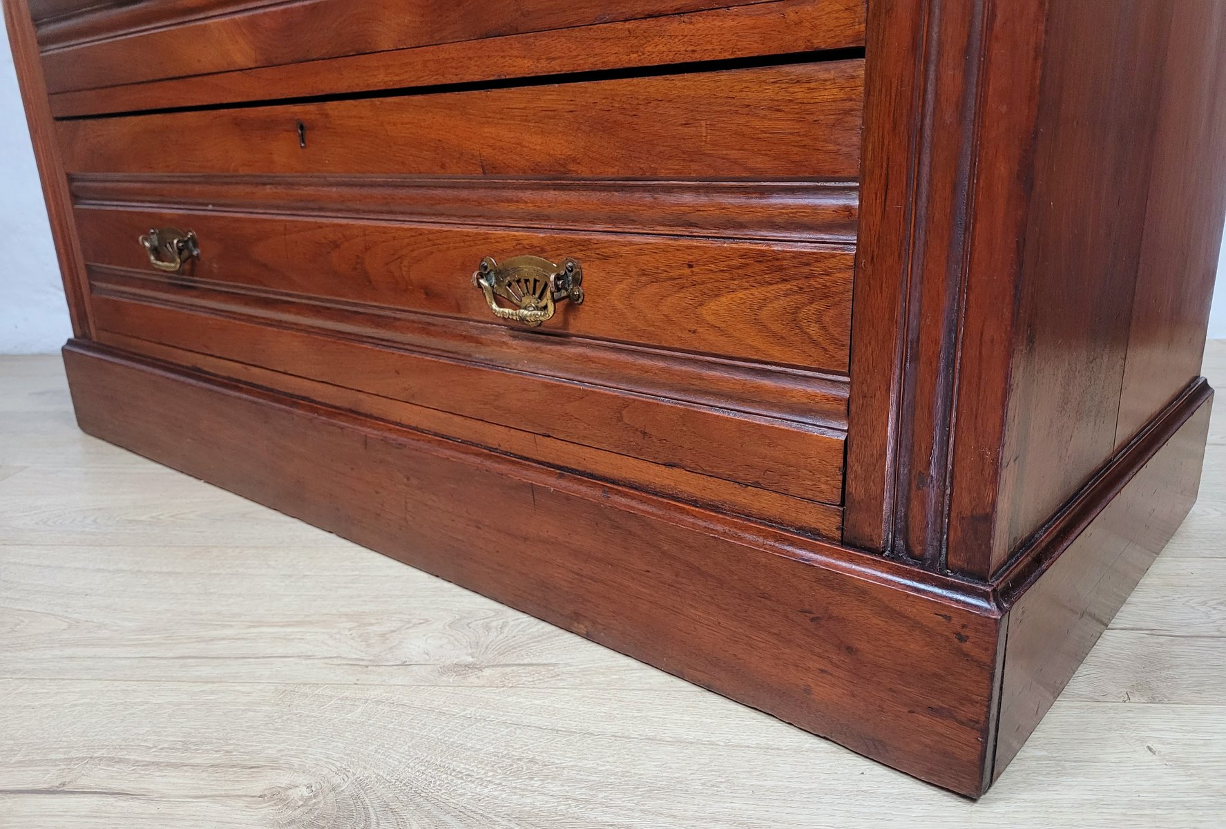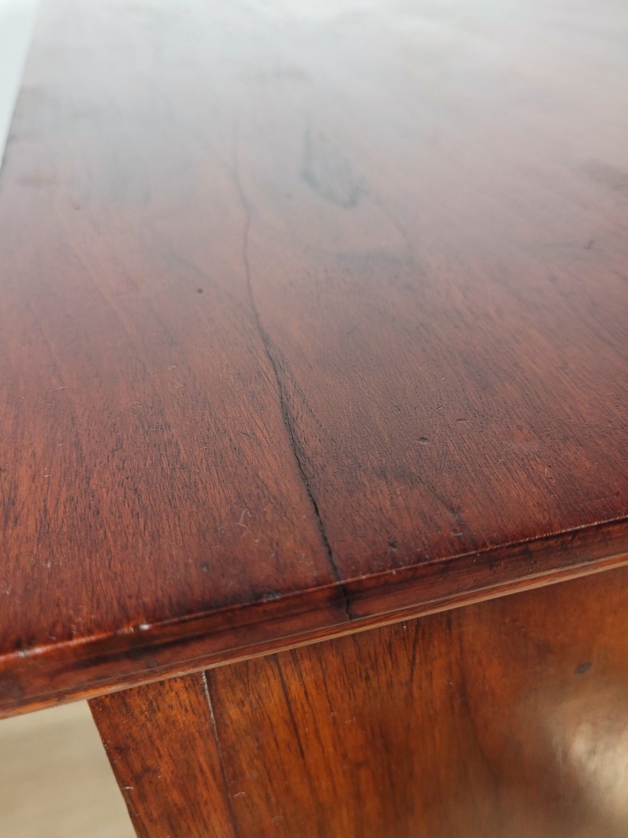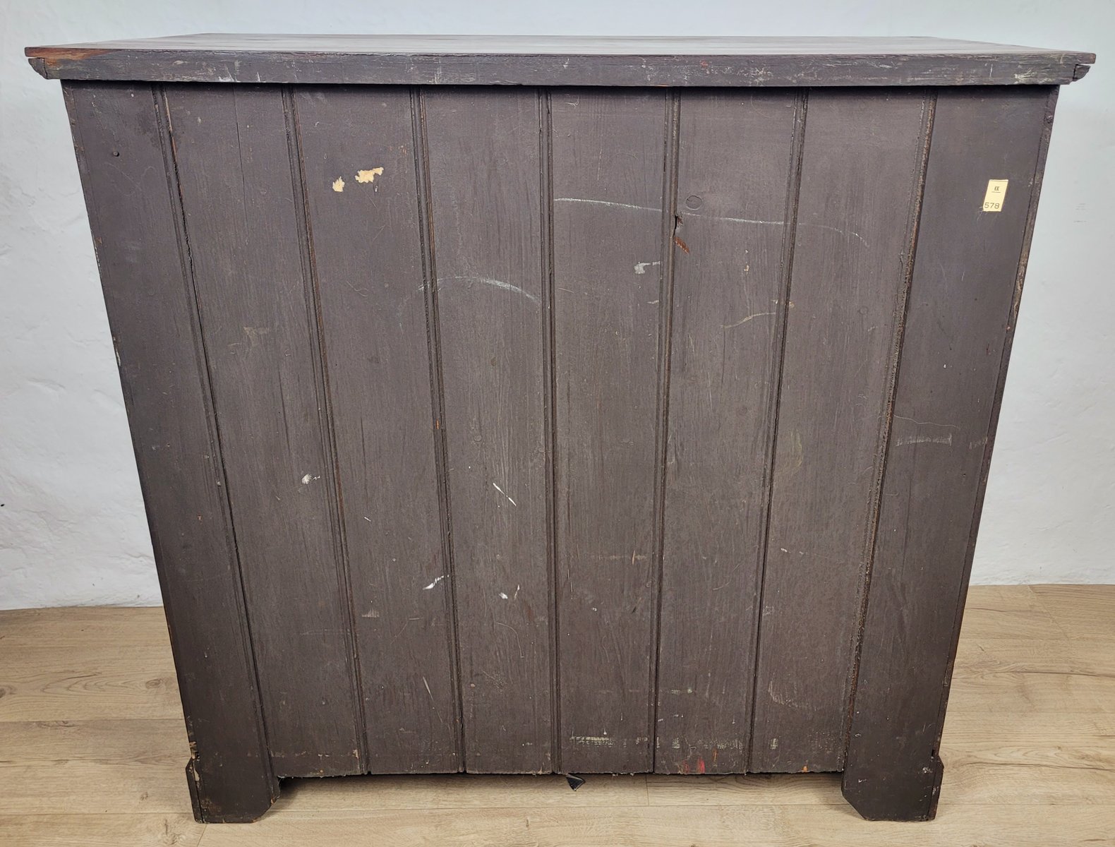 En general, esta cómoda se encuentra en muy buen estado, con signos de uso y desgaste, como es de esperar en un mueble de esta antigüedad (véanse las fotografías). Presenta grietas históricas en la madera de la parte superior, los laterales y la base inferior, acordes con su antigüedad (véanse las fotografías). Hay una pequeña mella en la esquina derecha de la cómoda (véase la fotografía). Medidas aproximadas: