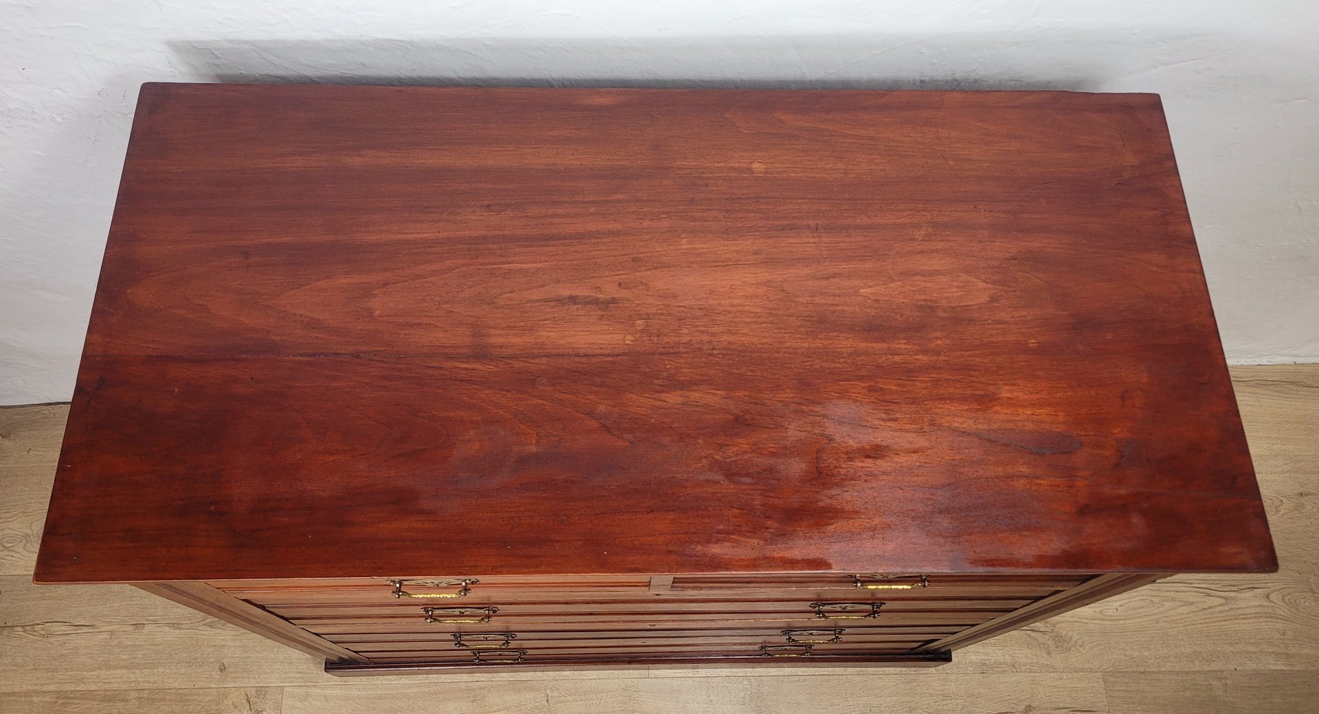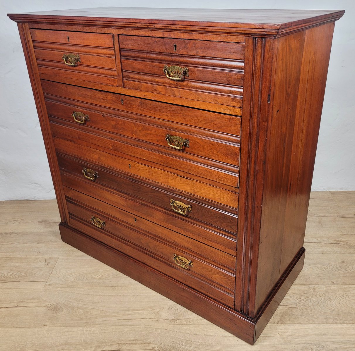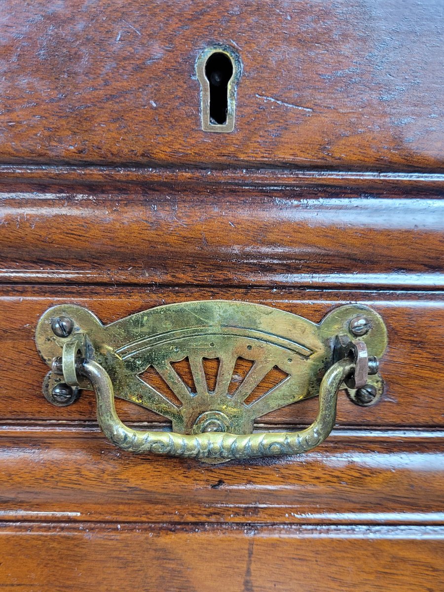 The chest front has a beautiful arrangement of two short over three large graduating drawers, with carving to the front of every drawer. Each drawer has the original striking figured matching brass drop handles to finish.