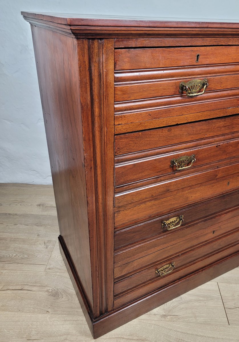 Esta preciosa cómoda de 1910, con maravillosas características de la época eduardiana, realzará el dormitorio o el salón de su hogar. Presenta una rica pátina de nogal en la parte superior rectangular, rematada con un borde inferior tallado. La parte frontal de la cómoda tiene una bonita disposición de dos cajones cortos sobre tres cajones grandes escalonados, con tallas en la parte delantera de cada cajón. Cada cajón tiene los llamativos tiradores originales de latón a juego para rematar. Los cajones tienen llamativas cerraduras, pero, lamentablemente, no hay llave, lo que no afecta en absoluto a la funcionalidad del mueble. La cómoda tiene pilares laterales tallados que resaltan el acabado artesanal eduardiano atemporal. Se erige con orgullo sobre una base sólida y elevada. Se trata de una hermosa cómoda eduardiana que complementaría la decoración de una gran variedad de habitaciones.