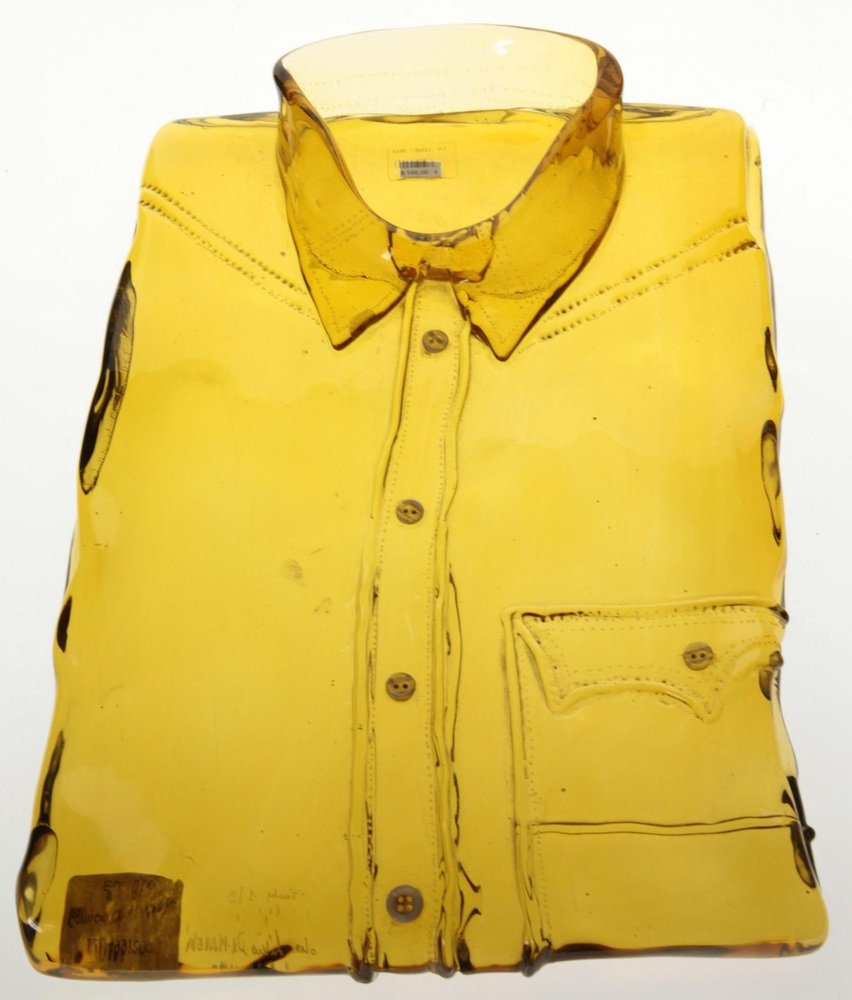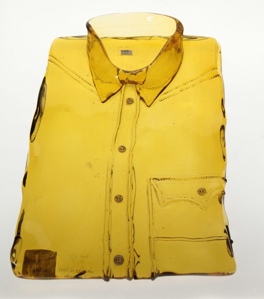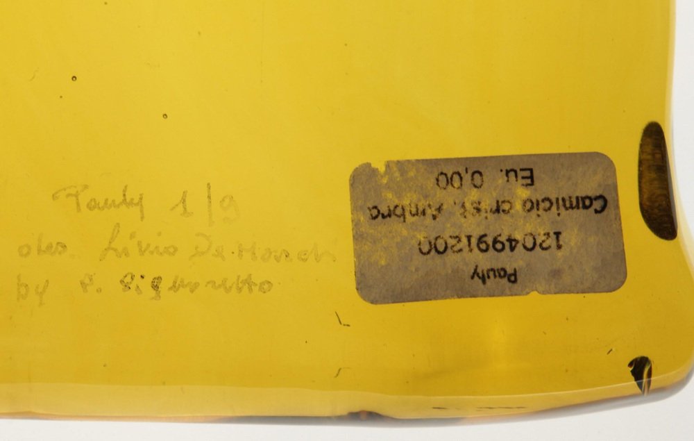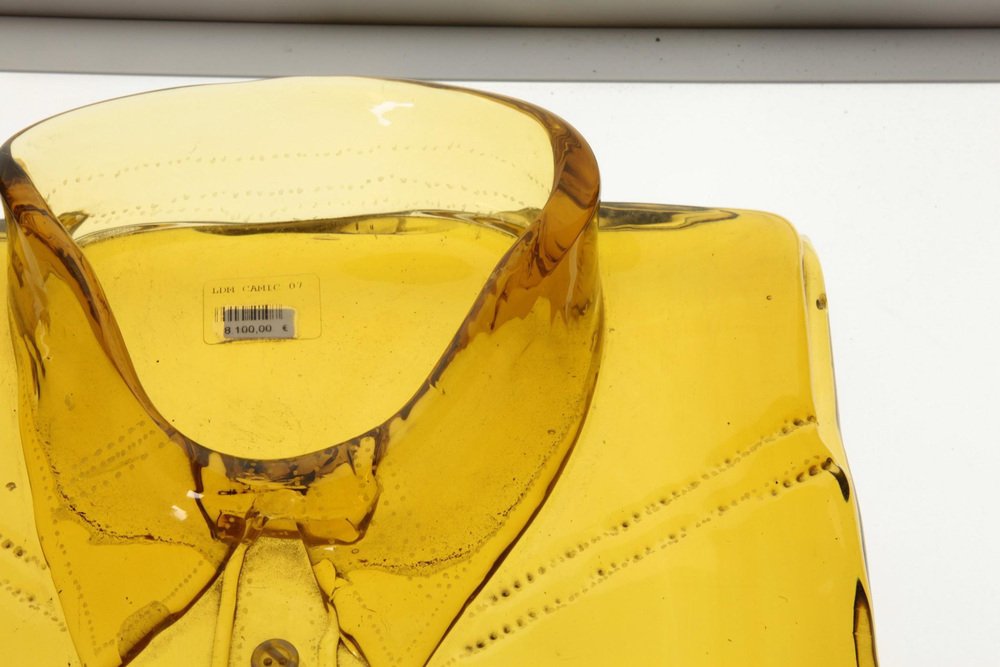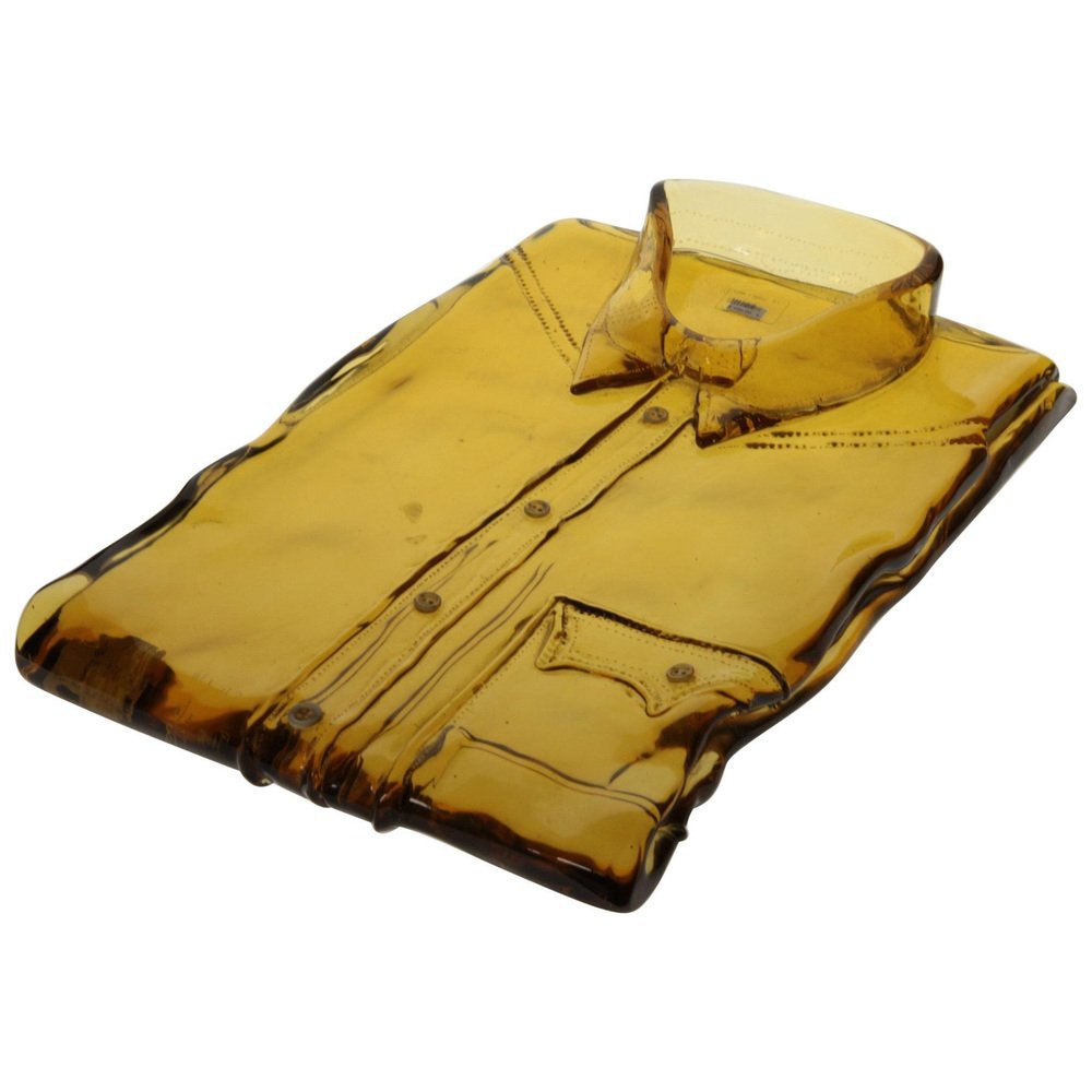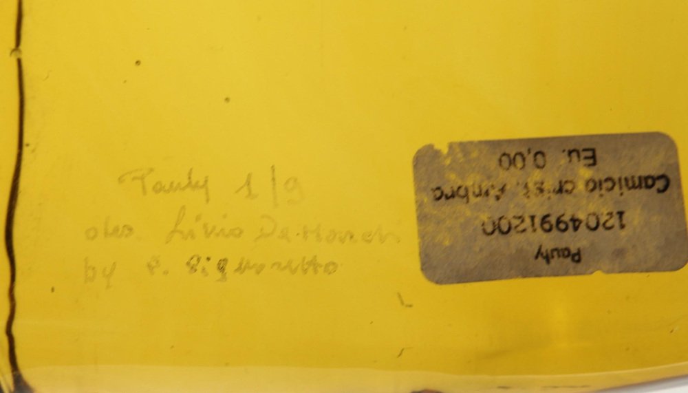 Directamente de la viñeta artística de Pauly en la Plaza de San Marcos. La exposición de Pauly de la traducción de Signoretto de De Marchi se instaló en la Plaza de San Marcos de Venecia, en abril de 2000. Se trata de un famoso diseño en madera de Livio De Marchi, sólo un maestro del vidrio podía aceptar el reto de reproducir su icónico diseño en vidrio, con un resultado tan grandioso. La camisa muestra los velos y todos los detalles naturales. Una increíble colaboración entre artistas de distintos medios, realizada para Pauly. Pauly tenía una tienda en la Plaza de San Marcos, siempre que estaba en Venecia visitaba su tienda. Estaba dividida en dos partes, una clásica con piezas tradicionales de Murano, la parte artística en cambio tenía propuestas emocionantes cada vez. Allí vi esta escultura. Es la número 1/9 y se quedó en la tienda. Algunas fueron traídas a Sofa por la galería de arte Mostly Glass. Intenté captar los detalles. Es una obra maestra. Una pieza de coleccionista, tanto de De Marchi como de Pino Signoretto.