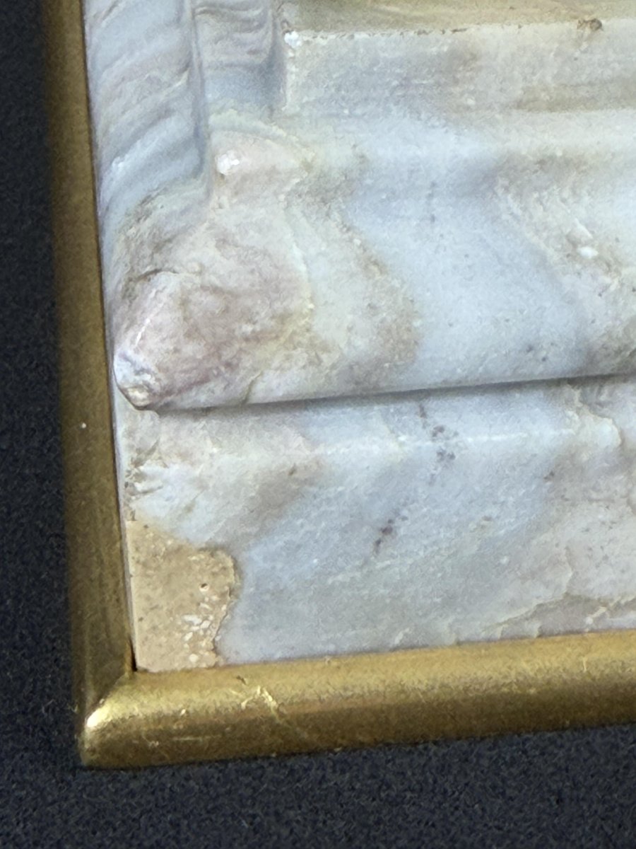 Altura: 39 cm Anchura: 28 cm Estado: Muy buen estado general. Una de las bases de mármol presenta una pequeña mella en la parte posterior. La segunda base tiene una mella que ha sido restaurada profesionalmente. Los elementos de bronce y el dorado están bien conservados, con un ligero desgaste propio de su antigüedad. (Las fotos forman parte del .)