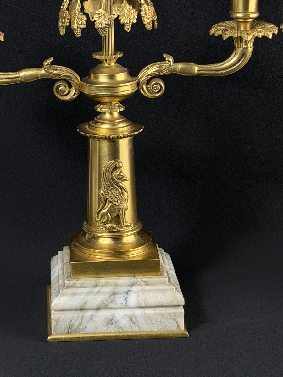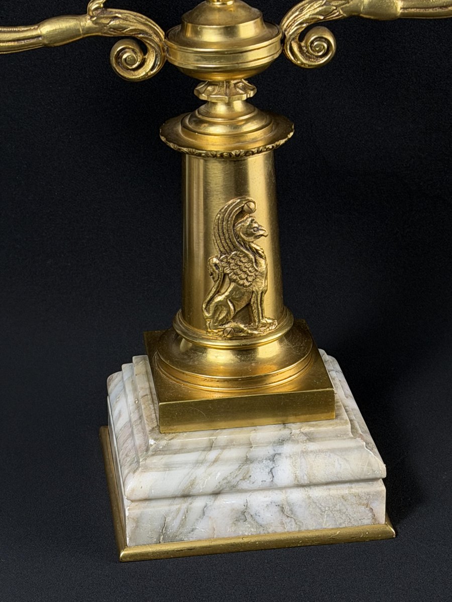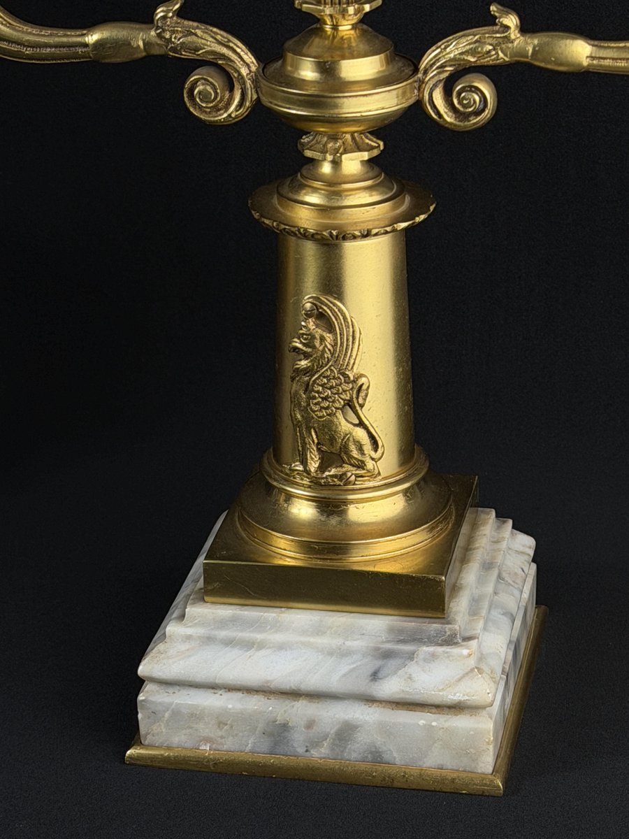 The pieces rest on solid marble bases, providing both visual contrast and structural stability. The warm gilt bronze finish and classical proportions make this pair ideal for a fireplace mantel, console, or formal interior setting.