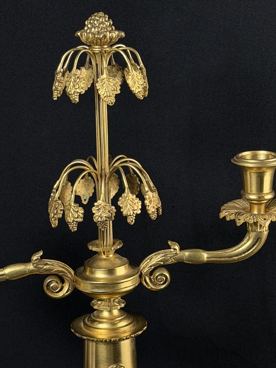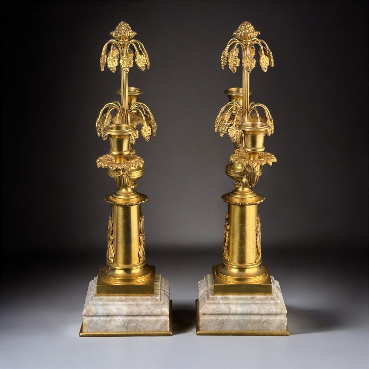 Each candelabrum features a sculptural central column adorned with cascading leaf motifs and a richly detailed floral finial at the top. The curved candle arms are balanced and harmonious, while the column bases are decorated with finely cast figural reliefs.