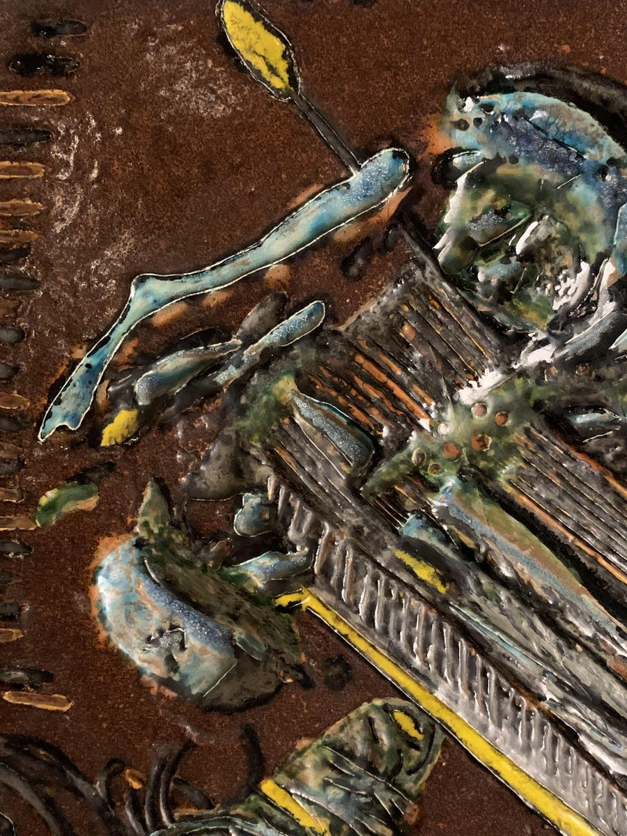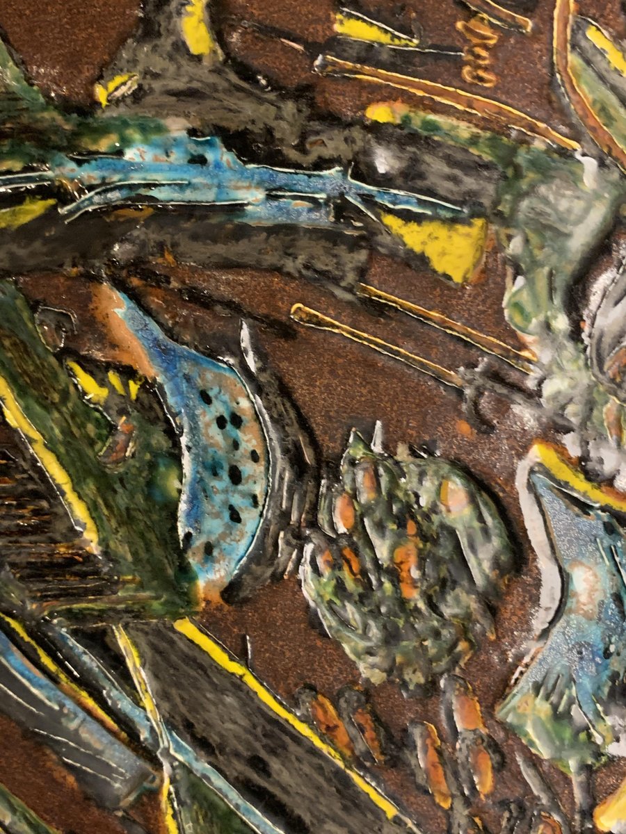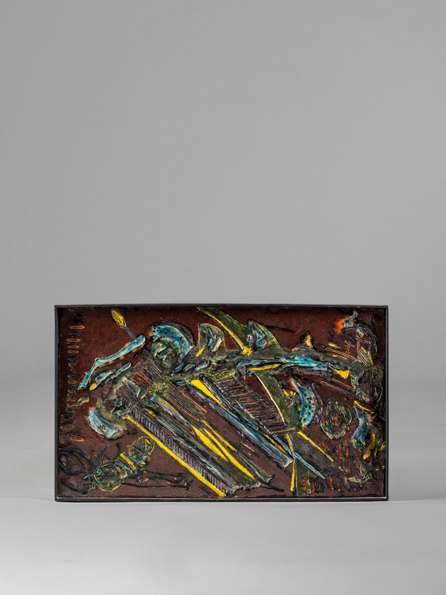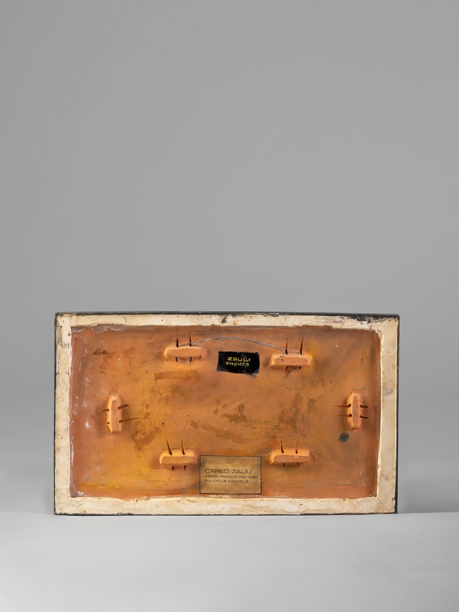Pequeña escultura mural en mayólica policromada de Carlo Zauli. La escultura forma parte de una serie de pequeños paneles creados durante la década de 1950 por Zauli en mayólica vidriada multicolor. Se trata siempre de pequeños rectángulos (que rara vez alcanzan los 50 cm de longitud) de colores vivos y brillantes. A menudo los temas están tomados del mundo de la mitología o de las epopeyas caballerescas. Sin embargo, la representación, creada según estilos gráficos típicos de los años 50, tiende a menudo a dejar de ser legible, en una rarefacción que va de lo figurativo a lo abstracto más puro. El signo gráfico se convierte simplemente en un elemento decorativo, pura geometría, reunión de líneas dentro de espacios vacíos.