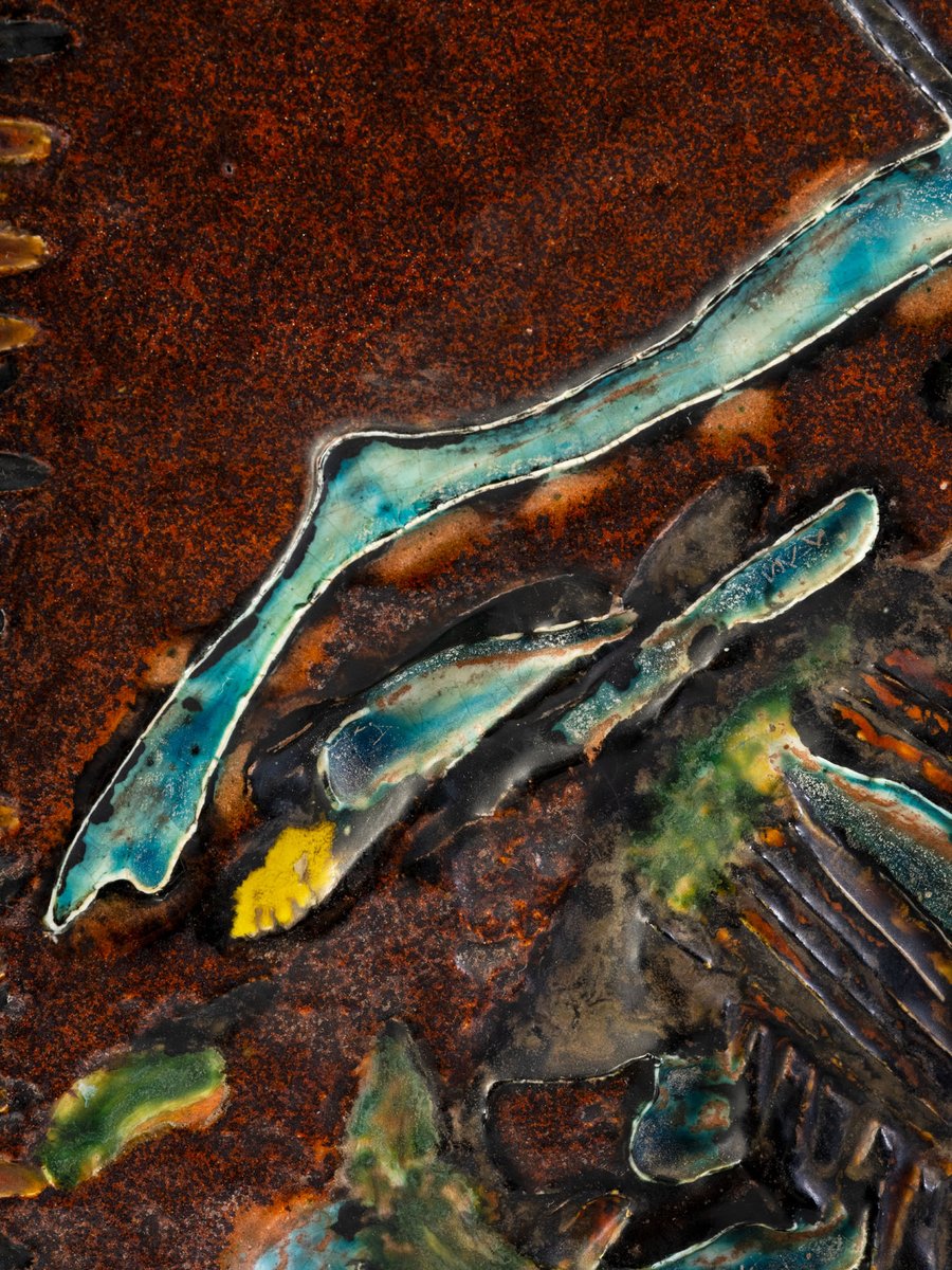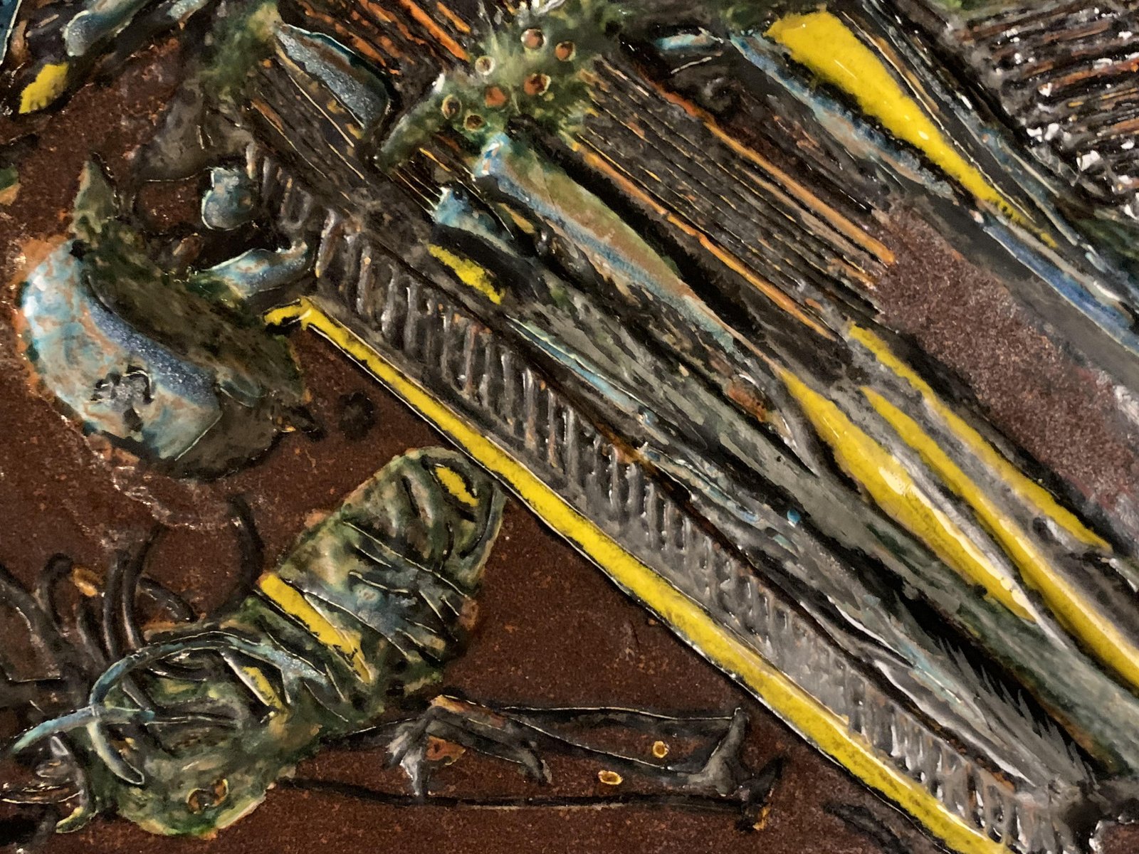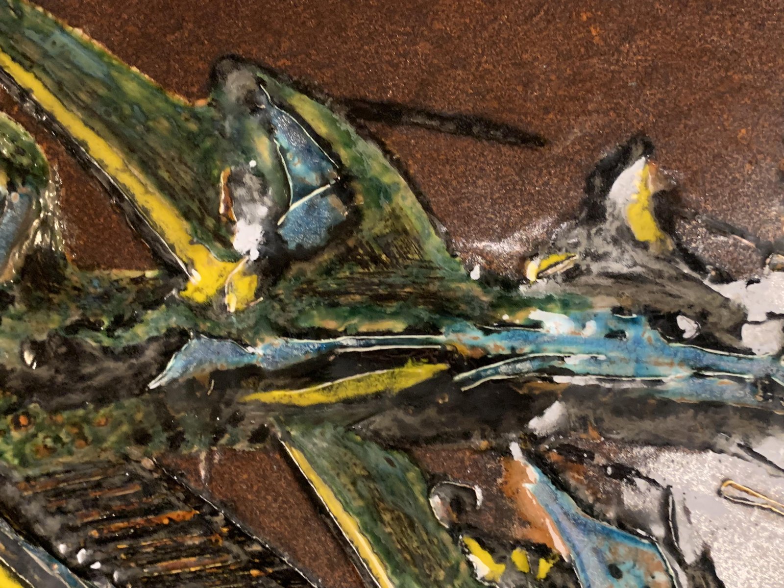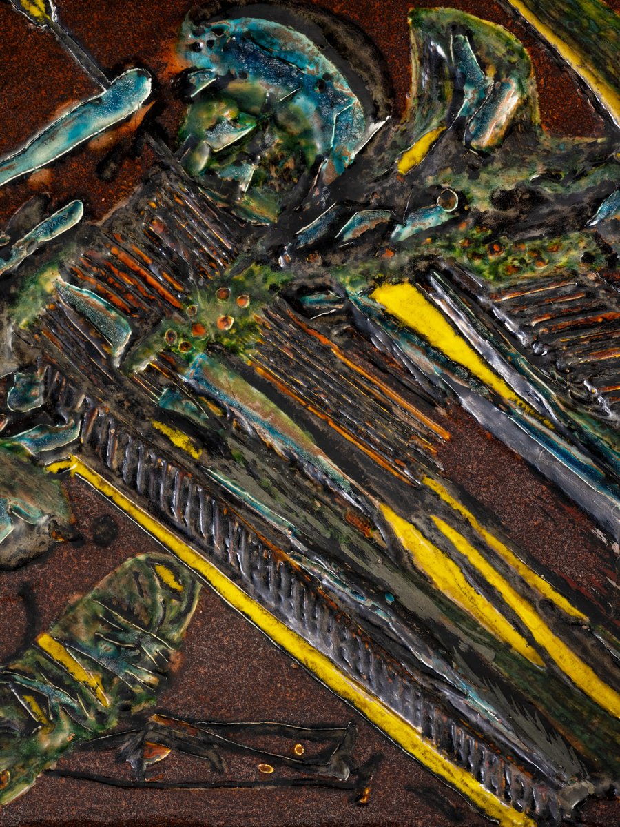 Pequeña escultura mural en mayólica policromada de Carlo Zauli. La escultura forma parte de una serie de pequeños paneles creados durante la década de 1950 por Zauli en mayólica vidriada multicolor. Se trata siempre de pequeños rectángulos (que rara vez alcanzan los 50 cm de longitud) de colores vivos y brillantes. A menudo los temas están tomados del mundo de la mitología o de las epopeyas caballerescas. Sin embargo, la representación, creada según estilos gráficos típicos de los años 50, tiende a menudo a dejar de ser legible, en una rarefacción que va de lo figurativo a lo abstracto más puro. El signo gráfico se convierte simplemente en un elemento decorativo, pura geometría, reunión de líneas dentro de espacios vacíos.