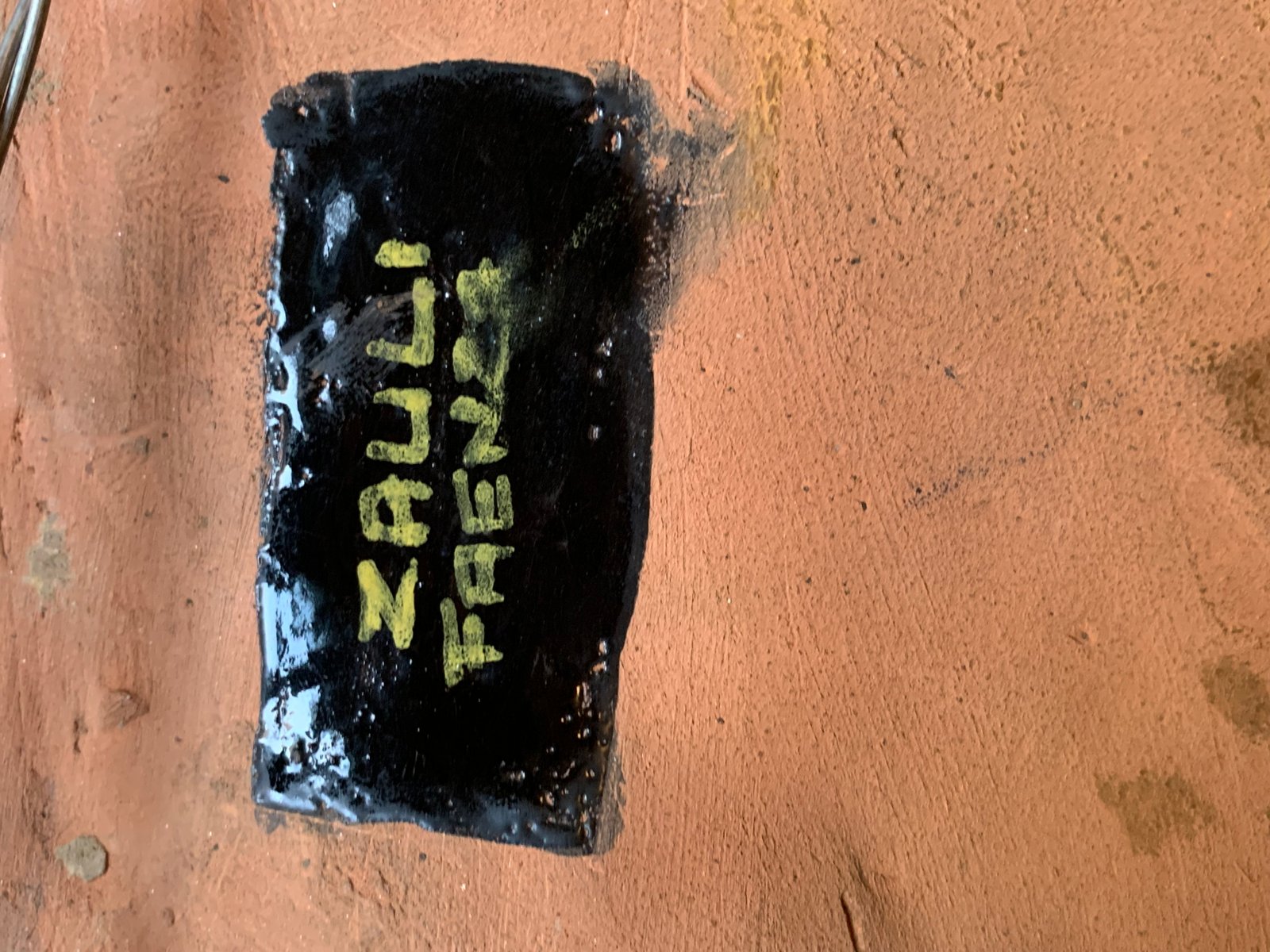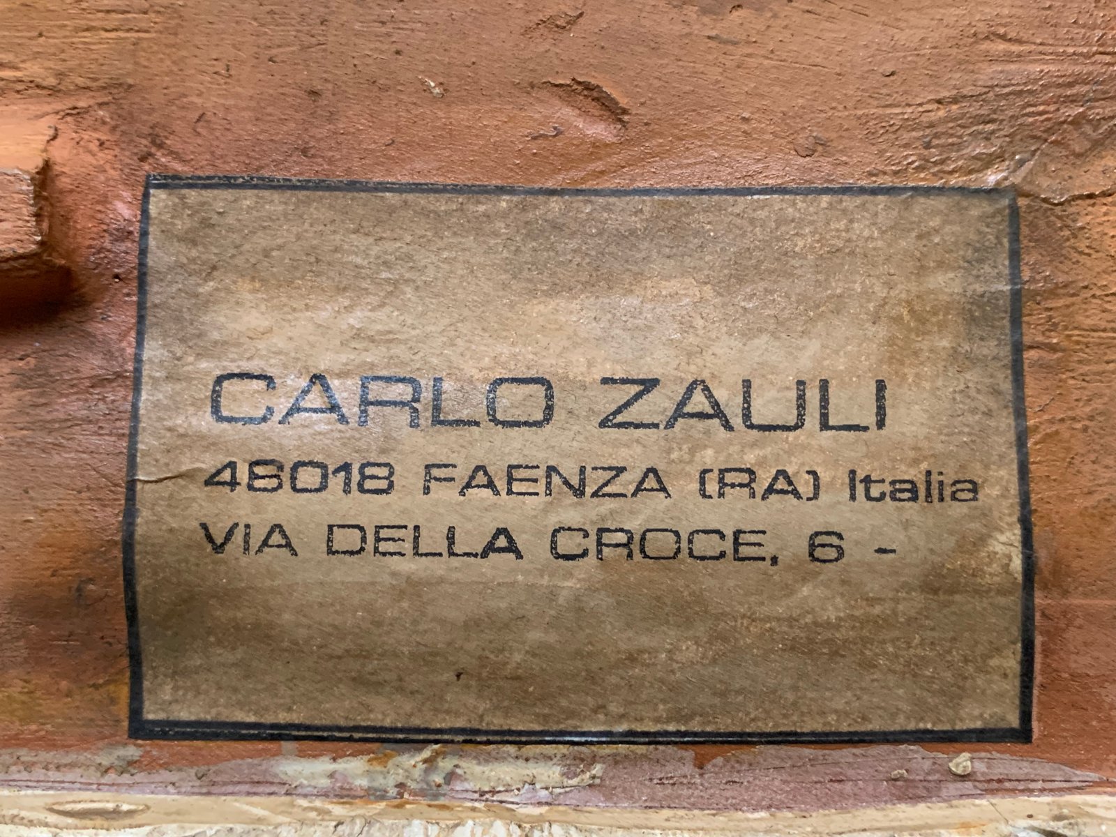 En el reverso hay una firma sobre una pequeña base de mayólica negra, que aún no es la firma estilizada de Zauli de años posteriores, así como una pequeña pieza que contiene la dirección, Via della Croce, 6 Faenza.