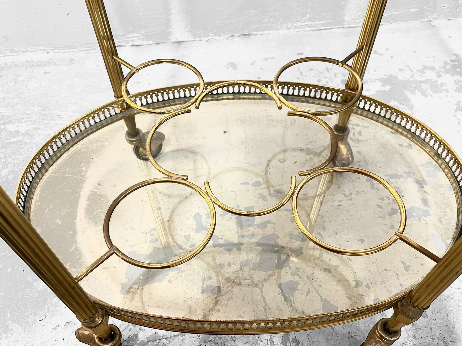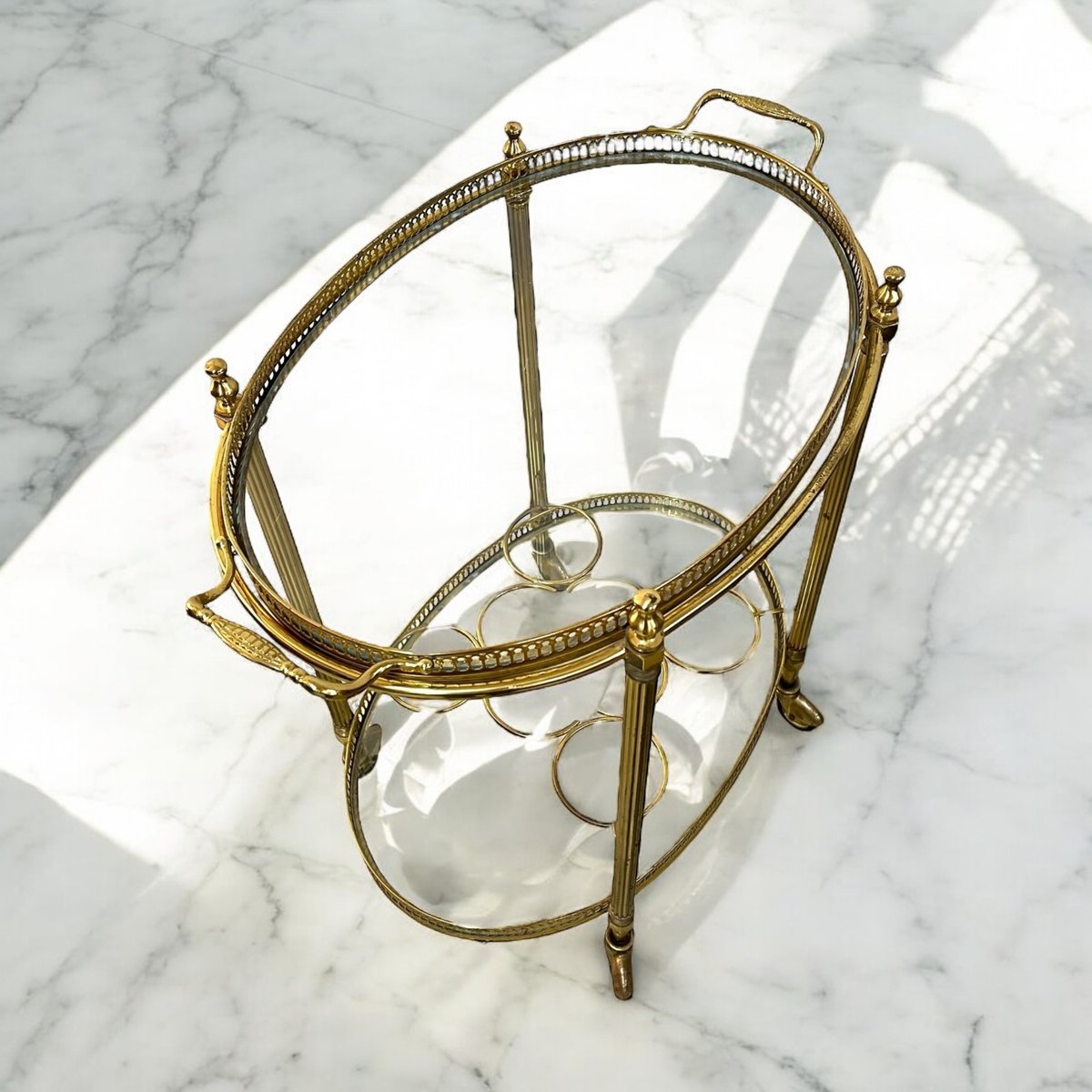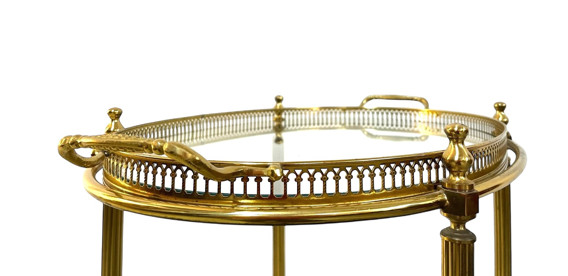 On the heels of such collaborations, Baguès continued in the interwar period to expand into the international consciousness and market, culminating in the establishment of retail branches in New York, Cairo, London, Brussels, and Rome. The atelier experienced a brief hiccup amid the Great Depression, passing into the hands of bankers, before Victor Baguès’s son, Jean-Pierre, repurchased the company in 1957 and revived its collection with new work. Standouts from this later oeuvre include the Perroquet gilt-metal sconces with cut crystal elements; the Imitation Bamboo Coffee Table; and a Maison Charles-designed metal floor lamp—all designed ca. 1960s.