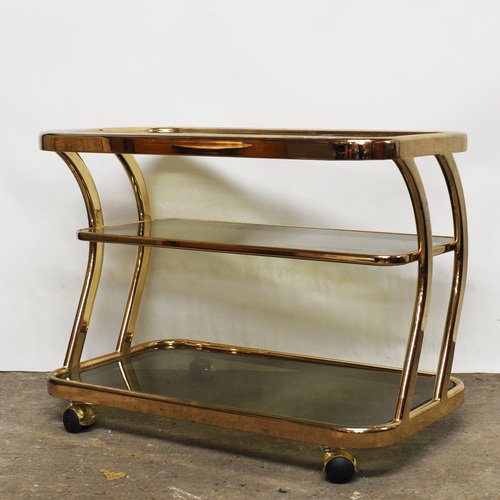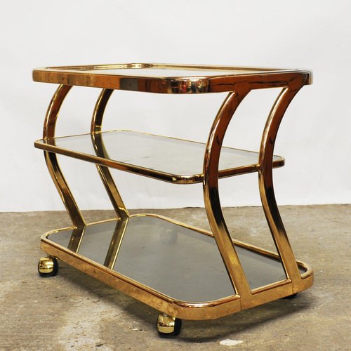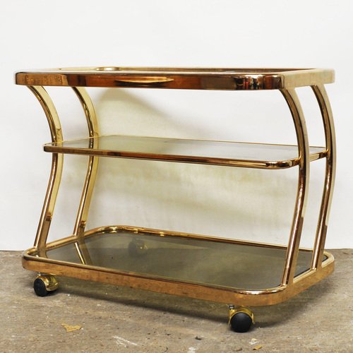 Carrito de bar vintage de latón y vidrio ahumado atribuido a Morex, Italia, años 70