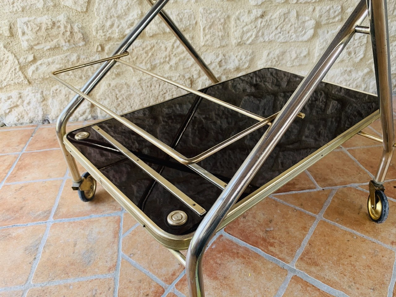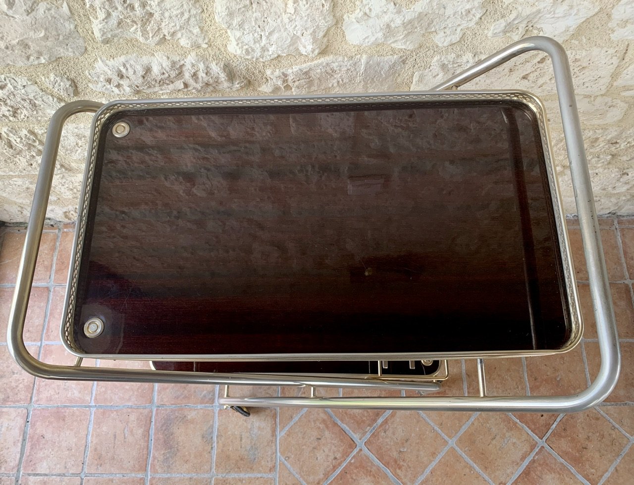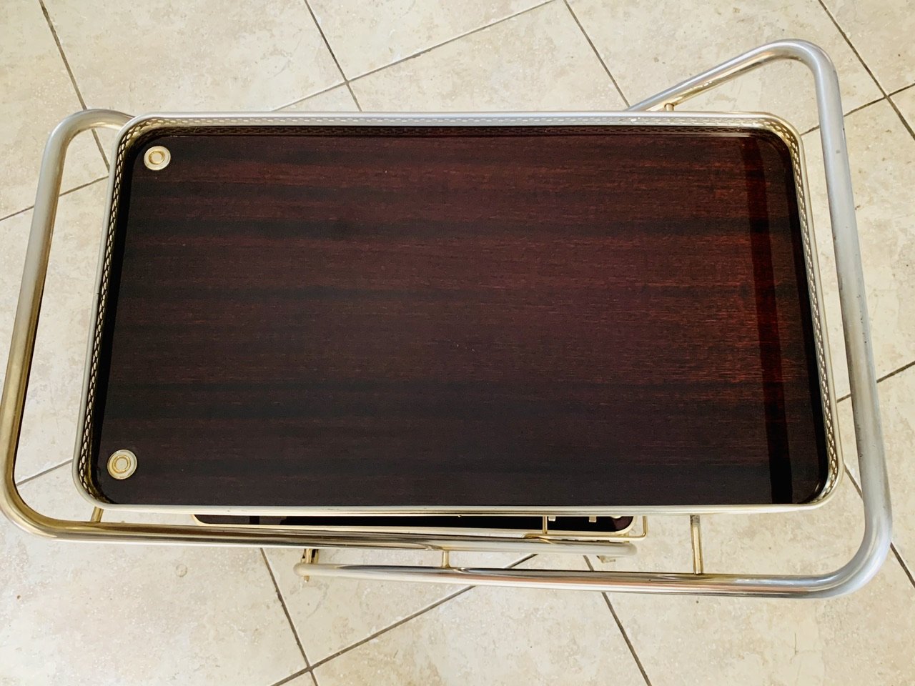The overall patina, also has light signs of age and previous use consistent with time, but remains shiny and makes the cart really pop, in contrast with the darker, warm brown colors of the formica trays (see photos.)