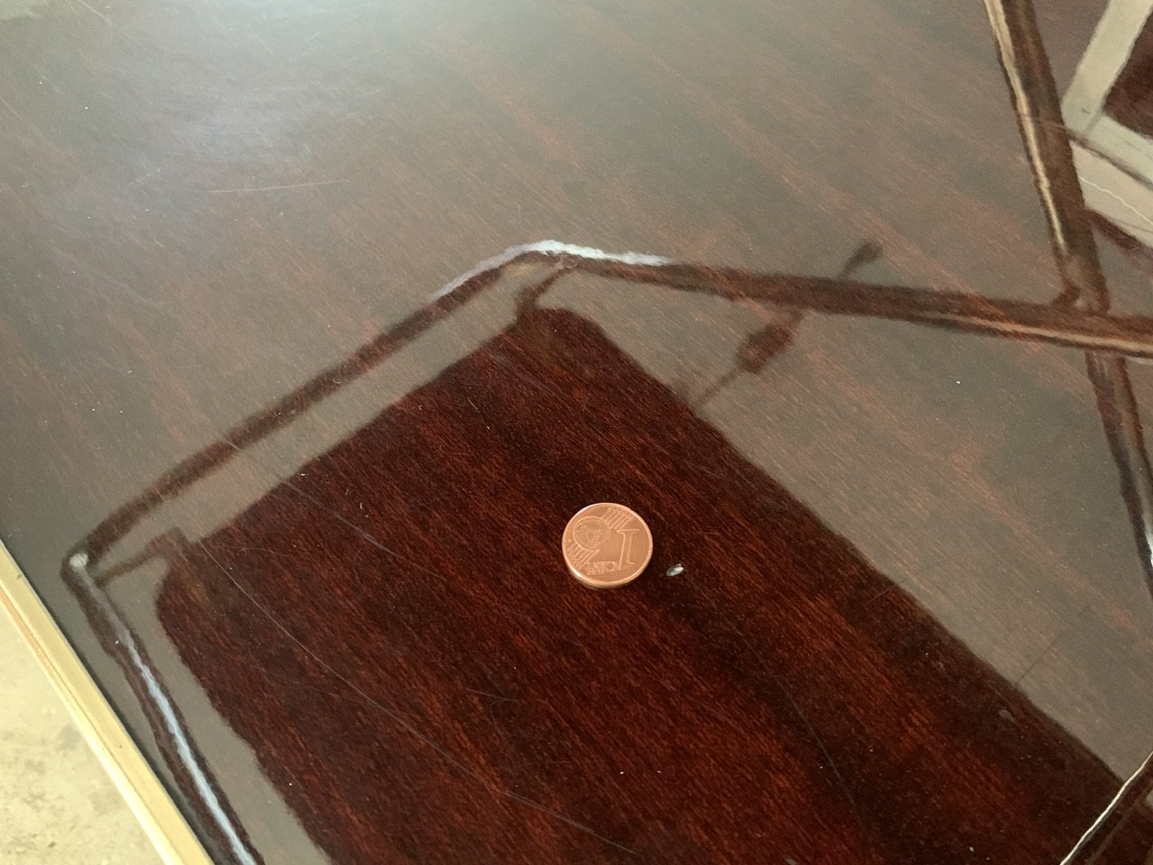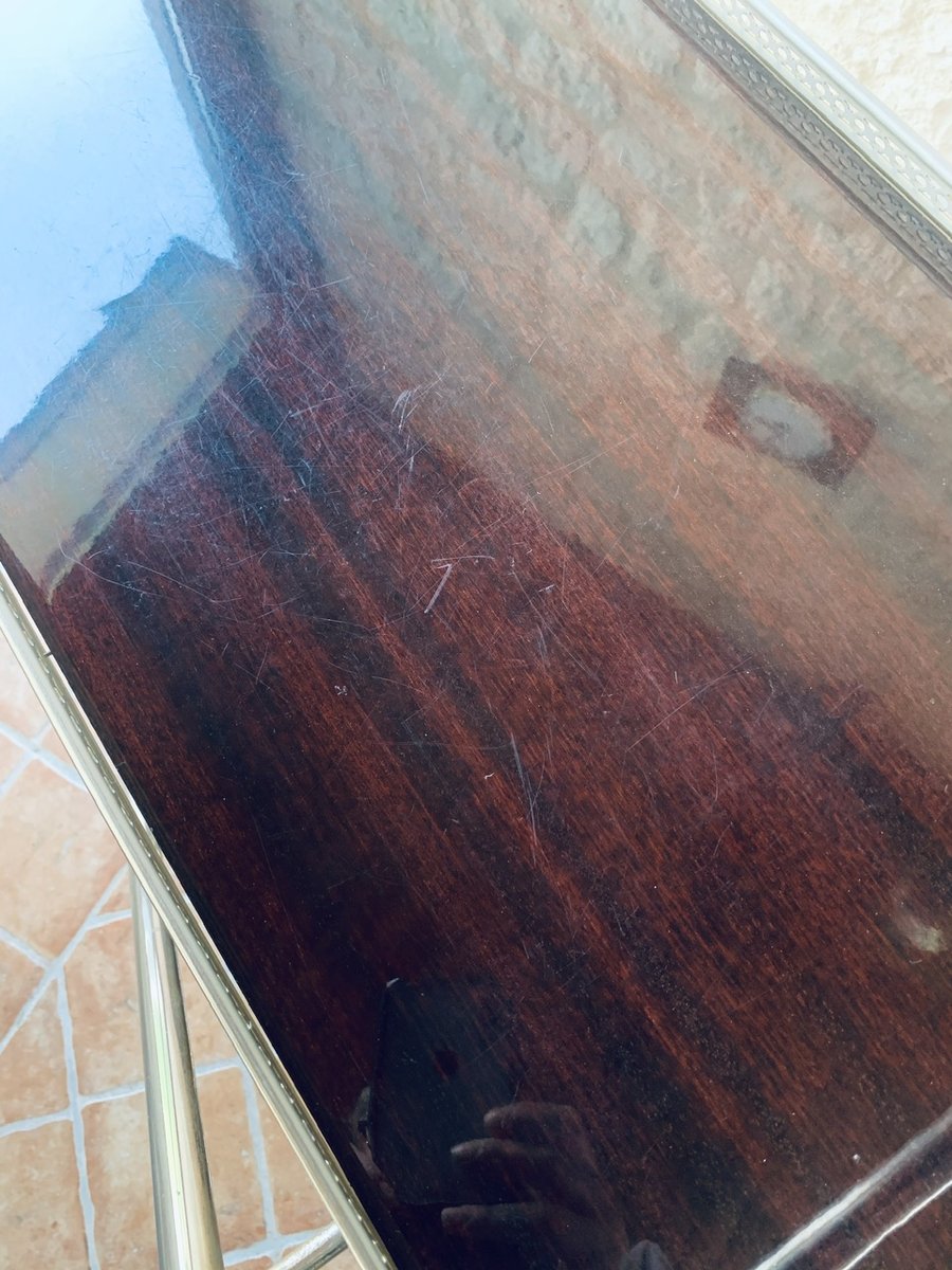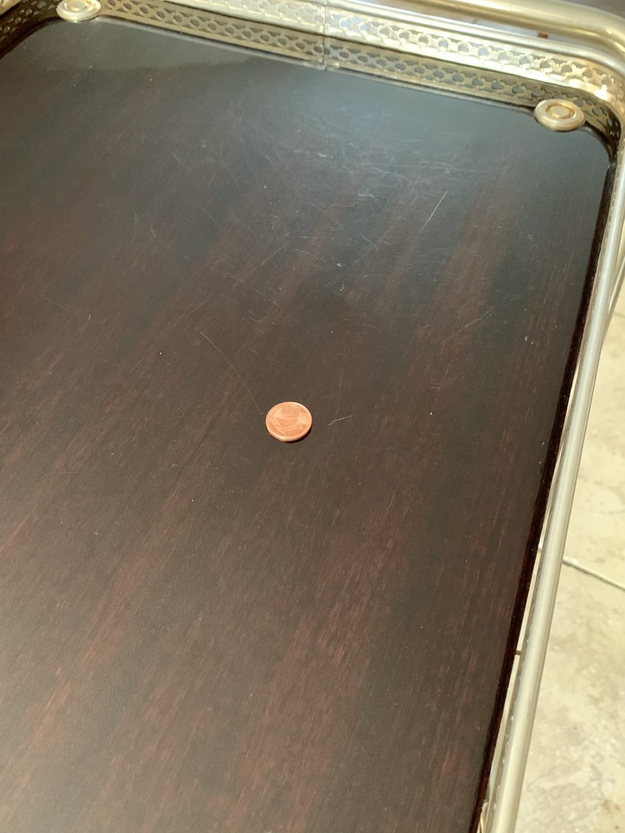 The overall patina, also has light signs of age and previous use consistent with time, but remains shiny and makes the cart really pop, in contrast with the darker, warm brown colors of the formica trays (see photos.)