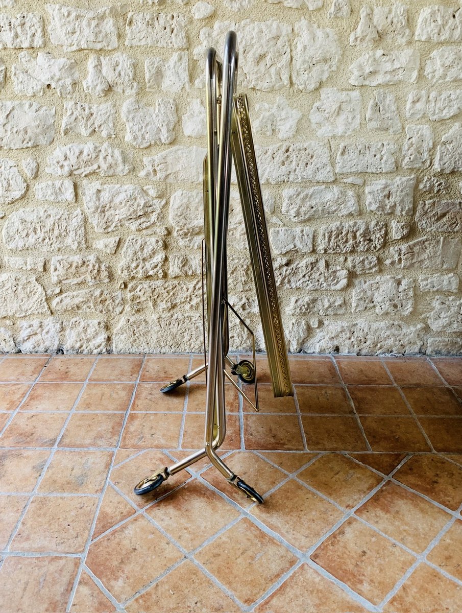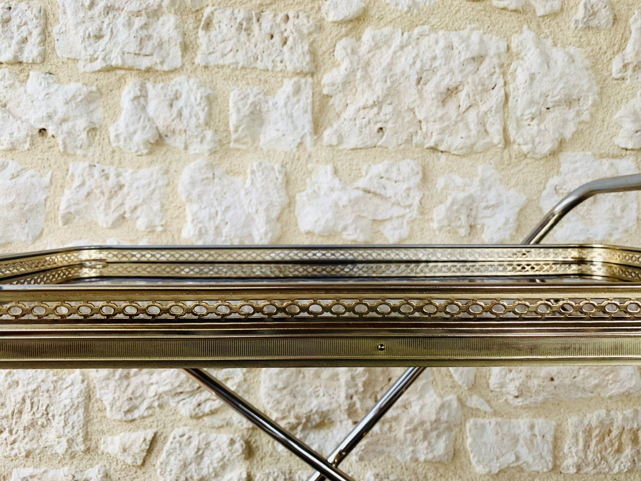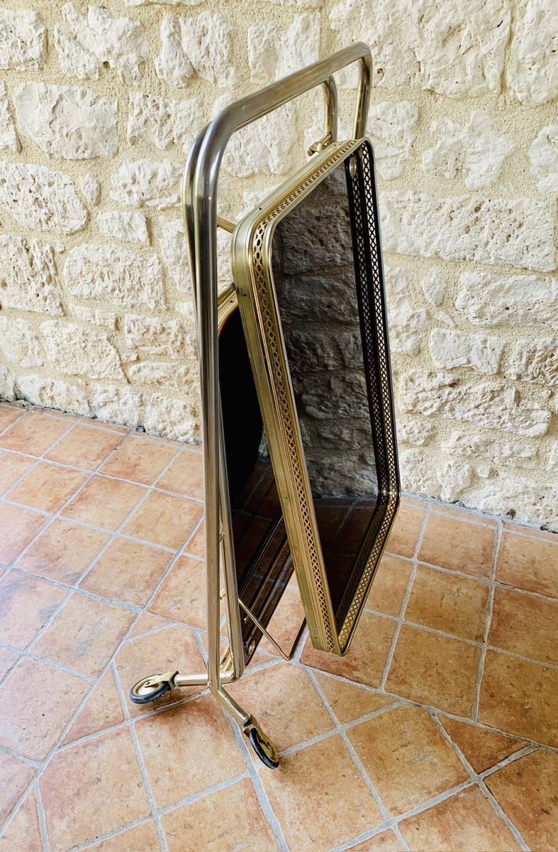 Tanto las bandejas superiores como las inferiores tienen una bonita pátina del tiempo en los bordes de latón dorado pálido. La bandeja superior también tiene una decoración adicional de latón dorado por encima del borde, que permite colocar vasos o cualquier otra cosa que se desee. La bandeja inferior tiene una barra que se levanta y baja, así como dos tiras de latón para colocar y sujetar las botellas. Tanto la bandeja superior como la inferior tienen 2 piezas decorativas circulares de latón dorado, que añaden un bonito toque de contraste al efecto general del diseño (véanse las fotos)