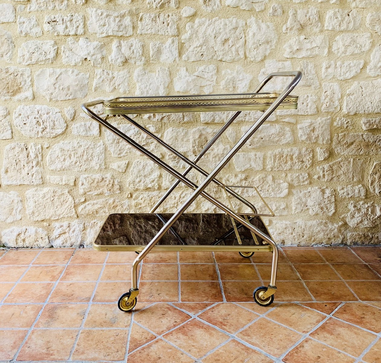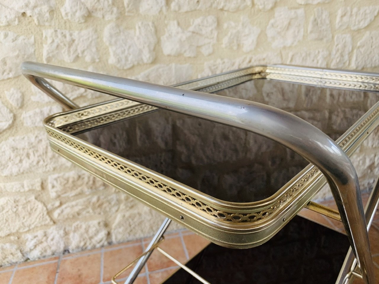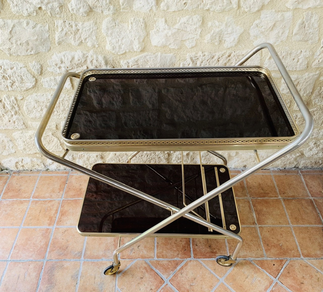 Tanto las bandejas superiores como las inferiores tienen una bonita pátina del tiempo en los bordes de latón dorado pálido. La bandeja superior también tiene una decoración adicional de latón dorado por encima del borde, que permite colocar vasos o cualquier otra cosa que se desee. La bandeja inferior tiene una barra que se levanta y baja, así como dos tiras de latón para colocar y sujetar las botellas. Tanto la bandeja superior como la inferior tienen 2 piezas decorativas circulares de latón dorado, que añaden un bonito toque de contraste al efecto general del diseño (véanse las fotos)