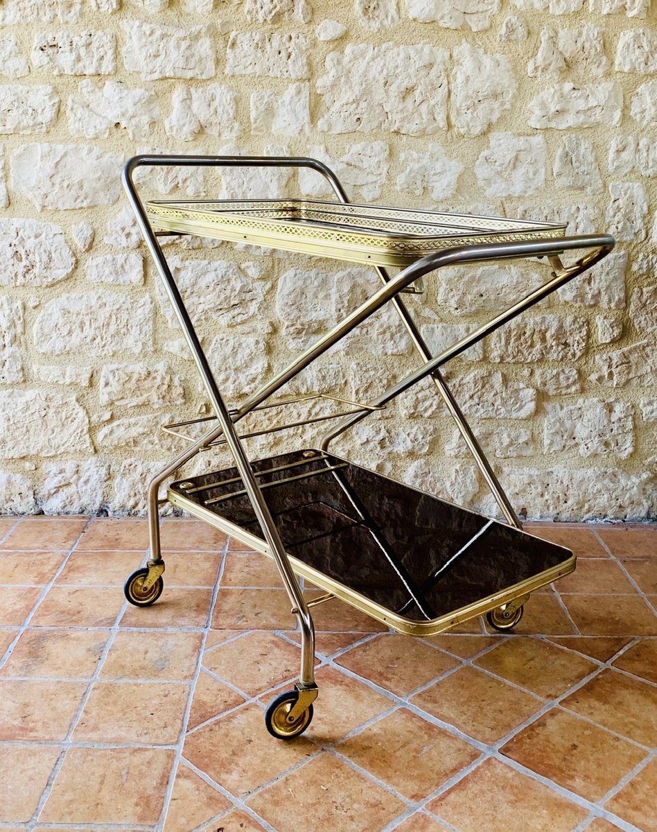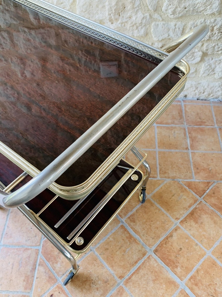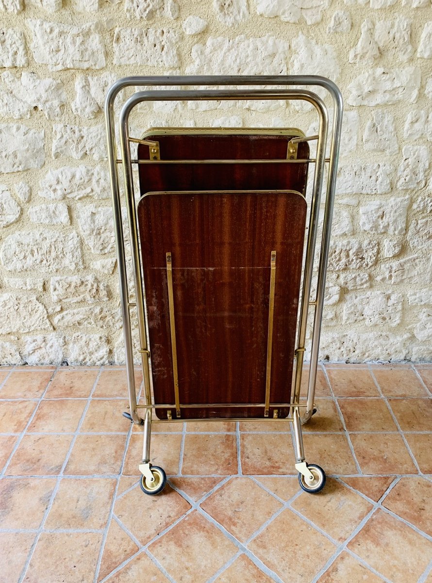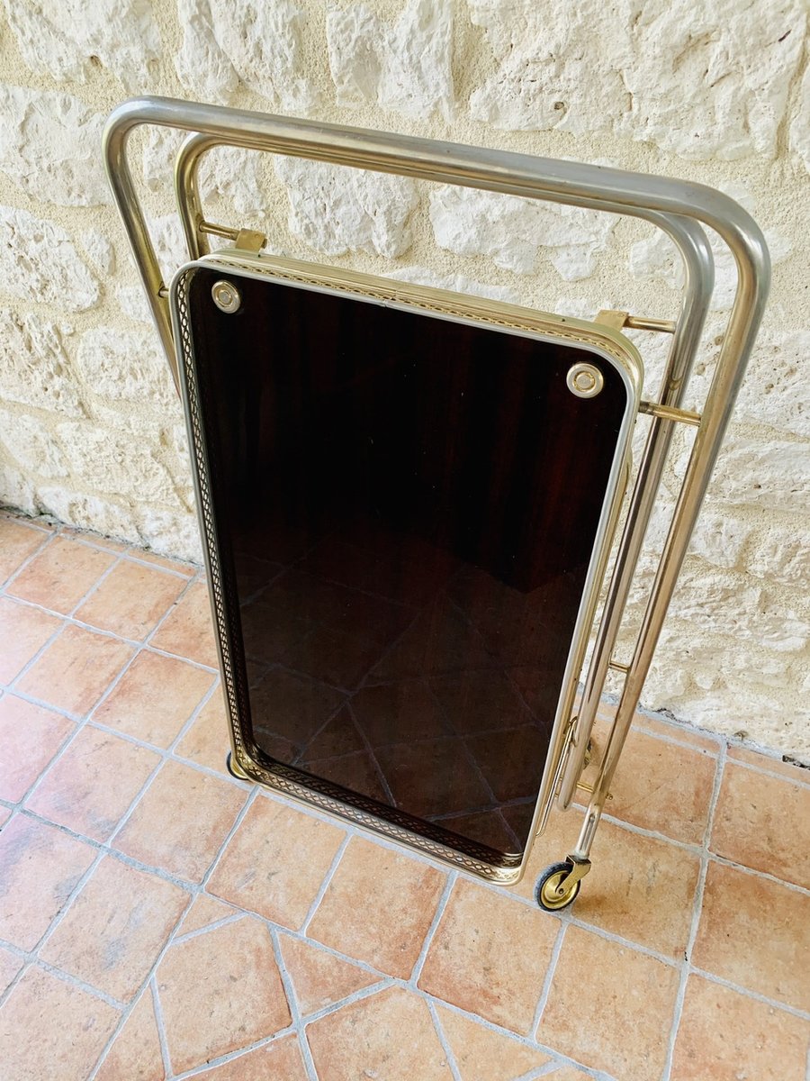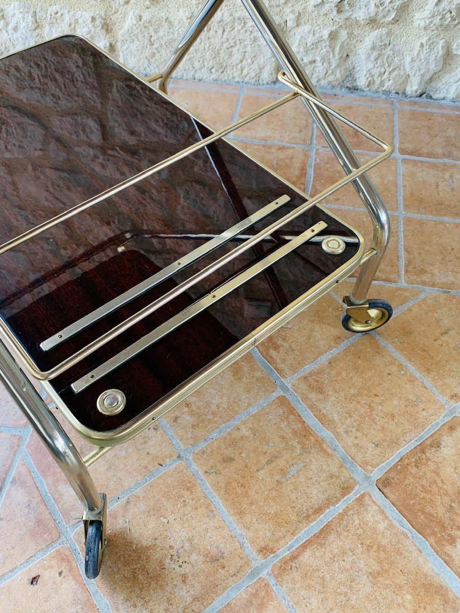 Precioso carro/bar de mediados de siglo, de época, de Francia, con ruedas multidireccionales, con dos bandejas de formica, que tienen un efecto de ''palisandro de imitación'' con un acabado brillante, bordes de latón, decoración dorada y una barra que se levanta hacia arriba y hacia abajo para sujetar botellas, de la década de 1960.