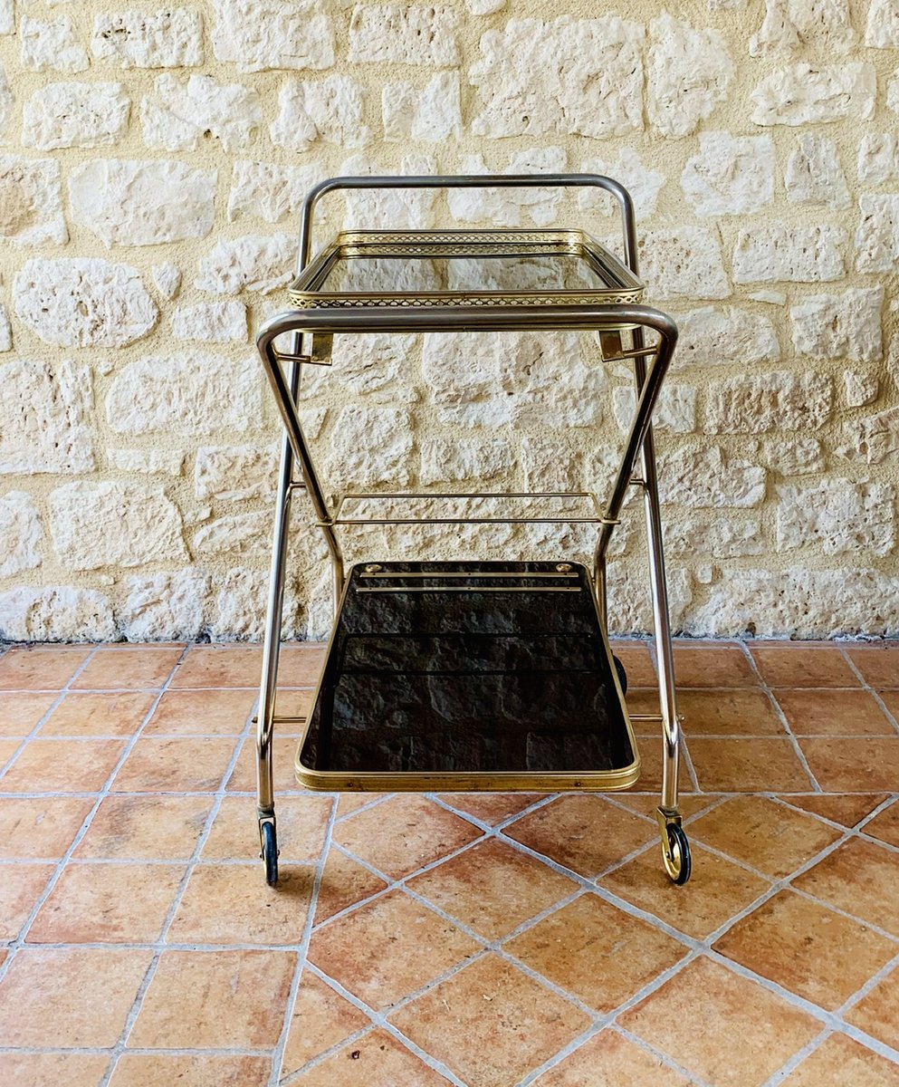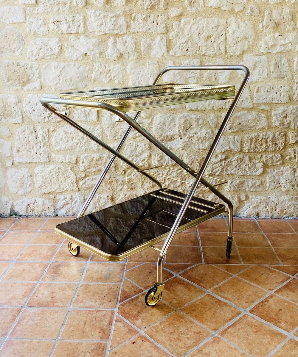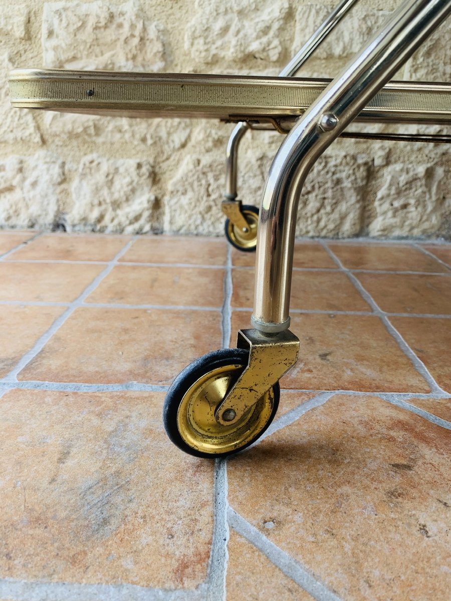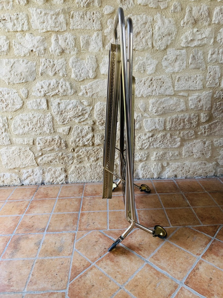 Precioso carro/bar de mediados de siglo, de época, de Francia, con ruedas multidireccionales, con dos bandejas de formica, que tienen un efecto de ''palisandro de imitación'' con un acabado brillante, bordes de latón, decoración dorada y una barra que se levanta hacia arriba y hacia abajo para sujetar botellas, de la década de 1960.