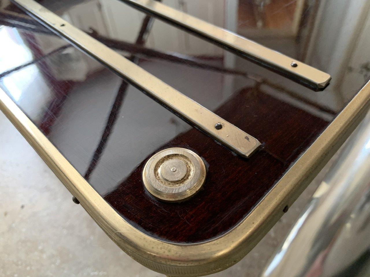 Both the top and bottom trays have a nice patina of time on the pale-gold, brass edging. The top tray also has some additional, gilded brass décor above the edging, which makes it convenient to place glasses, or whatever else one wishes. The bottom tray has a bar that lifts up and down, as well as two strips of brass, so one can place, then secure bottles. Both the top and bottom trays have 2, circular, gold-colored brass pieces of decor, that add a nice touch of contrast to the overall effect of the design (see photos.)