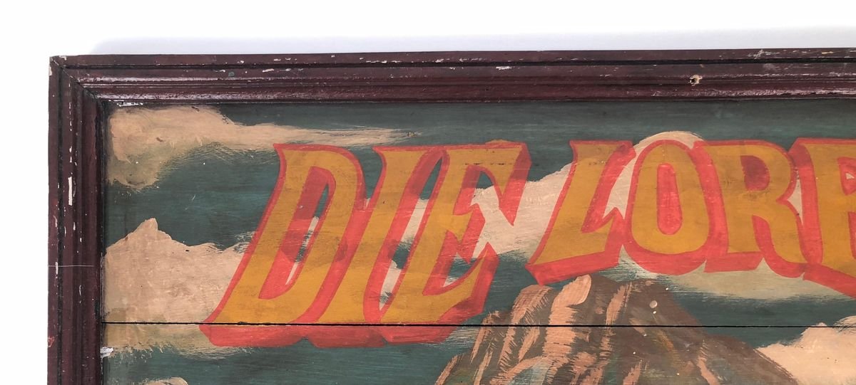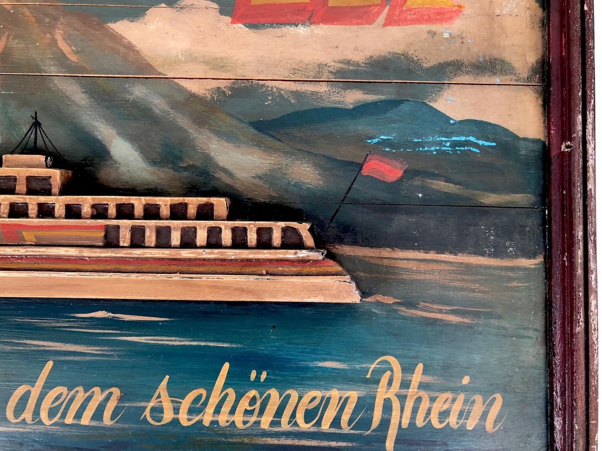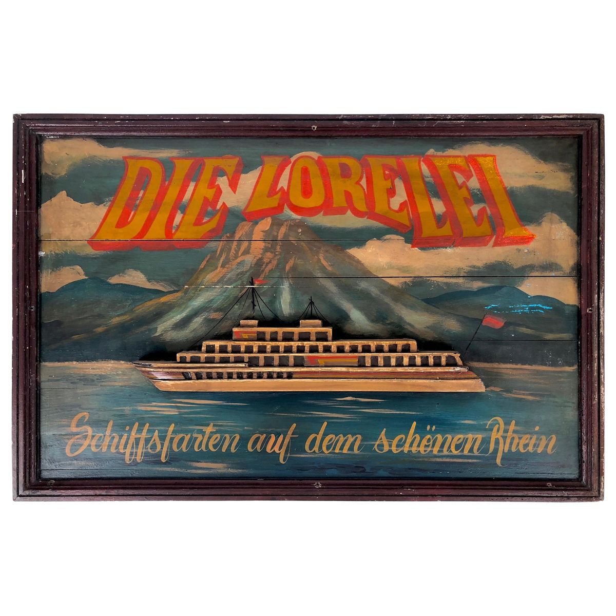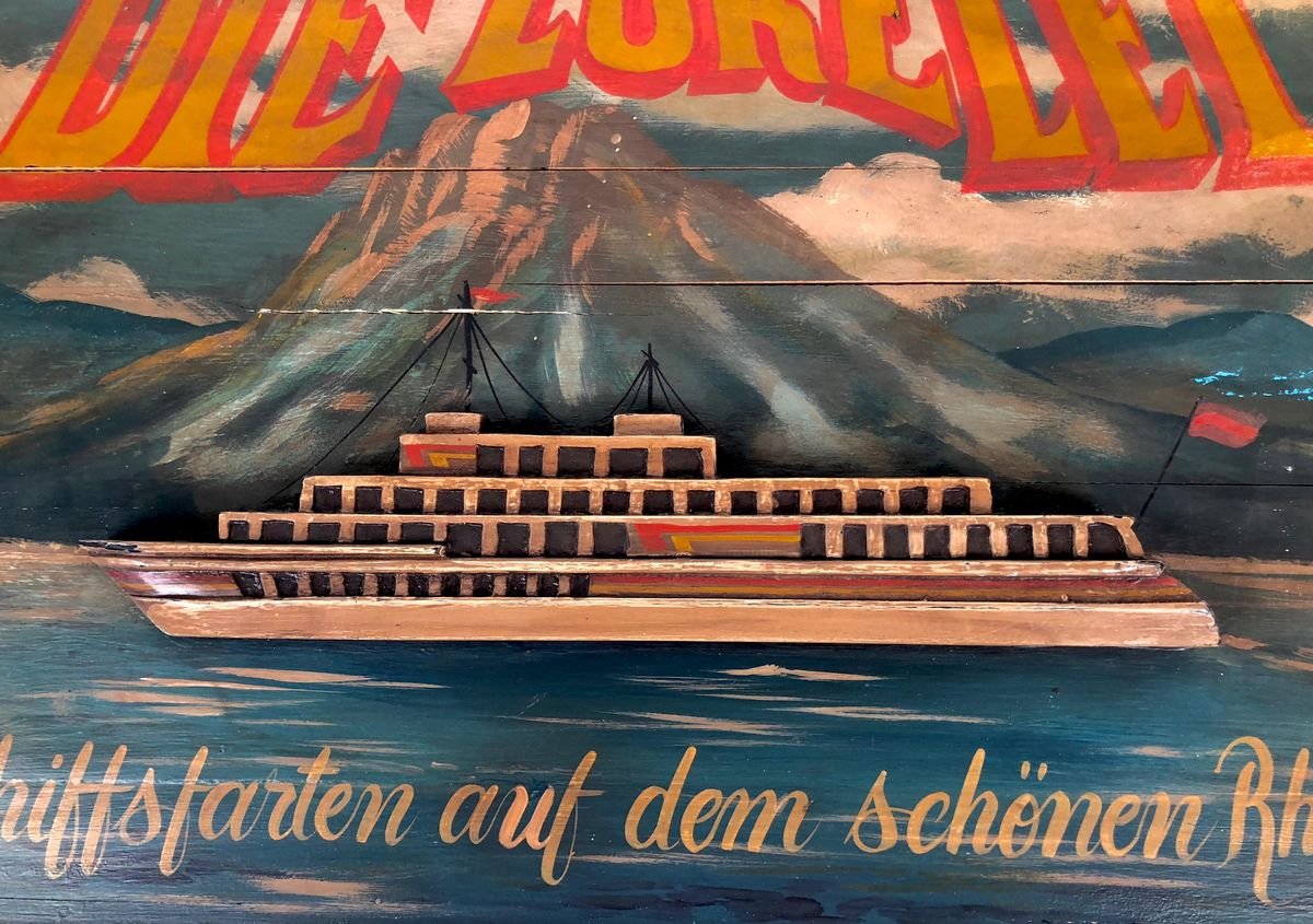 Cruising on a riverboat, on the Rhein, especially the Mittel Rhein, is a popular day time excursion trip in Germany. The famous Lorelei Rock being a popular destination. The Rock, was made famous from a poem, written by Heinrich Heine, The Lorelei. On this sign we can see a three dimensional river boat cruising past the Lorelei Rock. The sign is hand painted, on wood. The boat is a wooden profile attached to the wood. Hand made signs such as this one are quite rare. I have included a translation of the poem by Peter Shor.