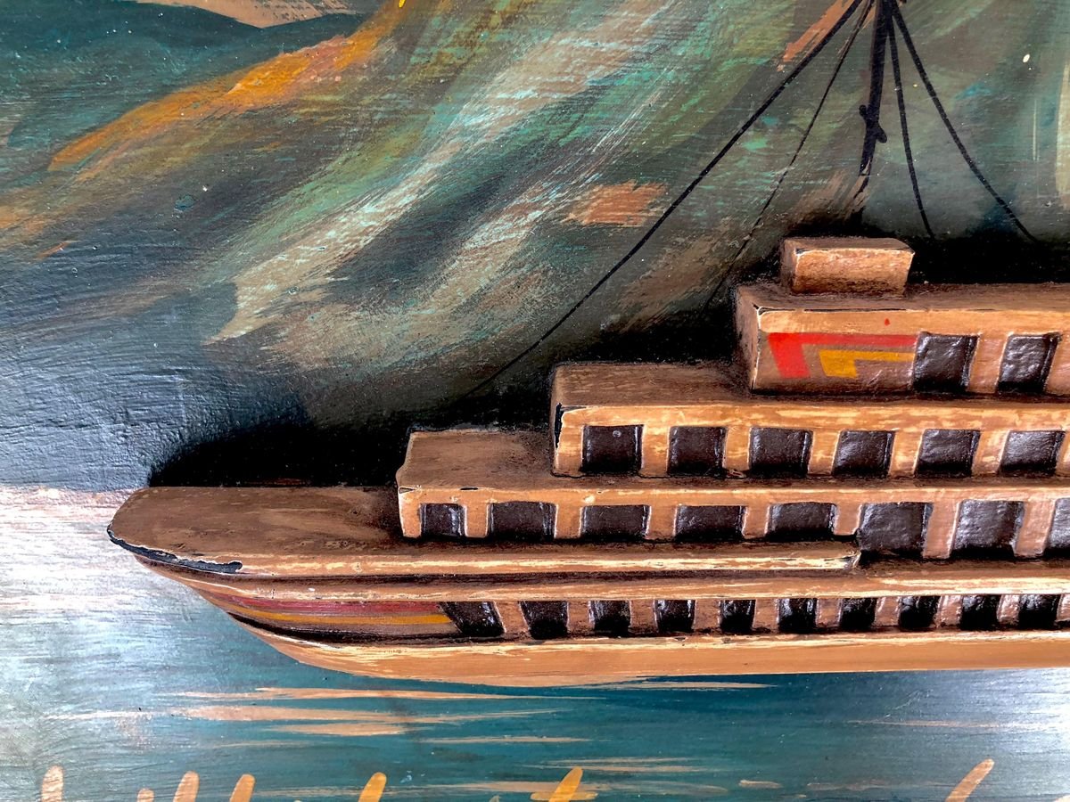 Navegar en un barco por el Rhein, especialmente por el Mittel Rhein, es una popular excursión de un día en Alemania. La famosa roca de Lorelei es un destino popular. La roca se hizo famosa gracias a un poema escrito por Heinrich Heine, El Lorelei. En este cartel podemos ver un barco fluvial tridimensional que pasa por delante de la roca Lorelei. El cartel está pintado a mano, sobre madera. El barco es un perfil de madera pegado a la madera. Los carteles hechos a mano como éste son bastante raros. He incluido una traducción del poema de Peter Shor.