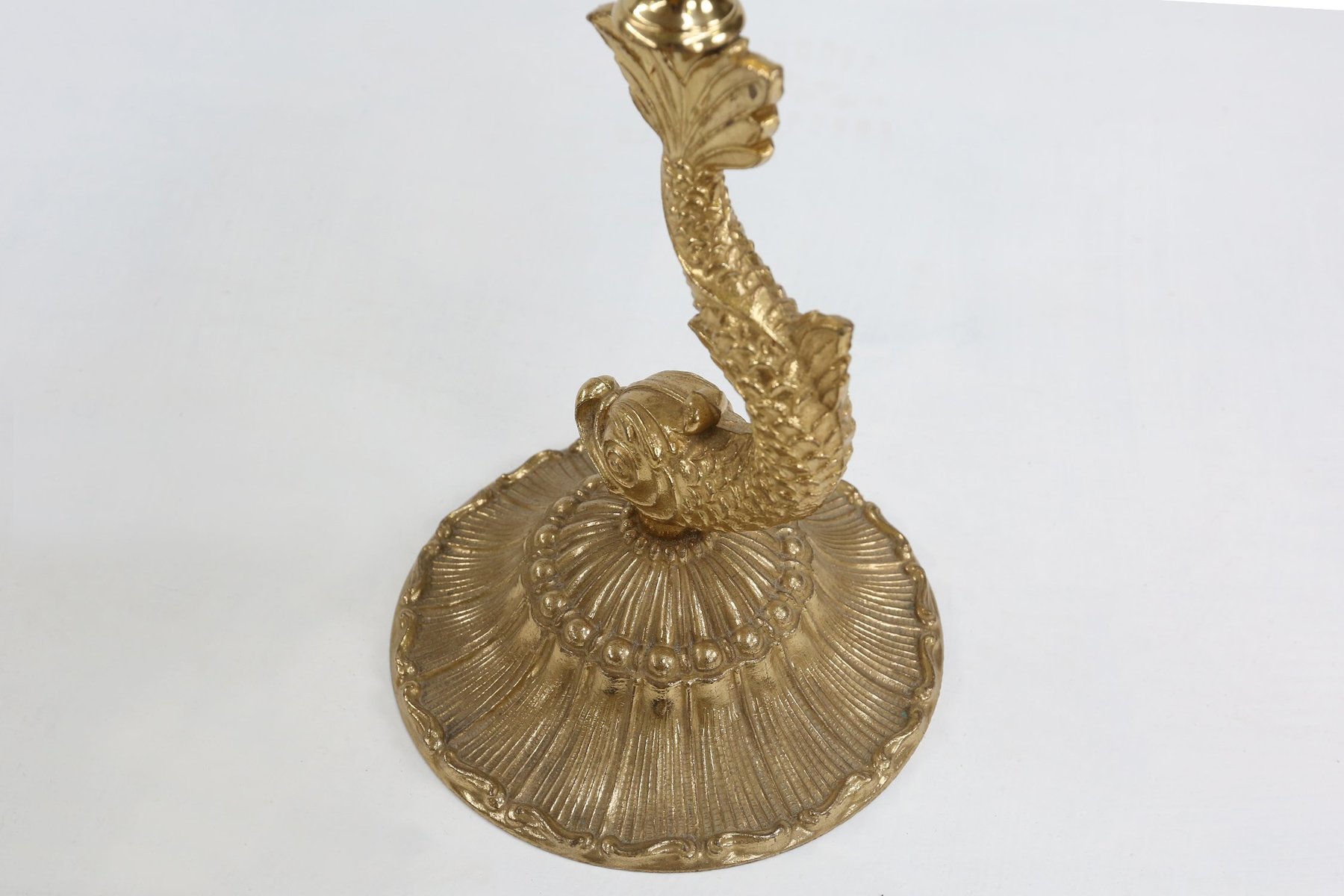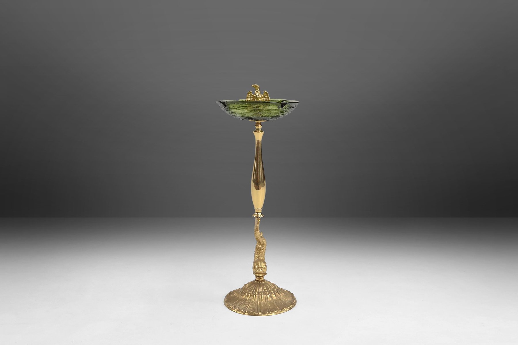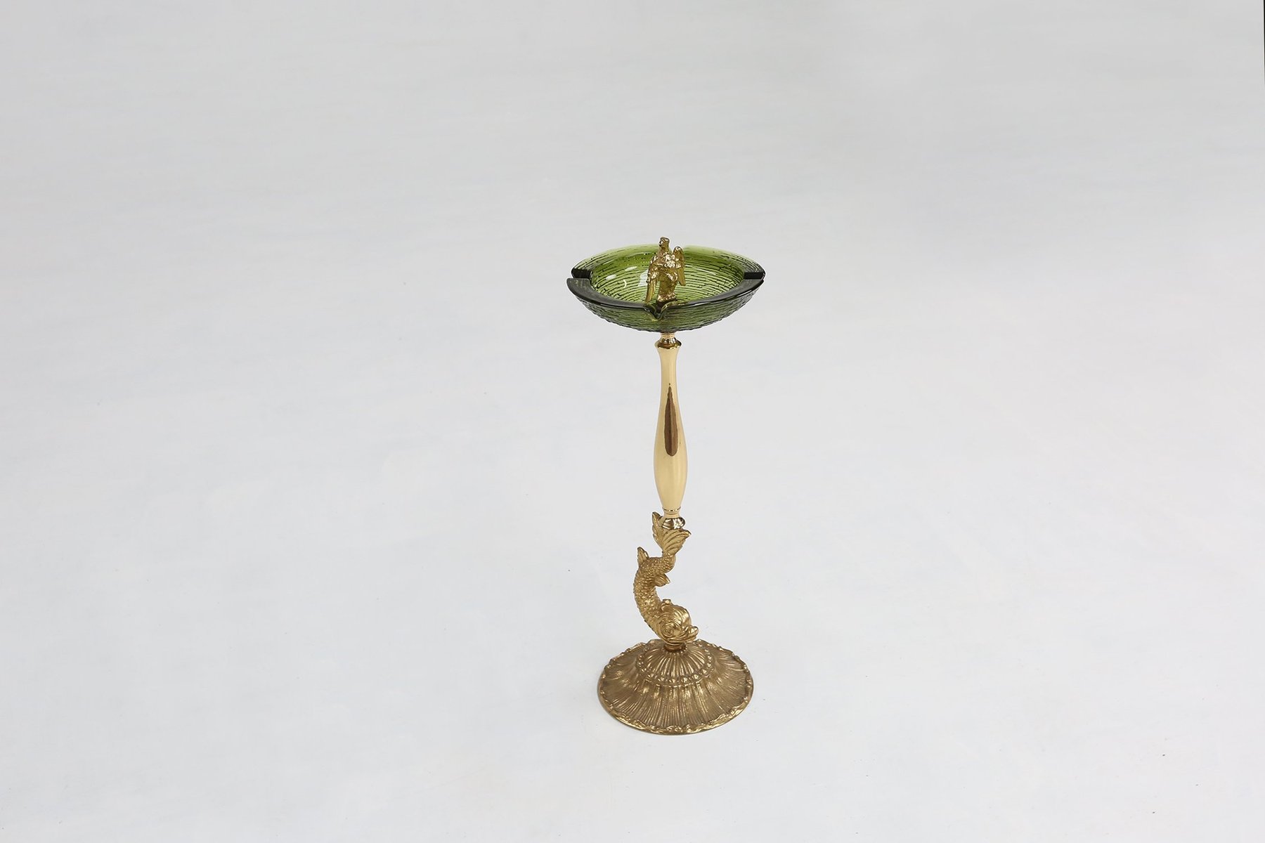 La base presenta un pez estilizado, posiblemente un delfín o una carpa koi, representado en metal dorado con escamas intrincadas y aletas fluidas. De este pedestal acuático se eleva un tallo delgado que sostiene un cuenco circular de vidrio verde, cuya superficie está sutilmente ondulada para captar la luz. En el centro del cuenco se encuentra un águila majestuosa, con las alas parcialmente extendidas, en posición de equilibrio, como si estuviera vigilando su dominio. La yuxtaposición del mar y el cielo, el pez abajo y el águila arriba, crea una composición vertical dinámica que trasciende su propósito utilitario. Cuatro muescas alrededor del borde sugieren su uso original como cenicero, pero la pieza se percibe más como un objeto de arte escultórico que como un simple accesorio para fumar. La combinación de vidrio verde y metal dorado refleja la fascinación de mediados de siglo por los materiales lujosos y las imágenes simbólicas, que a menudo se encuentran en las artes decorativas europeas de la posguerra. Ya sea colocado en una mesita auxiliar, en la repisa de la chimenea o dentro de una colección curada de curiosidades vintage, este cenicero ofrece a coleccionistas y diseñadores una rara mezcla de fantasía, artesanía y narración visual.