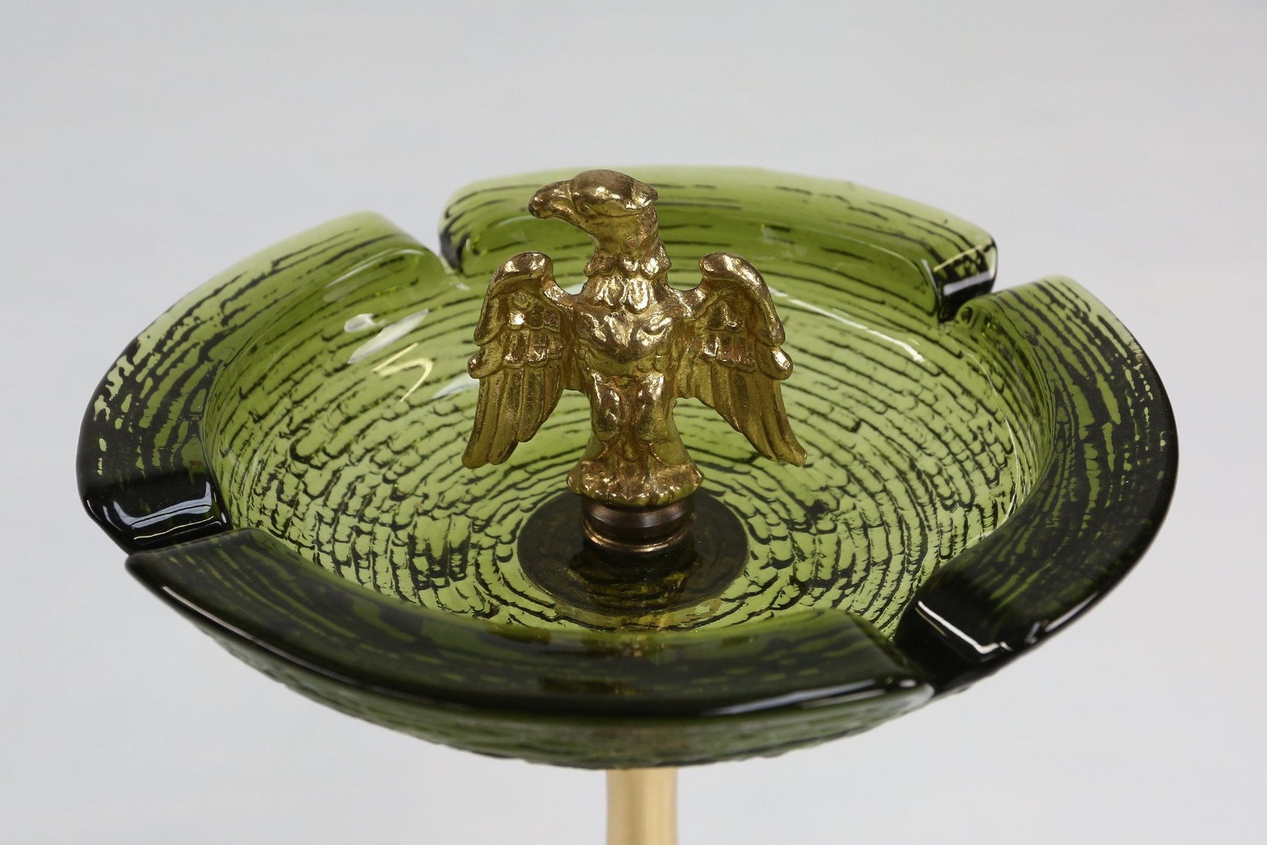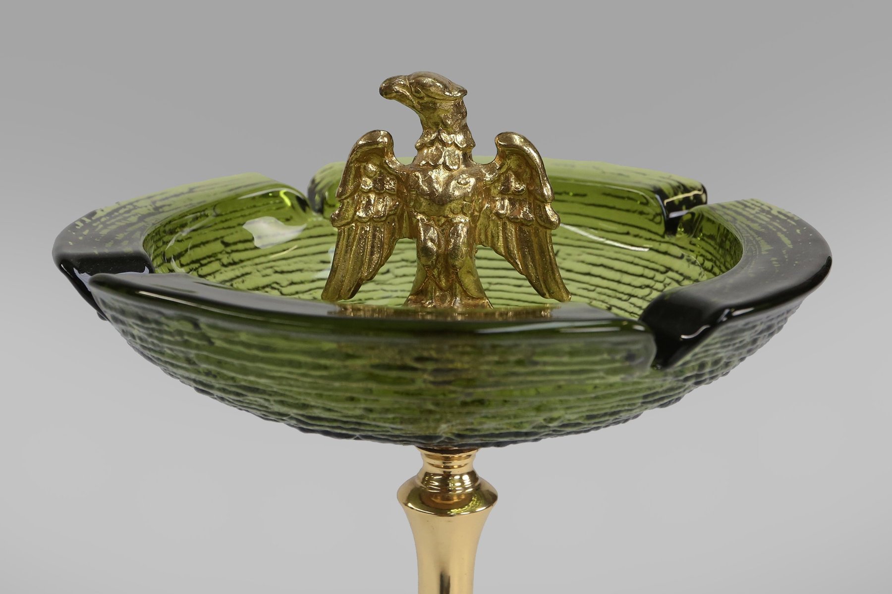 Four notches around the rim suggest its original use as an ashtray, yet the piece reads more as a sculptural objet d’art than a mere smoking accessory. The combination of green glass and gold-toned metal reflects the mid-century fascination with luxurious materials and symbolic imagery, often found in European decorative arts of the post-war period.