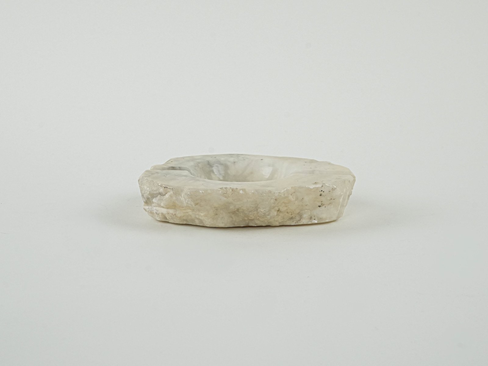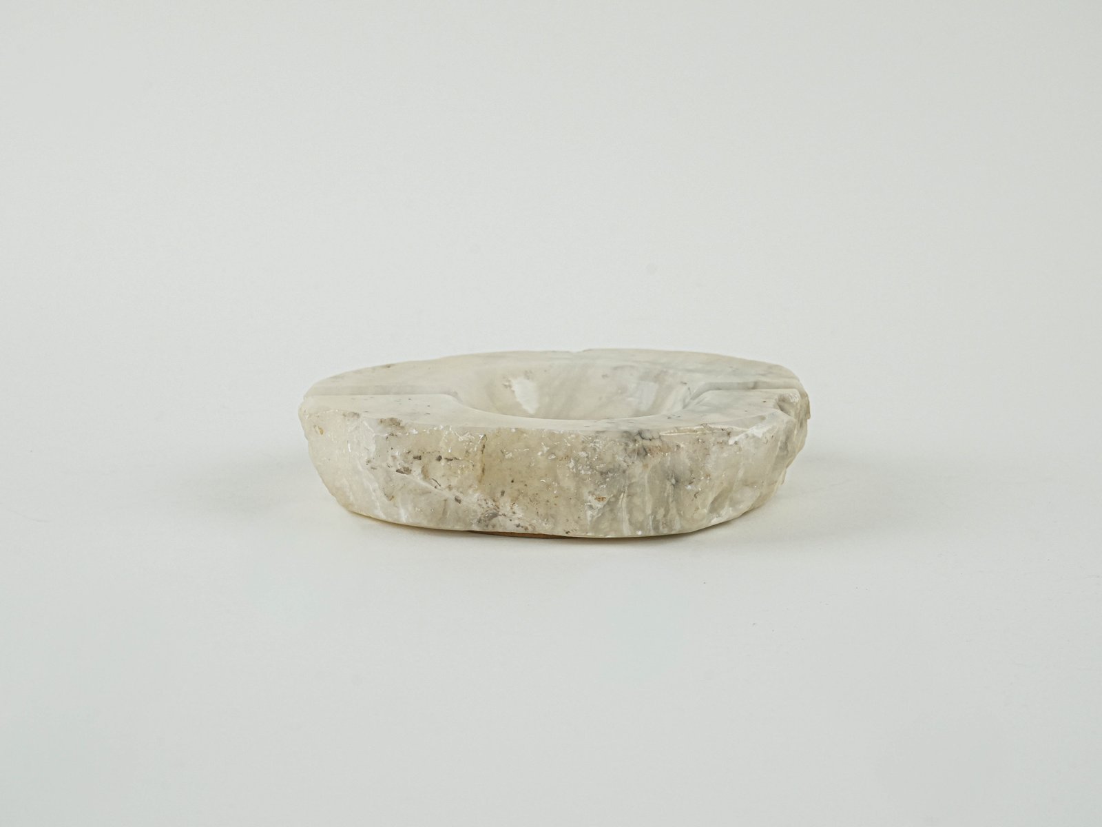 A heavy, hand-made bowl made of natural onyx in shades of cream, beige and delicate grey. The surface is smoothly polished on the inside, while the outside has been partially preserved in its raw stone texture. It can be used as an ashtray, a decorative bowl or a unique vintage and mid-century style decorative element.