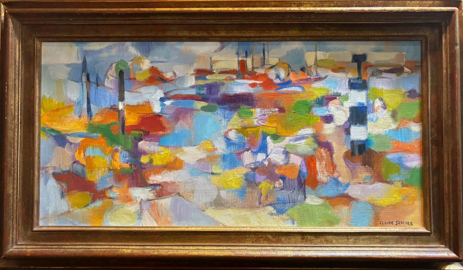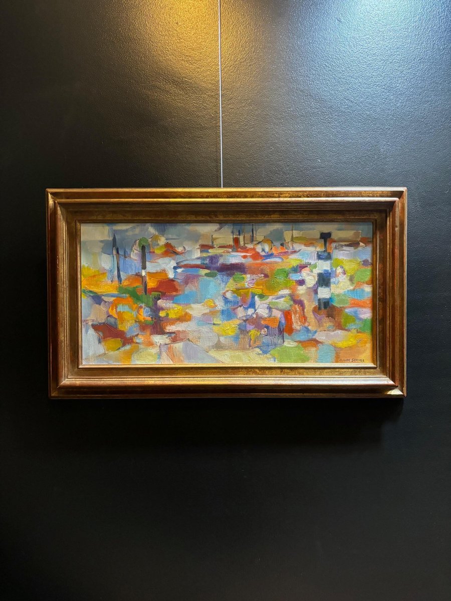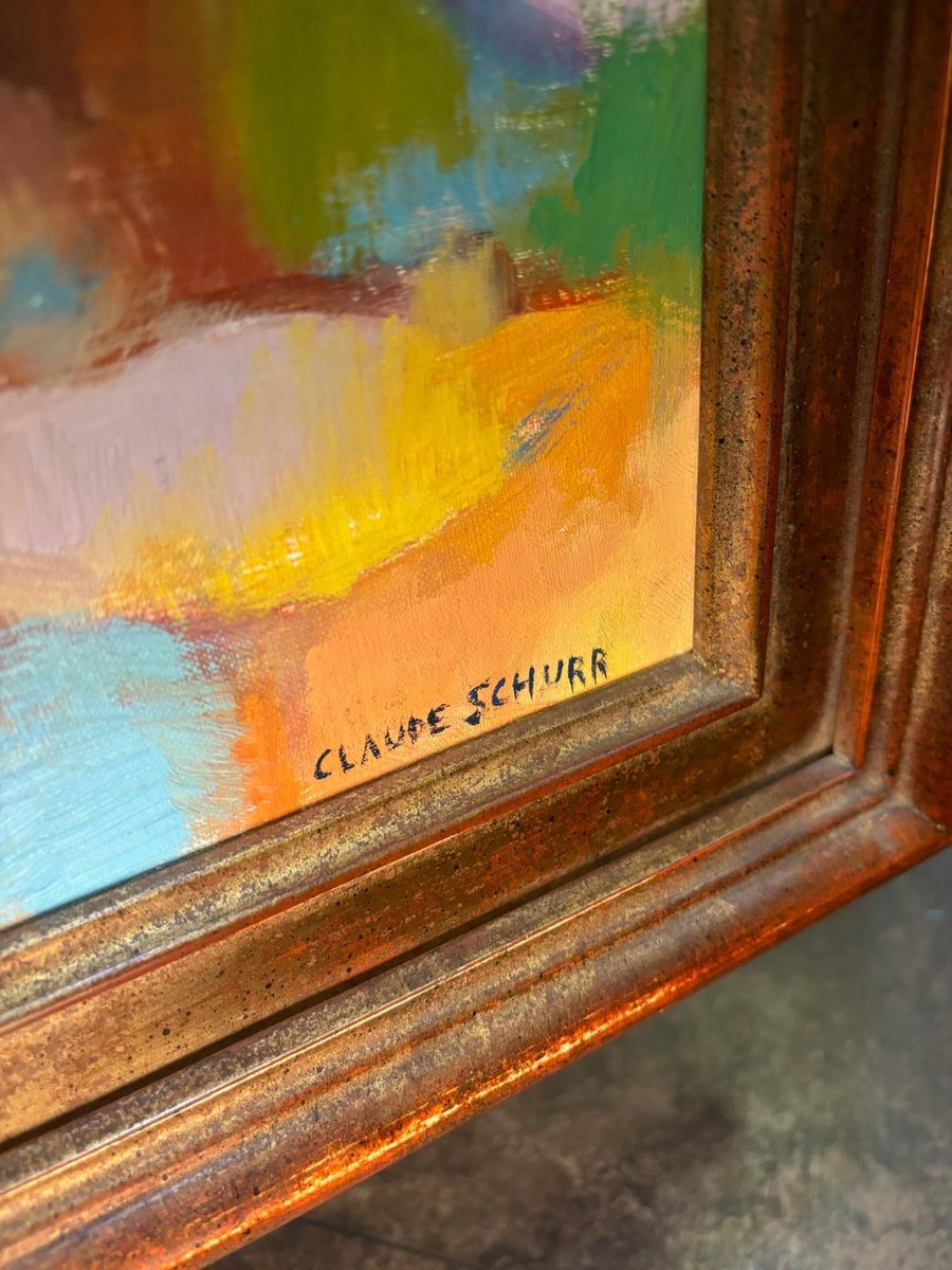 Claude Schurr (1921-2014) was a French painter known for his unique contribution to modern and contemporary art. He studied at the École nationale supérieure des Beaux-Arts in Paris and was associated with the post-war School of Paris, a movement that featured a variety of styles including figurative art and abstraction. Schurr's style is often described as lyrical abstraction, with an emphasis on color, light, and form. His works are characterized by vibrant, expressive brushstrokes, and a rich, dynamic use of color that often borders on abstraction, though many of his works retain a sense of landscape or figure within the composition. He was deeply interested in the interplay between light and shadow, and his works frequently evoke dream-like atmospheres. This artwork is a vivid example of Schurr's abstract tendencies. The bold, diverse color palette and fluid brushwork create a sense of movement and depth. While it is an abstract piece, there are hints of structural forms like vertical and horizontal lines that could suggest architectural or landscape elements. The overall feeling is one of harmony and emotion, achieved through the balance of color and shape. This painting exemplifies Schurr's ability to blend the abstract with subtle references to reality, engaging the viewer's imagination. Oil on canvas sold with frame Total size with frame 73x43 cm