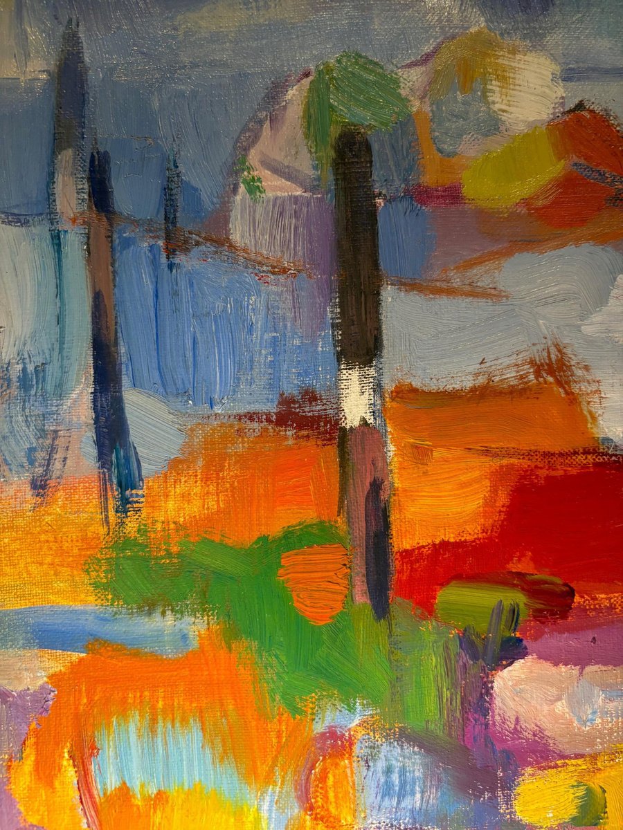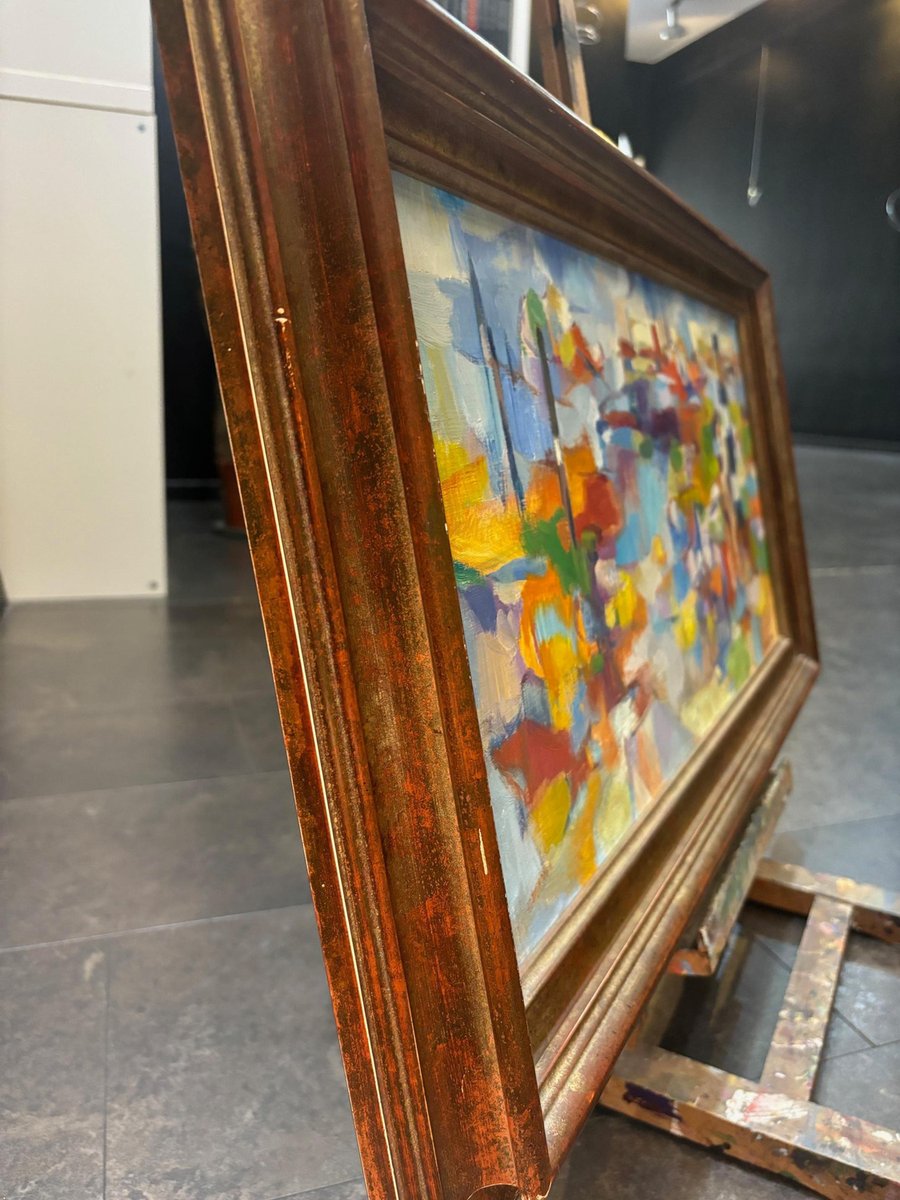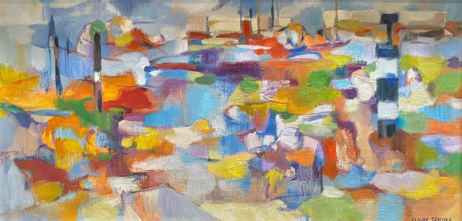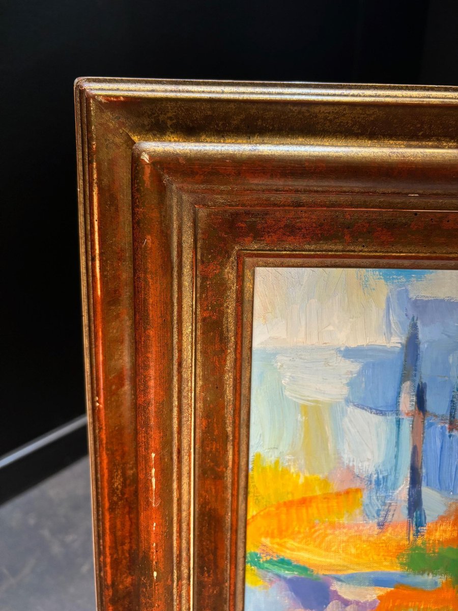 Claude Schurr (1921-2014) was a French painter known for his unique contribution to modern and contemporary art. He studied at the École nationale supérieure des Beaux-Arts in Paris and was associated with the post-war School of Paris, a movement that featured a variety of styles including figurative art and abstraction. Schurr's style is often described as lyrical abstraction, with an emphasis on color, light, and form. His works are characterized by vibrant, expressive brushstrokes, and a rich, dynamic use of color that often borders on abstraction, though many of his works retain a sense of landscape or figure within the composition. He was deeply interested in the interplay between light and shadow, and his works frequently evoke dream-like atmospheres. This artwork is a vivid example of Schurr's abstract tendencies. The bold, diverse color palette and fluid brushwork create a sense of movement and depth. While it is an abstract piece, there are hints of structural forms like vertical and horizontal lines that could suggest architectural or landscape elements. The overall feeling is one of harmony and emotion, achieved through the balance of color and shape. This painting exemplifies Schurr's ability to blend the abstract with subtle references to reality, engaging the viewer's imagination. Oil on canvas sold with frame Total size with frame 73x43 cm