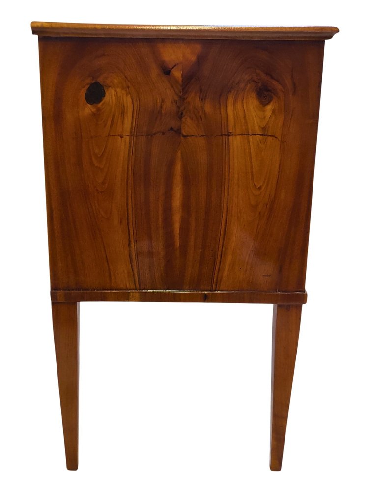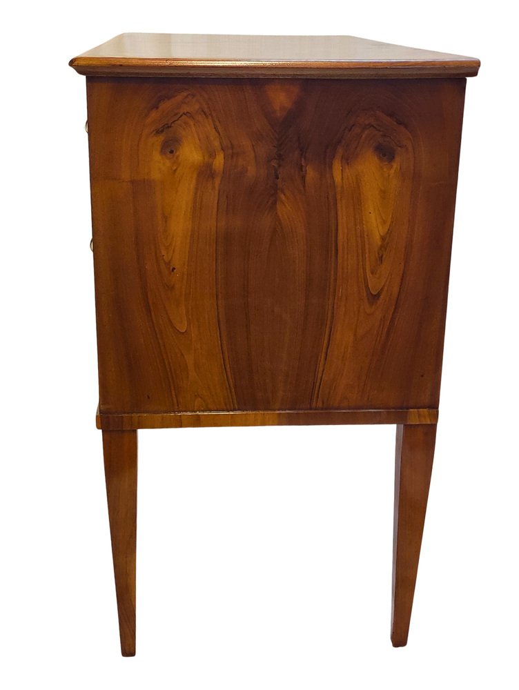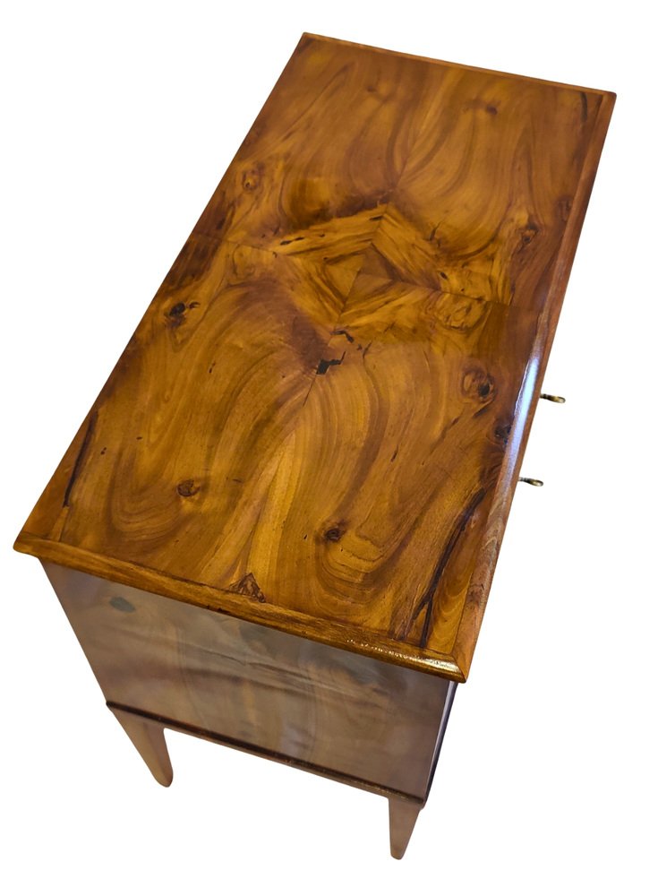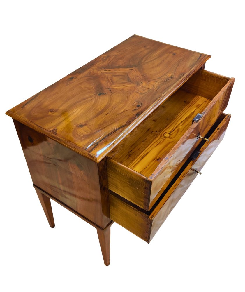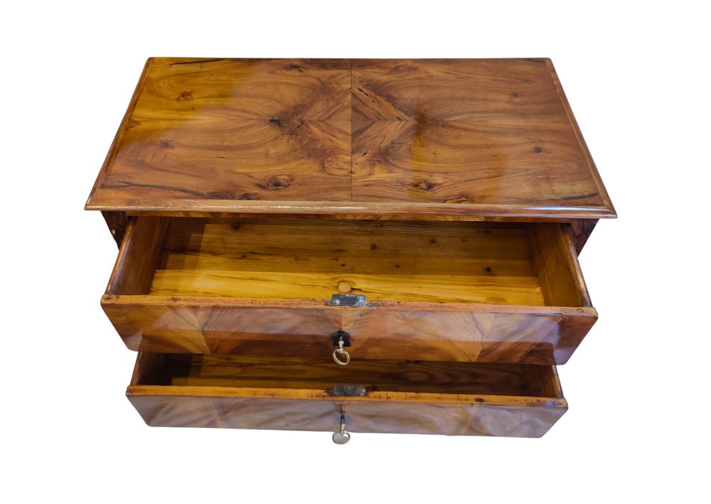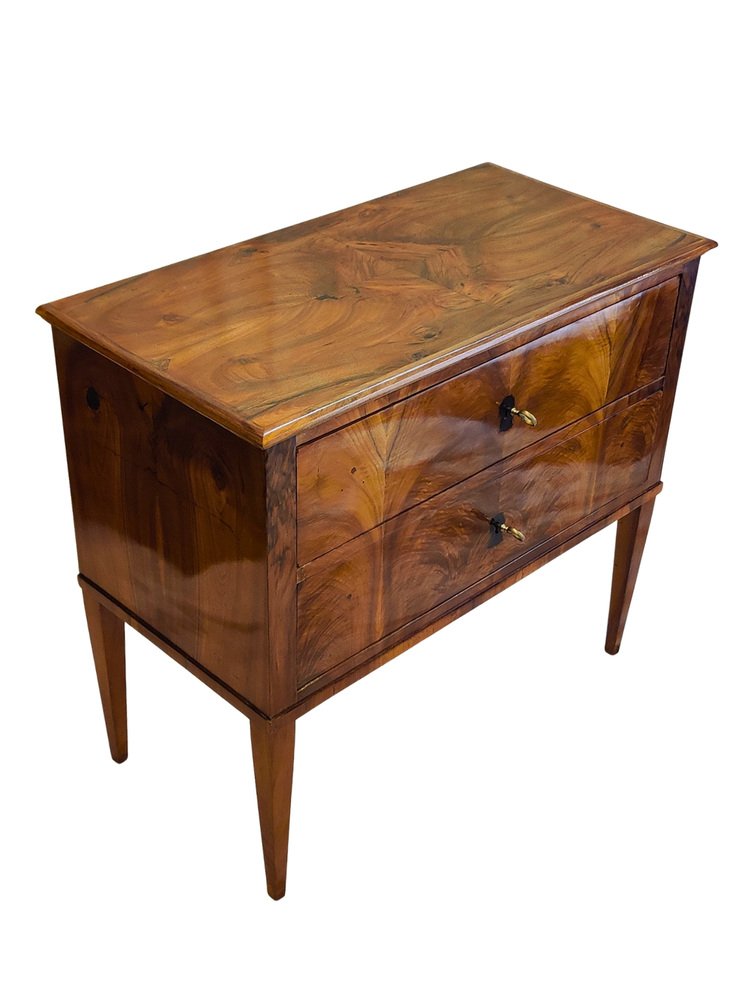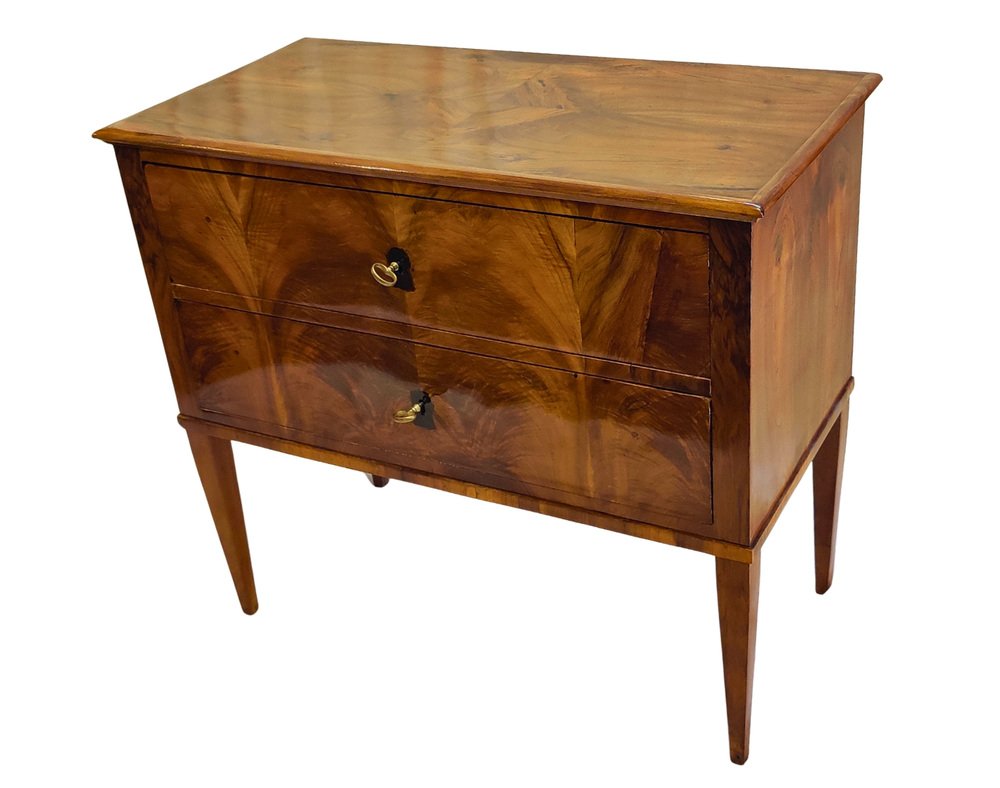 This rare two-drawer commode was crafted in Southern Germany around 1790–1810, at the transition from late Classicism to early Biedermeier. The elegant piece is veneered in beautifully book-matched walnut on all sides, displaying a harmonious grain pattern across the front, sides, and top. It features two drawers with period locks that have been carefully repaired and are in working order, complemented by later-added keys. Resting on slender tapered legs, the commode shows the refined proportions typical of the era. with its compact size (H 77 × W 86 × D 43 cm), warm walnut surface, and hand-polished finish, this chest combines functionality with timeless elegance – a rare small-scale example seldom available on the market.