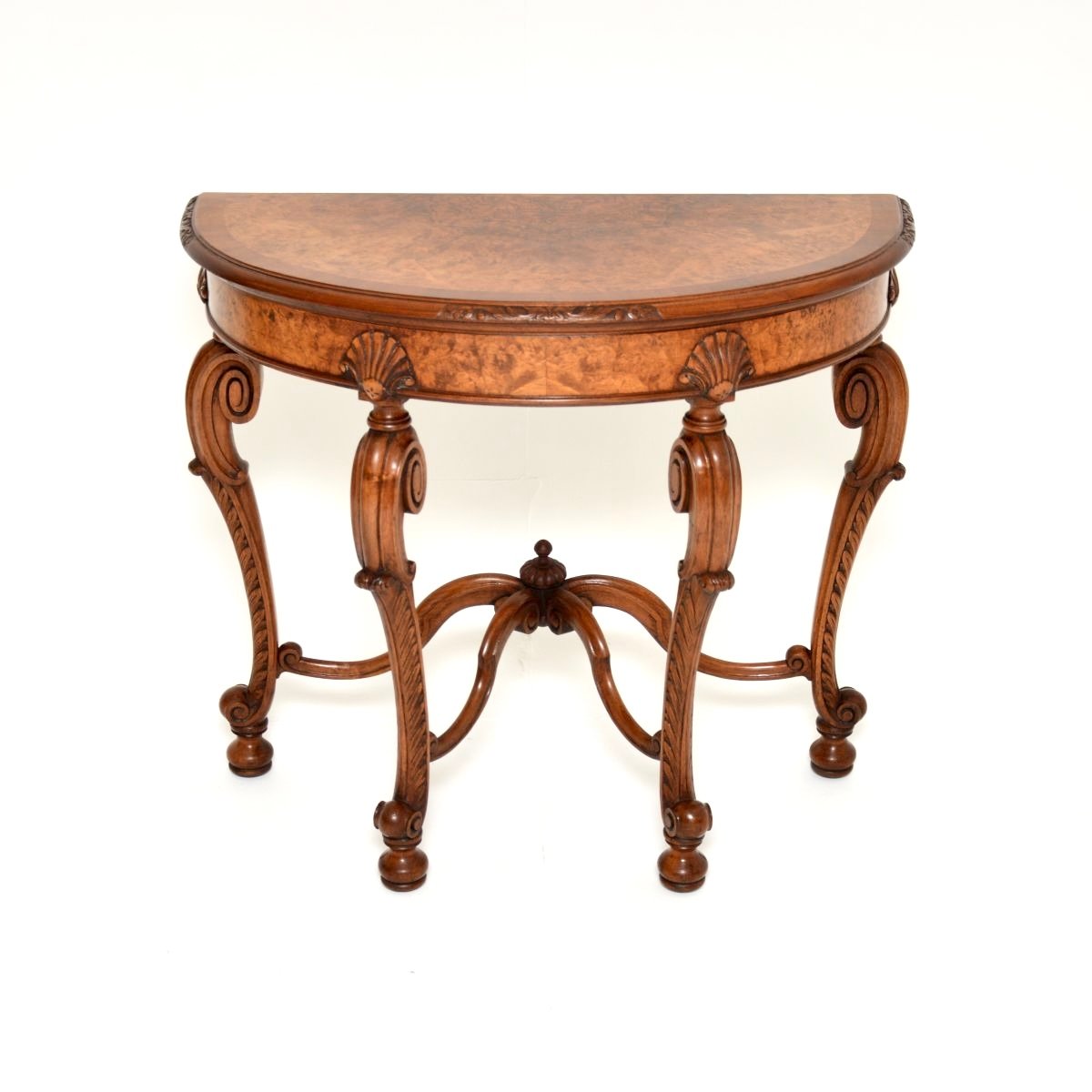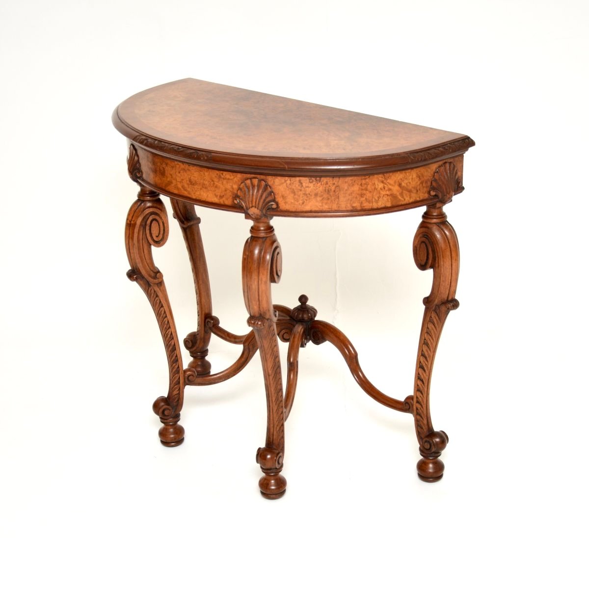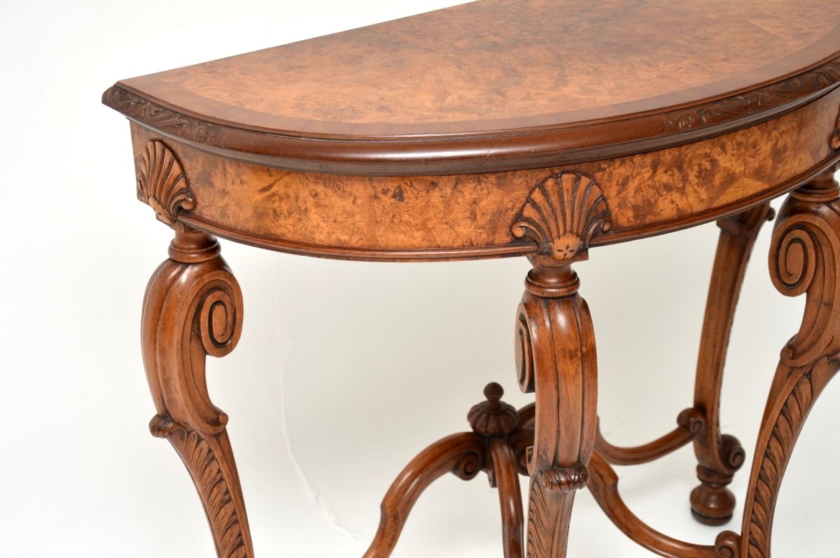 A stunning antique burr walnut console side table by Maple and Co. This was made in England, it dates from around the 1890-1910 period.
