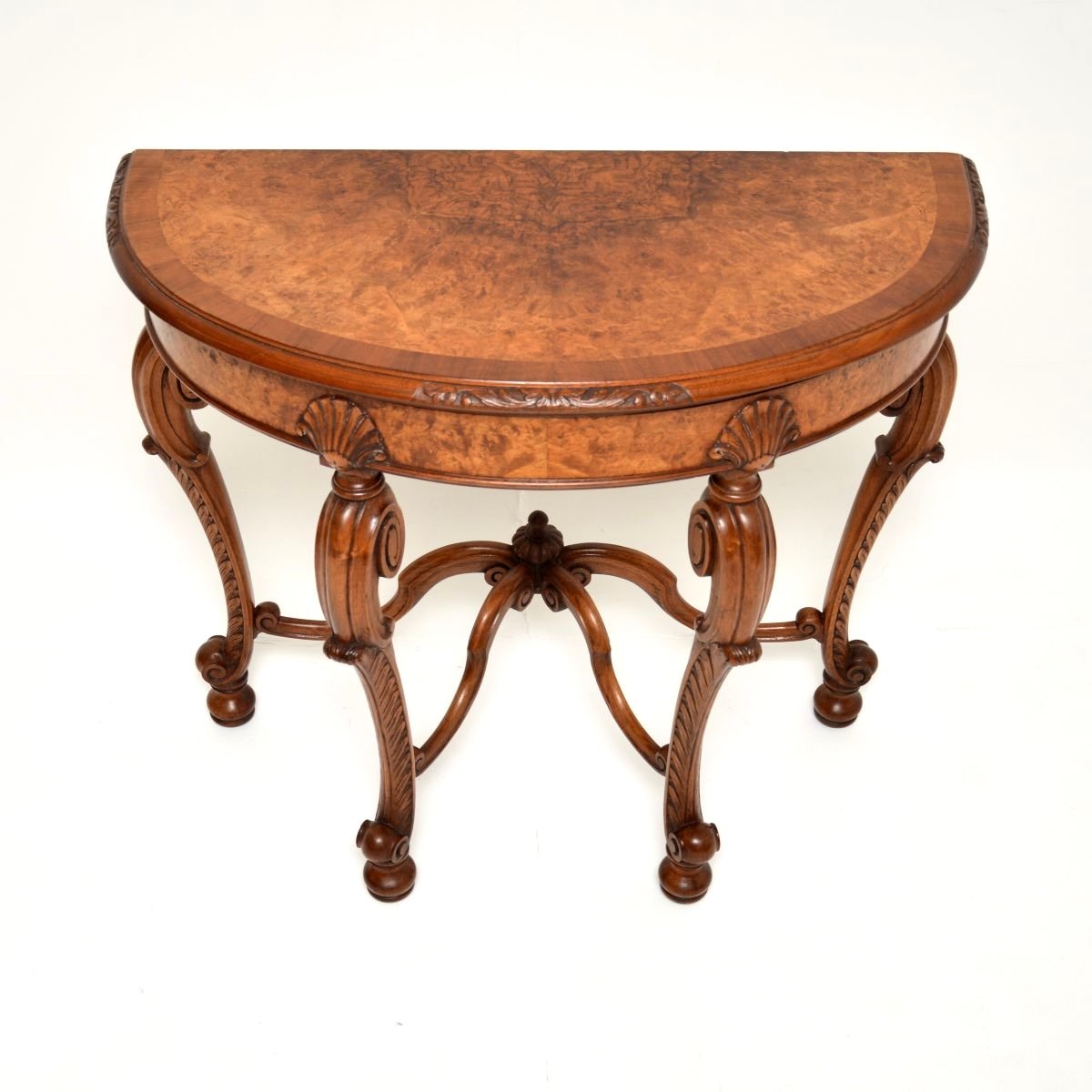 It is of extremely fine quality, with stunning burr walnut grain patterns and beautifully intricate carving. The legs are scrolled with acanthus leaf carving on the front edges, and shell carving at the top. The top is nicely cross banded, this has the Maple and Co. badge under the top.