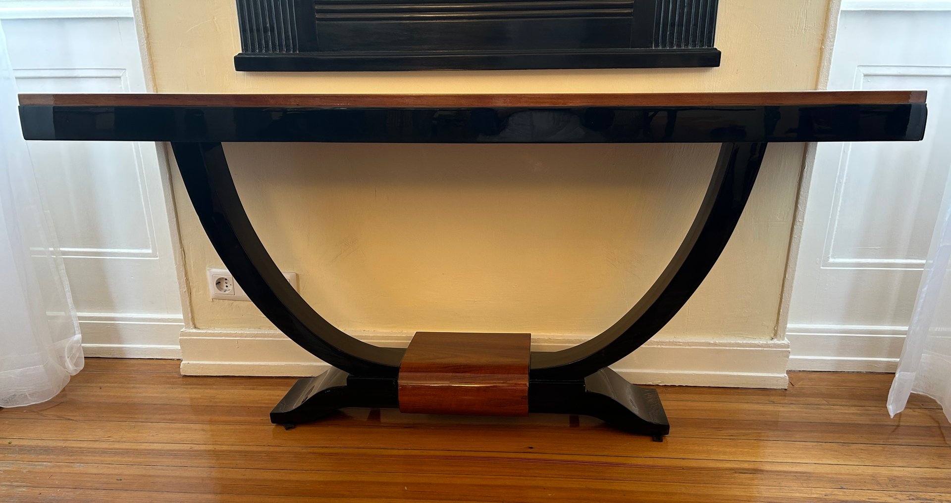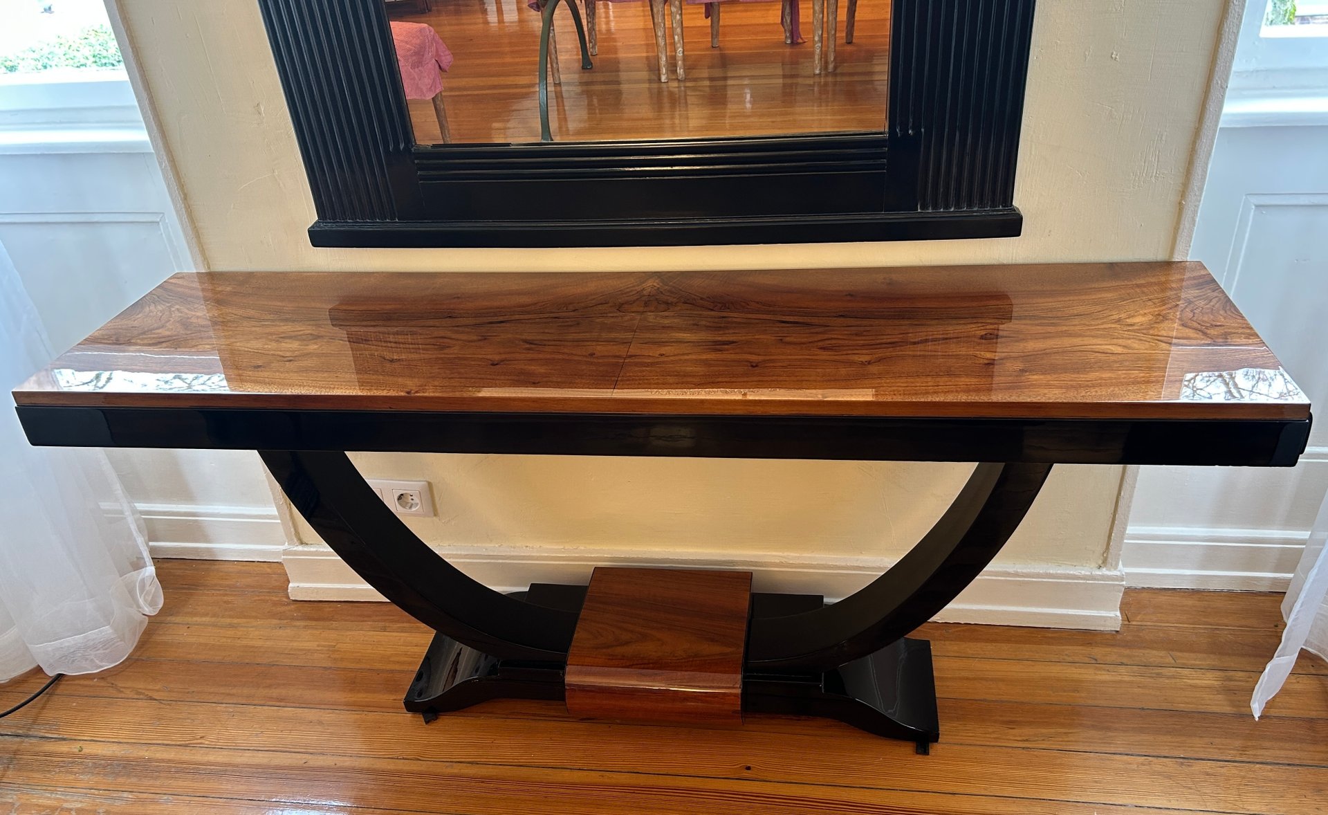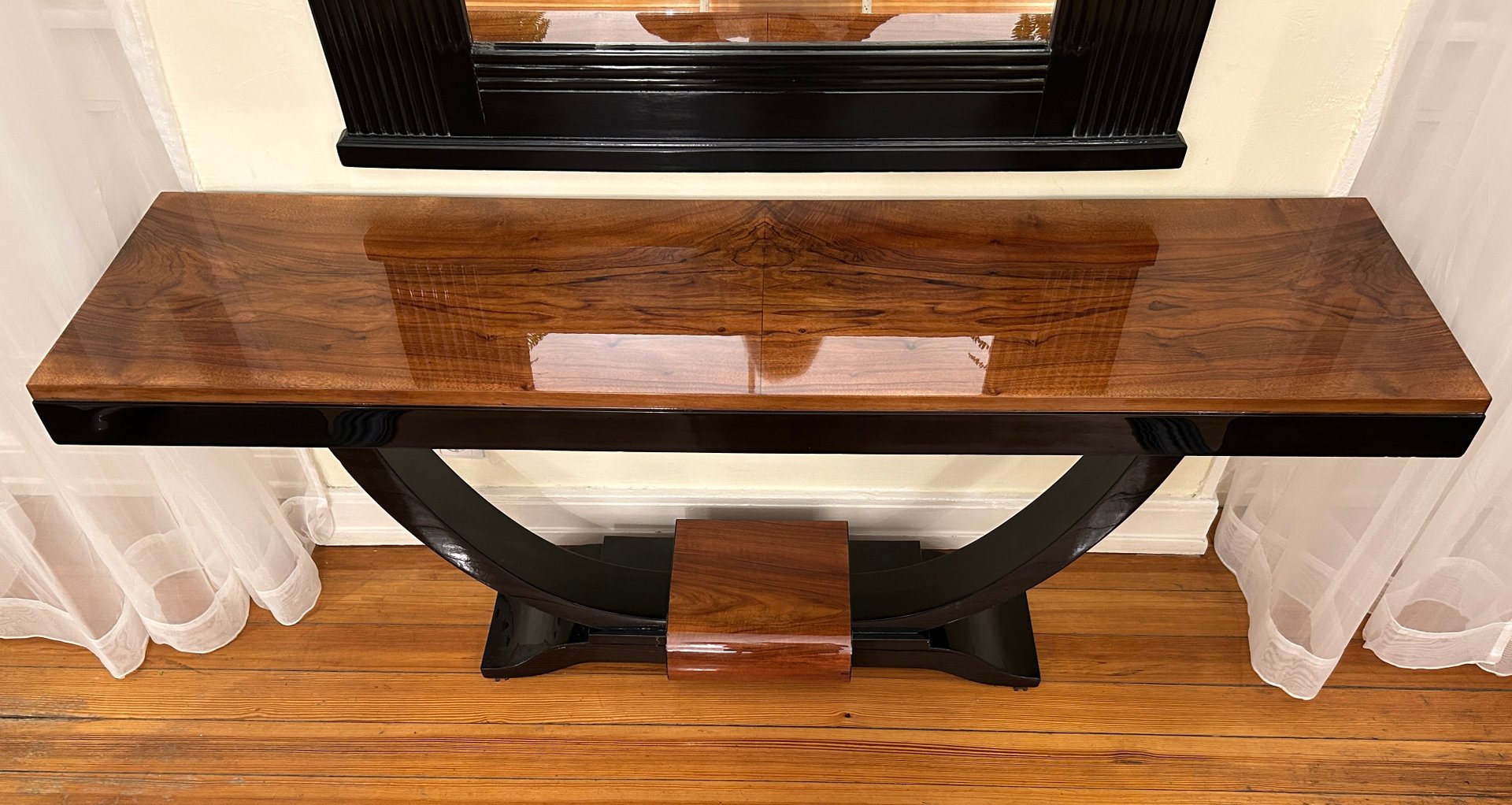 Consola Art Déco de chapa de nogal y laca negra brillante, años 20