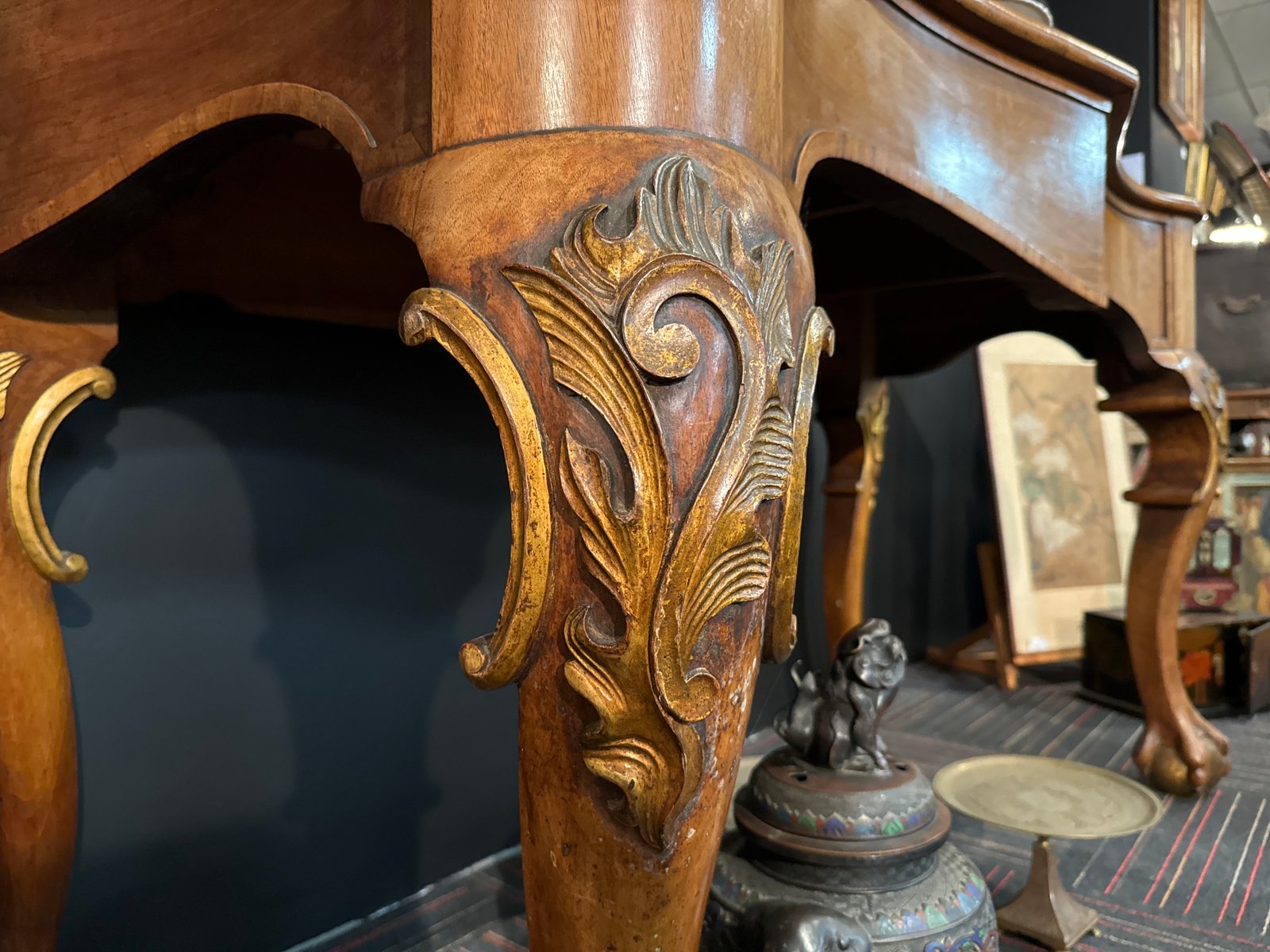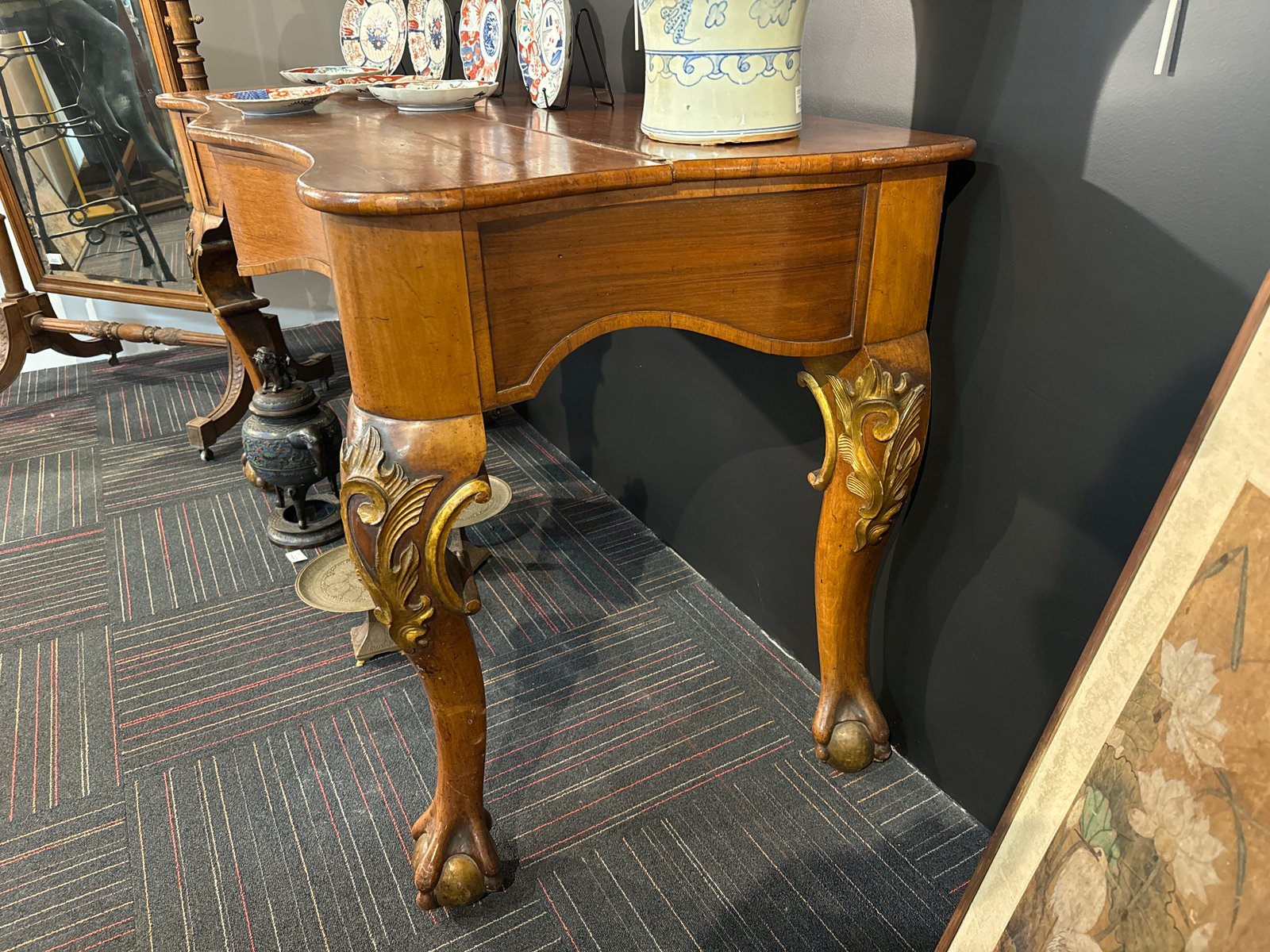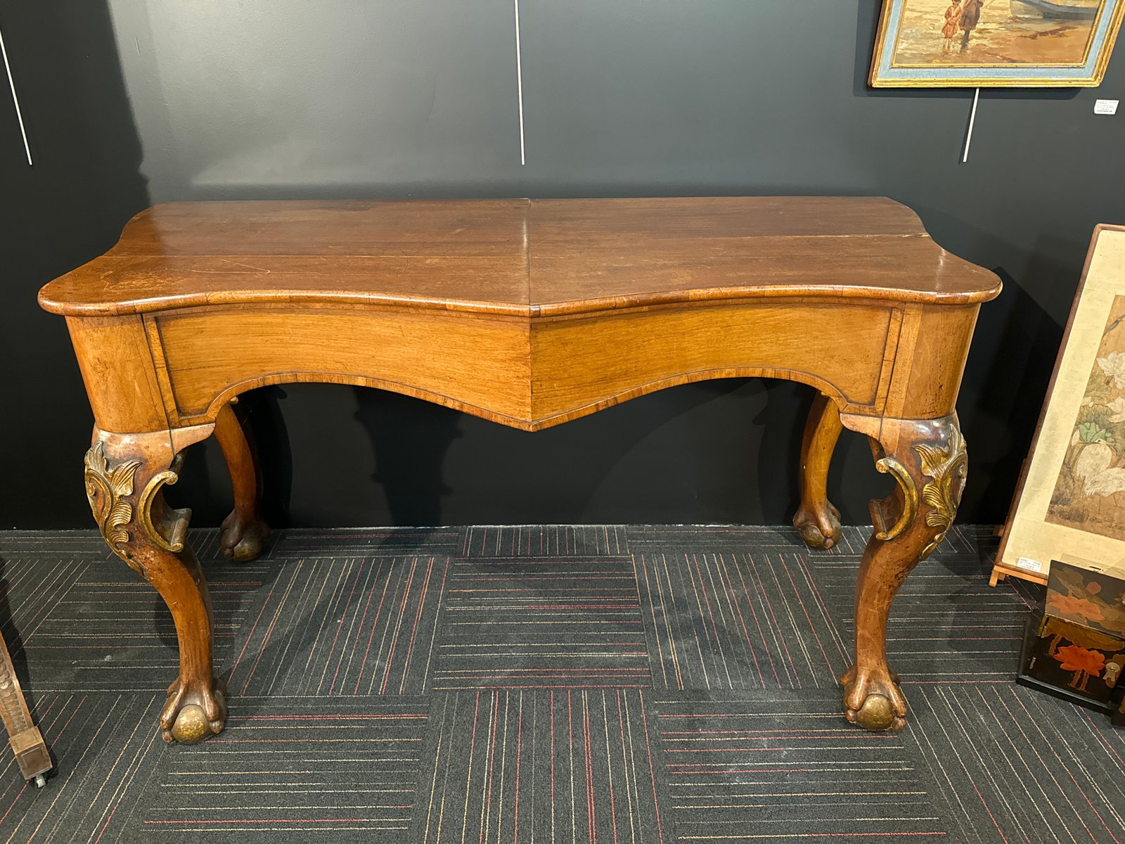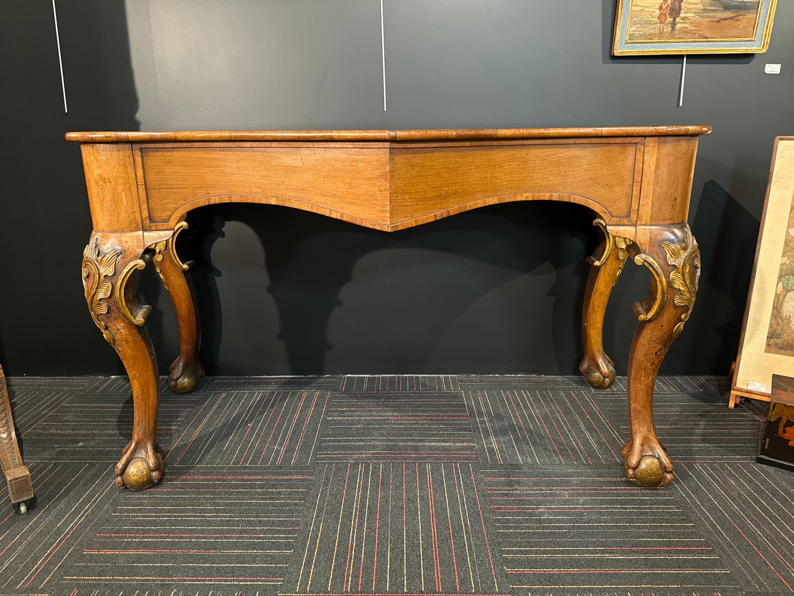 Consola inglesa grande del siglo XIX con patas esféricas rodeadas de garras y patas talladas y doradas