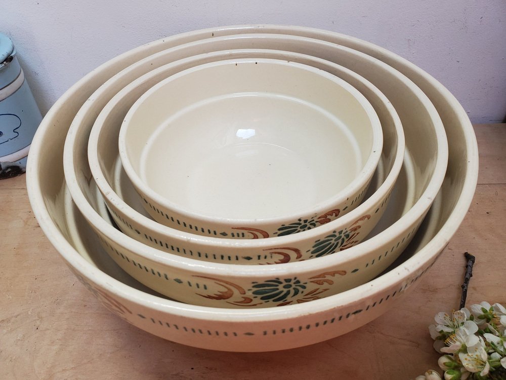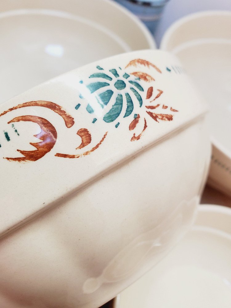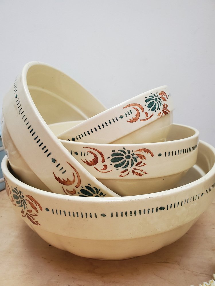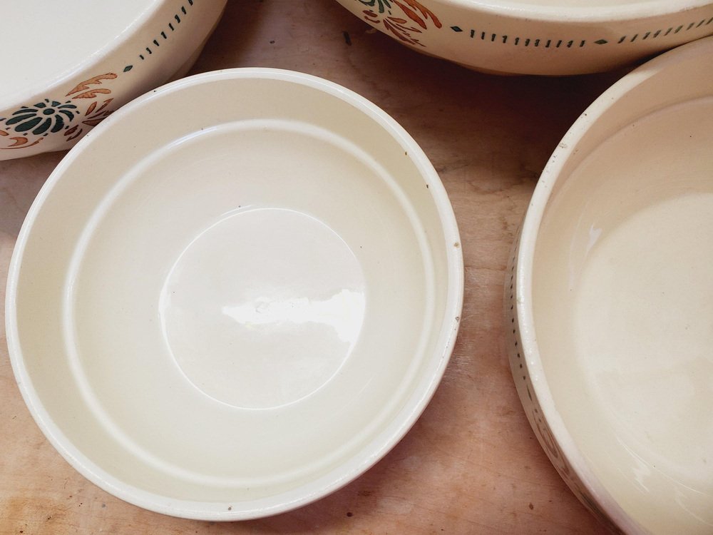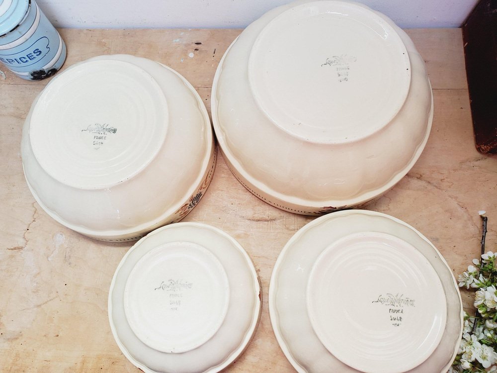 Cuencos de servicio franceses antiguos de piedra de hierro con motivos florales de Sarreguemines. Juego de 4