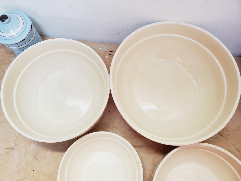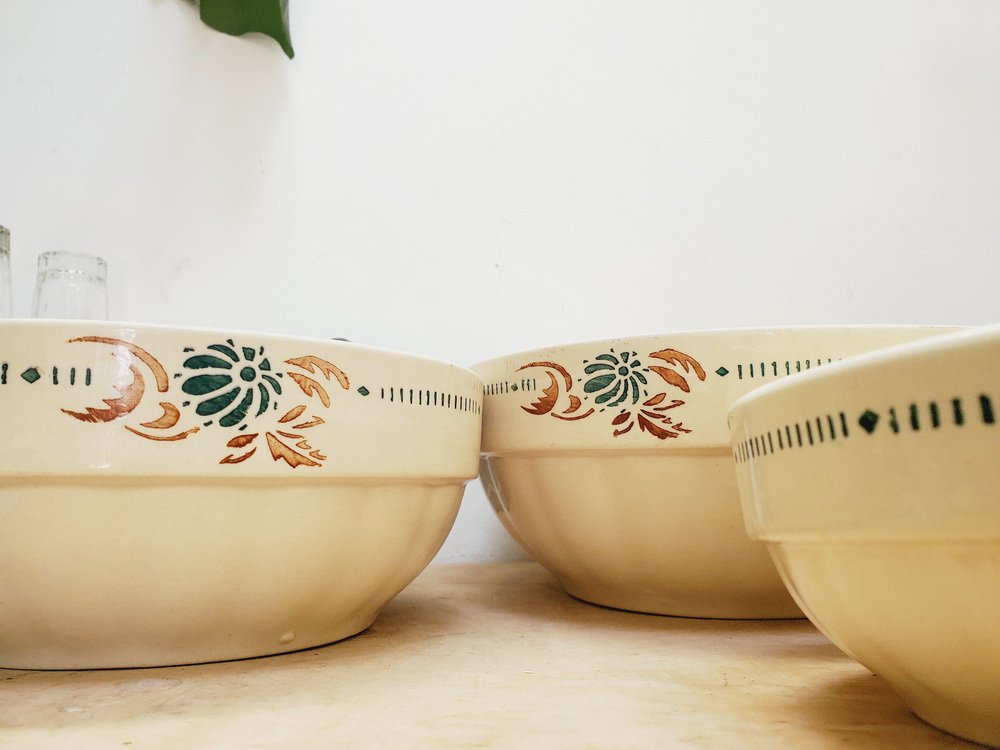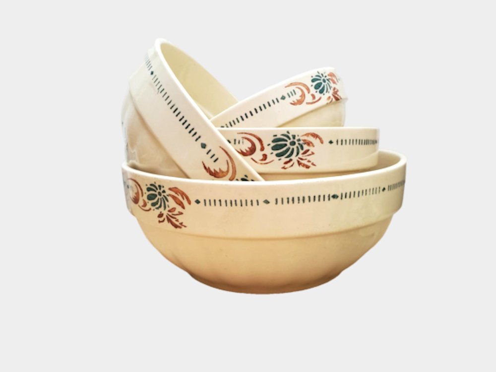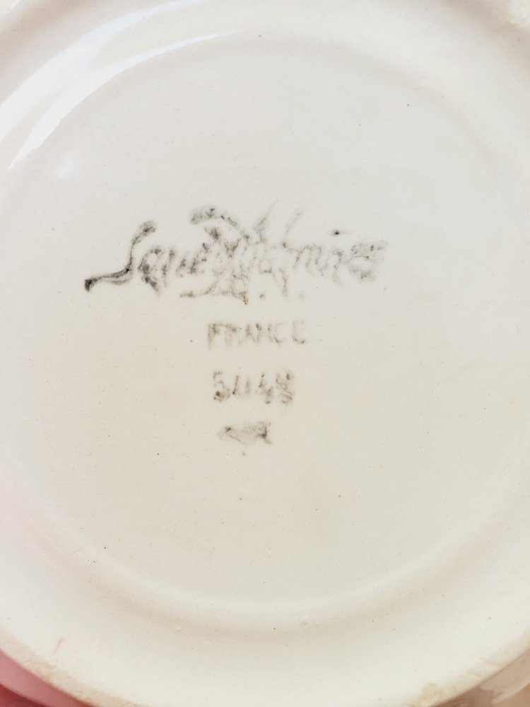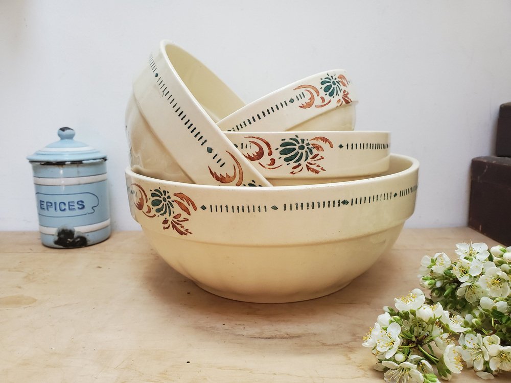 Cuencos de servicio franceses antiguos de piedra de hierro con motivos florales de Sarreguemines. Juego de 4
