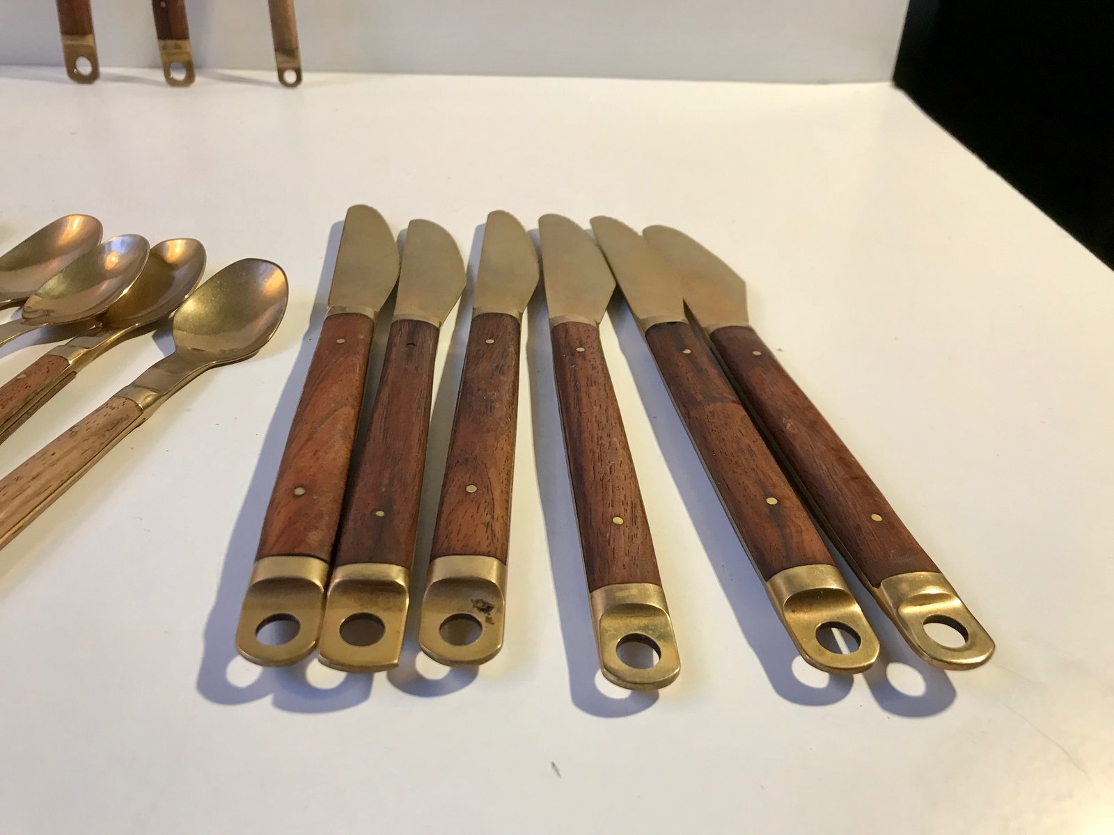 Cubertería danesa moderna de teca y latón de Carl Cohr, años 60. Juego de 21