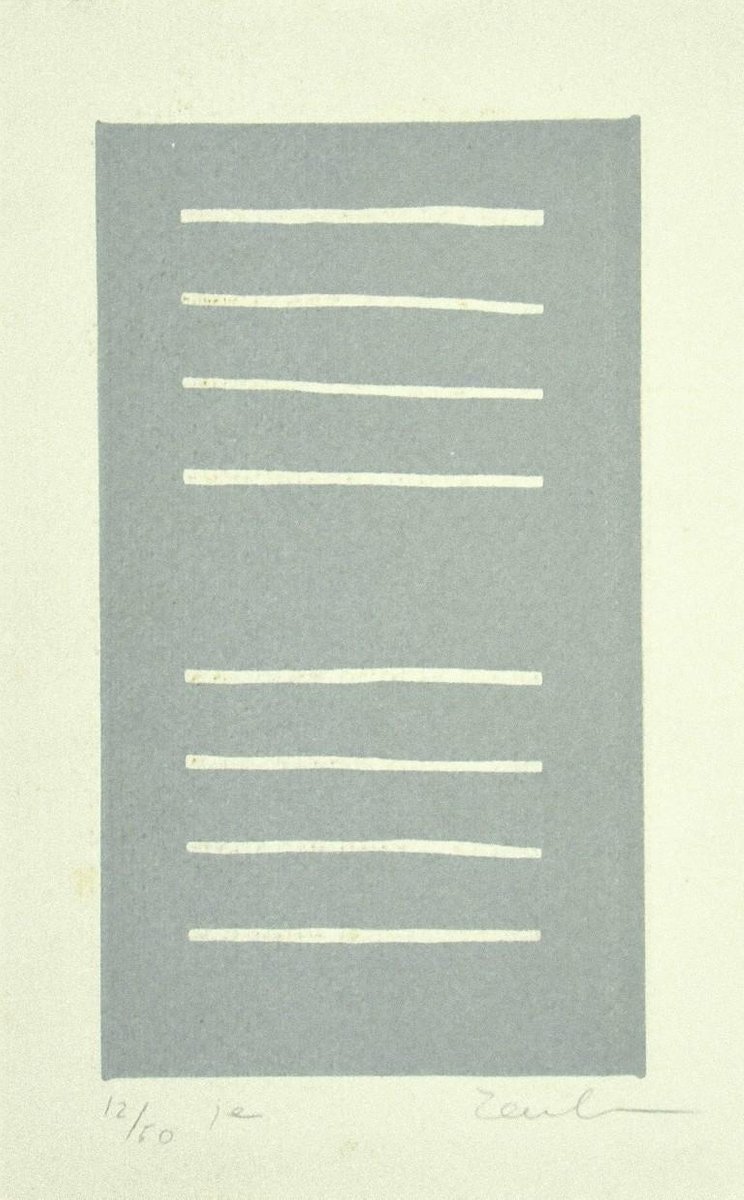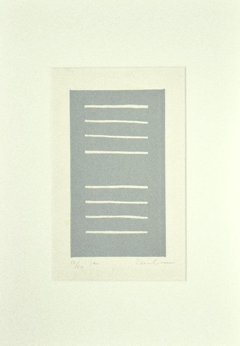 La composición es una obra de arte original al aguafuerte sobre papel realizada en 1970 ca. por un artista desconocido de mediados del siglo XX. Firmado a mano con lápiz en la parte inferior derecha, ilegible. Numerada, edición de 12/50 ejemplares. Incluye un passepartout: 49 x 34cm. El estado de conservación es muy bueno. La obra representa una composición abstracta, representada por trazos suaves y lisos sobre un fondo grisáceo, crea armonía y belleza a través de líneas y formas simples, jugando alegremente con el espacio vacío, hace una expresión poética de un discípulo en la composición minimalista.
