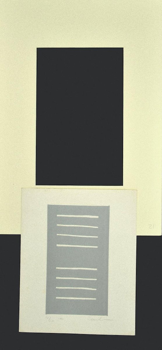 Composition is an original etching artwork on paper realized in 1970 ca. by an unknown artist of the mid-20th Century.. Hand-signed in pencil on the lower right, illegible. Numbered, edition of 12/50 prints. Included a Passepartout: 49 x 34cm. The state of preservation is very good. The artwork represents an abstract composition, depicted by soft and smooth strokes on a greyish background, created harmony and beauty through simple lines and forms, joyful playing with empty space, makes a poetical expression of a disciple in minimalist composition.