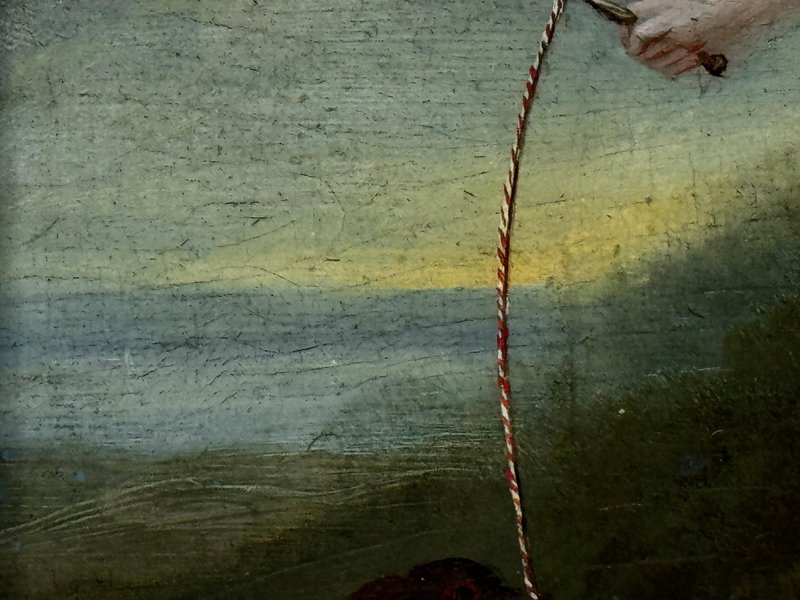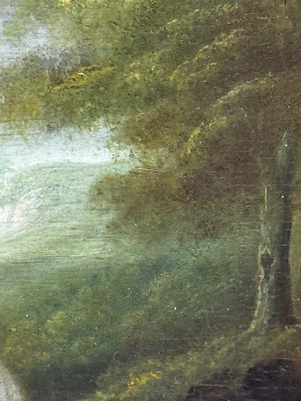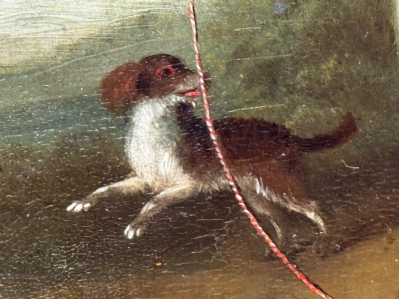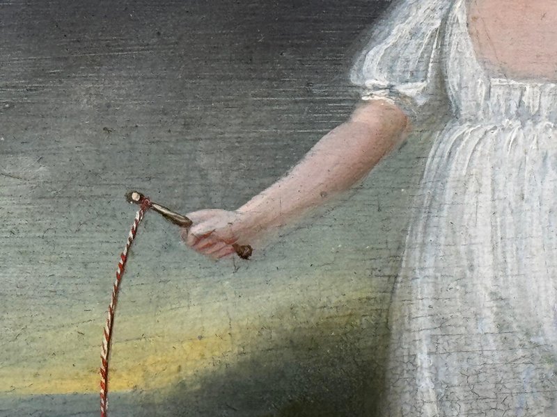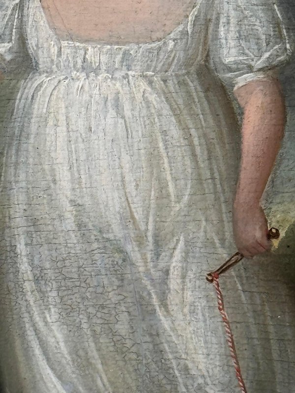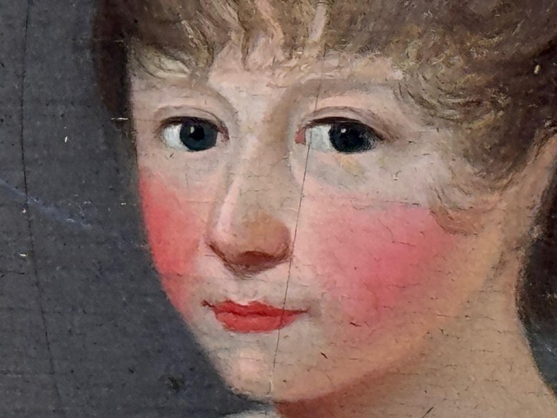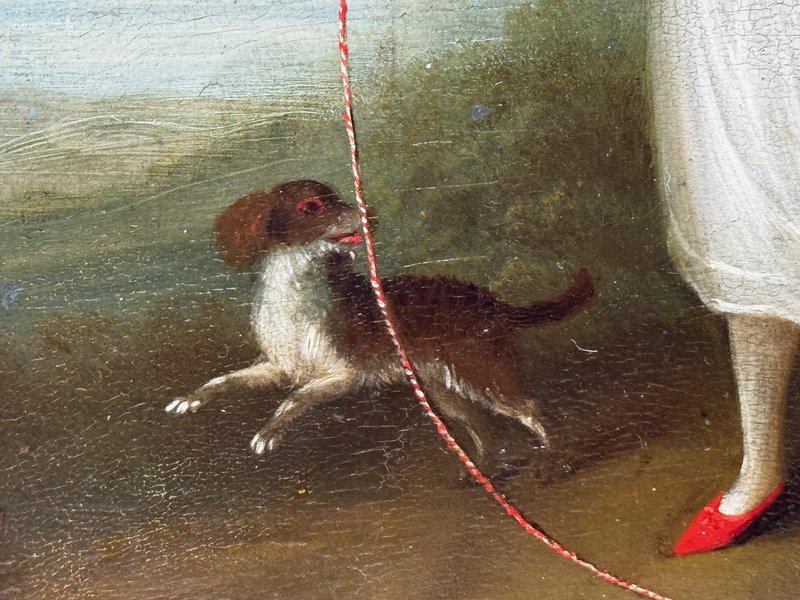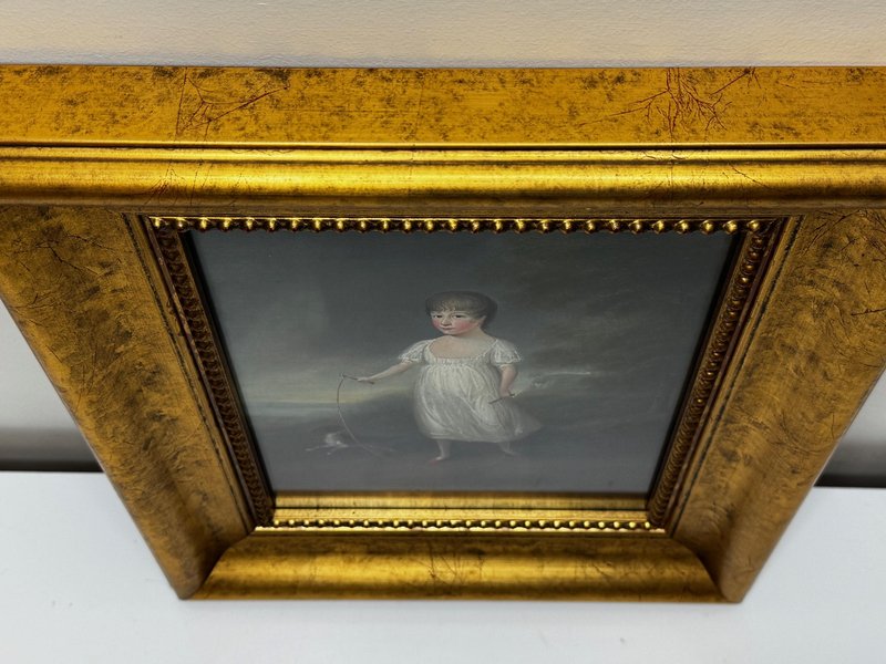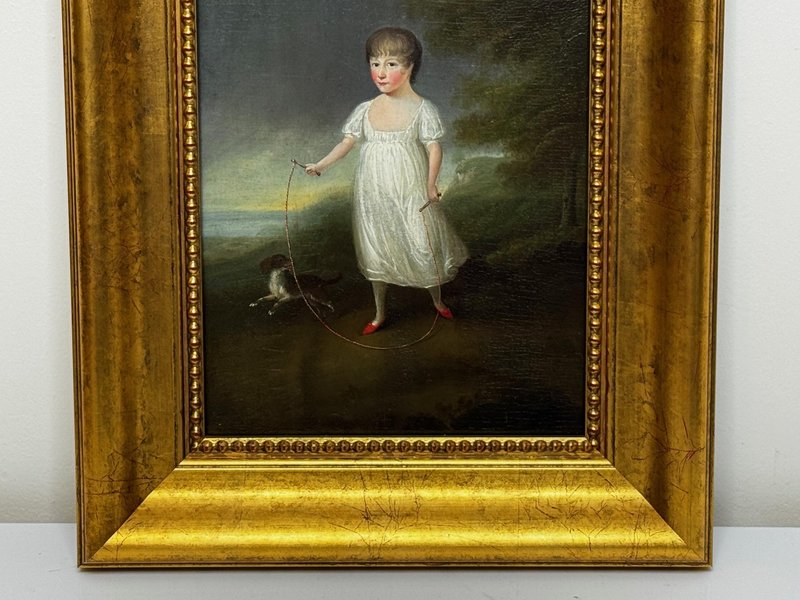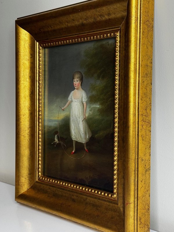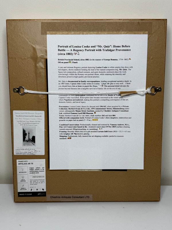 Historical Oil Painting Masterpiece Portrait of Louisa Cooke and “Mr. Quiz”: Home Before Trafalgar Battle Regency-era portrait with Trafalgar provenance, circa 1802 British Provincial School, in the manner of George Romney (1734–1802) Overview A rare, intimate early-19th-century portrait depicting Louisa Cooke outdoors in a white empire-line dress with red slippers, accompanied by her named dog, “Mr. Quiz,” held on a lead. Beyond its visual charm, this is a genuinely narrative-led work: Mr. Quiz is documented by name in family correspondence, creating an unusually personal and historically anchored portrait. Medium and Size Medium: Oil on panel Panel size: 26.6 cm × 20.3 cm Composition and Style A poised full-length figure set within a softly atmospheric landscape. The luminous white dress is contrasted against a darker ground, with careful attention to Regency costume detail and a direct, quietly expressive gaze. The restrained modelling and sincere finish align with refined British provincial portrait practice around 1800, closely related in spirit to the Romney generation’s domestic elegance and human scale. Historical Context Louisa Cooke was the wife—and later widow—of Captain John Cooke, RN (1762–1805), commander of HMS Bellerophon, renowned for its prominent role at the Battle of Trafalgar, where Captain Cooke was killed. HMS Bellerophon later became famous as the ship on which Napoleon surrendered. This portrait captures the “home front” before history turns—an emotionally resonant counterpoint to the public narrative of naval warfare. Documented Companion: “Mr. Quiz” Mr. Quiz is not merely a companion animal included for effect; he is recorded by name in an 1805 letter from Captain John Cooke to Louisa: “I hope Mr Quiz is very well… and that you don’t intend to take him to Exeter with you. I think you should leave him at home to guard the House.” This verifiable personal detail places the painting in a rare category of portraiture where sitter and companion are preserved in both paint and surviving text. Attribution British Provincial School, circa 1802 In the manner of George Romney (1734–1802) Signed: Not signed (typical for provincial and itinerant British portrait practice of the period) Frame Recently fitted in a gilt moulded Larson-Juhl traditional frame: Frame size: 40.0 cm (H) × 33.3 cm (W) × 4.5 cm (D) Glazed with Artglass AR 70 for enhanced clarity and museum-quality display protection Provenance Louisa Cooke (Captain Cooke’s widow); thence by descent until 1961/62; thereafter private collection; Herbert Evans & Co. Ltd., 139 Commissioner Street, Johannesburg (label verso); later handled by Sloane Street Auctions (London); curated by Cheshire Antiques Consultant LTD; exhibited at the Famous Lord Hill Museum. Verso bears chalk inventory/handling numbers “262” and faint “804.”