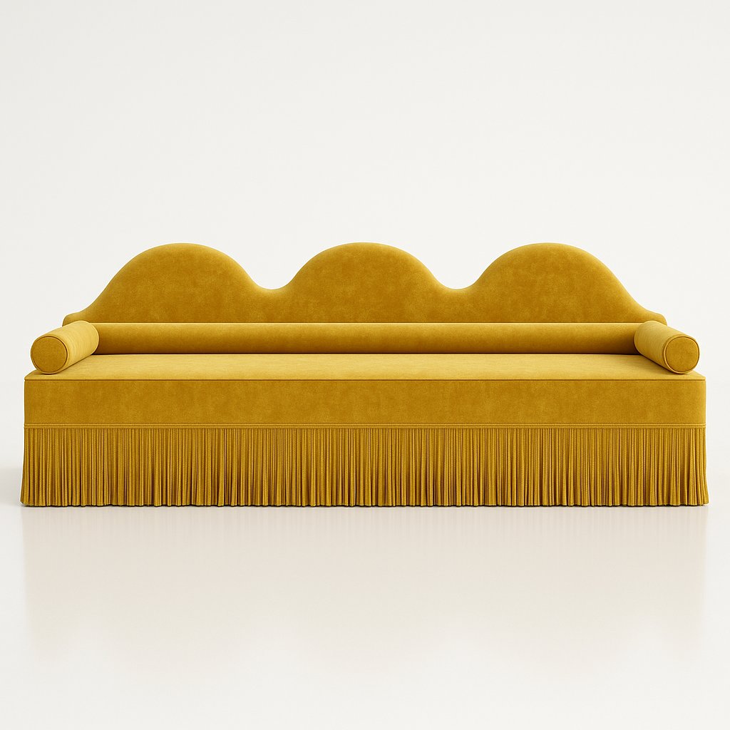 Su respaldo suave y ondulado se combina con un asiento generoso y aterciopelado, realzado por un flequillo largo y refinado que le confiere un encanto teatral y precioso.