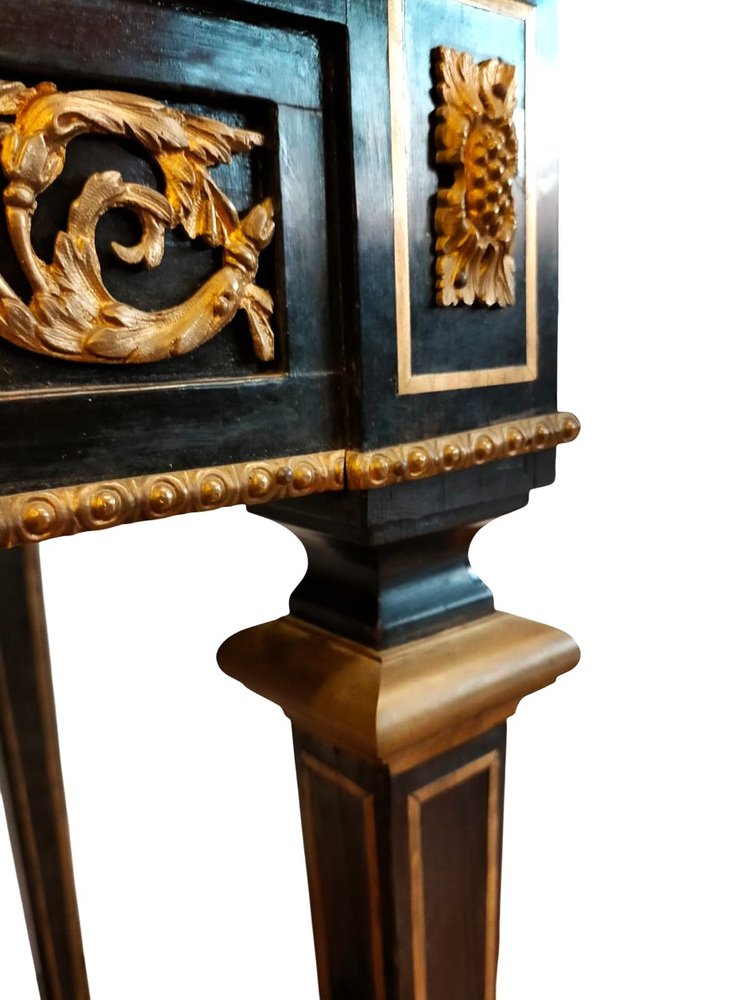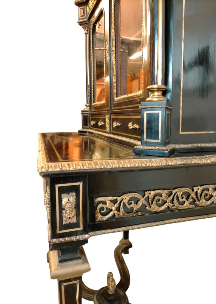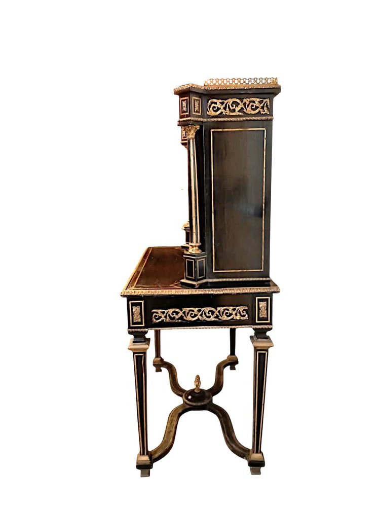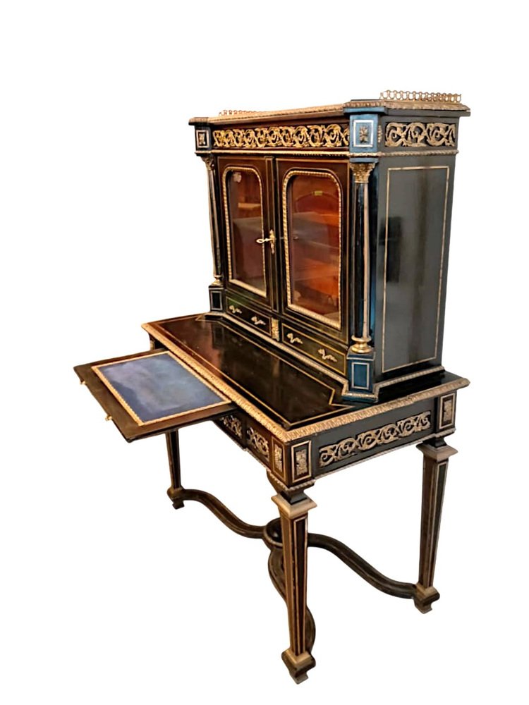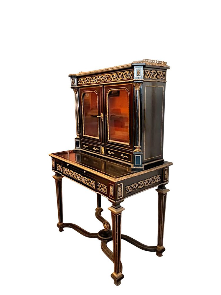 a splendid Bonheur du Jour writing desk with display case, crafted from period French cabinetry, crafted from ebonized mahogany with refined inlays and gilded bronze applications. A piece with classic Louis XVI charm, dating back to the mid-1800s.