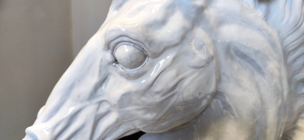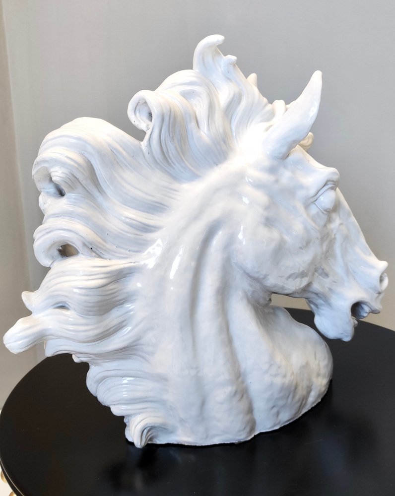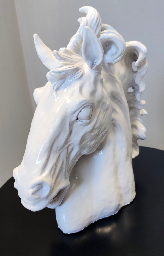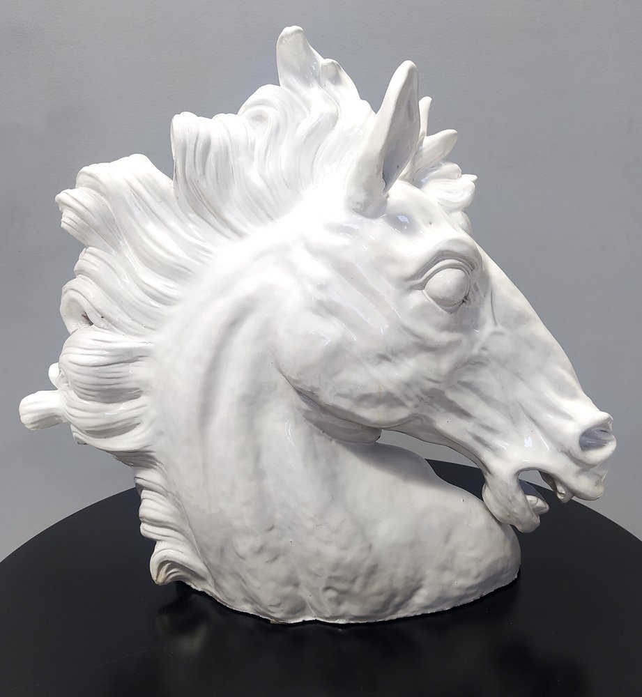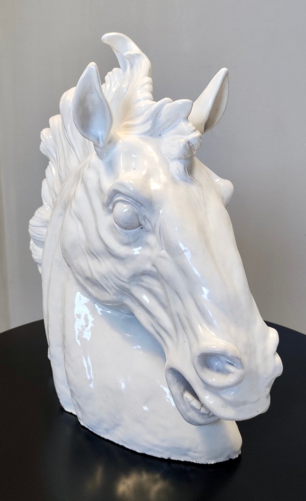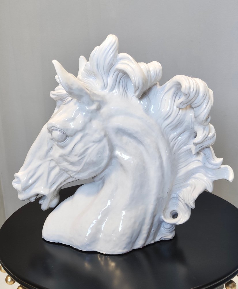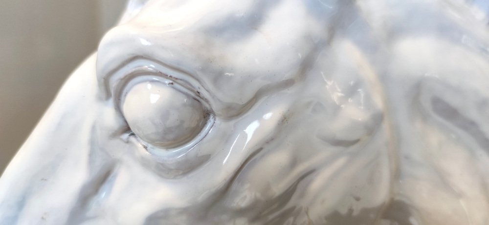 Escultura de cabeza de caballo vintage de loza lacada en blanco, años 80