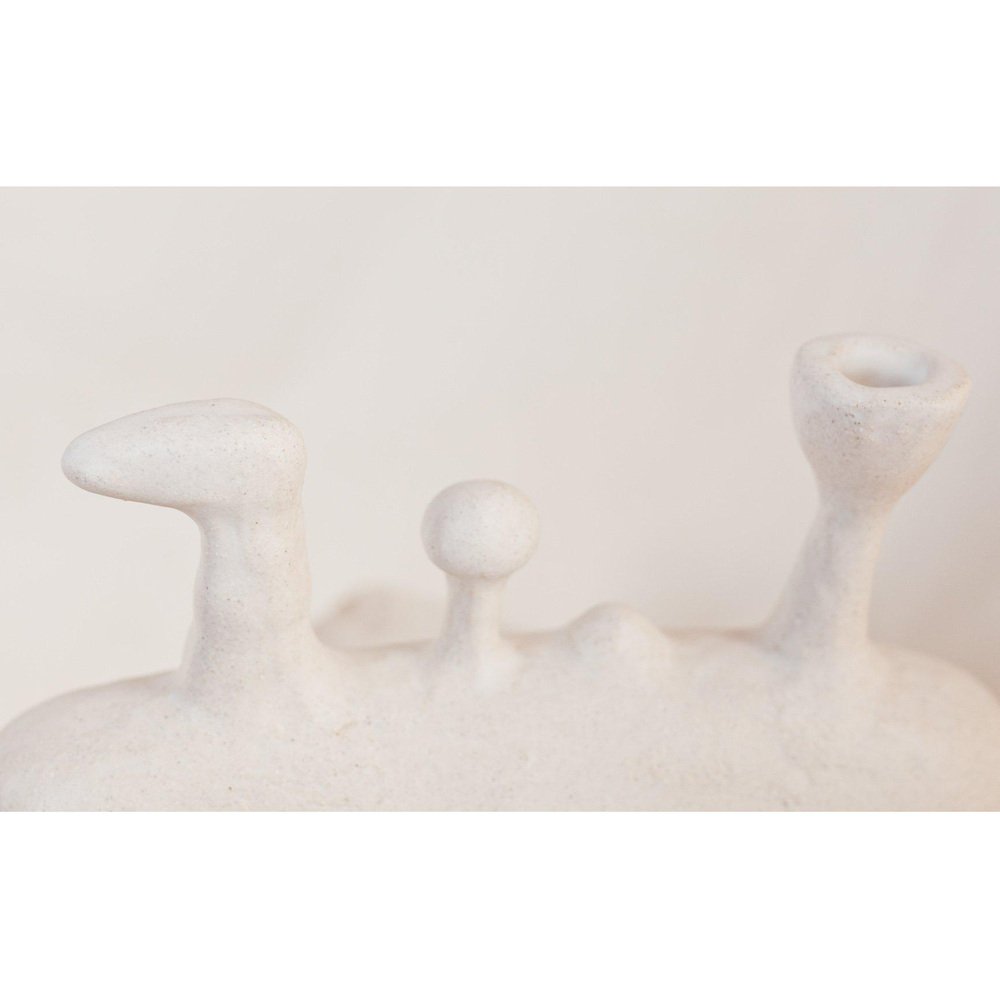 PROYECTO SATORI "Cuando los dioses de las montañas japonesas aparecen como niños, se les conoce como Satori. Los Satori pueden leer tu mente. Pueden decir tus pensamientos más rápido de lo que las palabras salen de tus labios. Si te oyen mentir, pueden matarte o incluso comerte. Desde temprana edad, supe lo que significaba su historia: que cada mentira que dices acerca tu alma un poco más a la muerte. En Japón, la muerte de tu alma es peor que la propia muerte. Mientras crecía, había una pequeña estatua de Satori junto a la puerta de nuestra casa. Nos recordaba que no debíamos mentir, por muy buena solución al sufrimiento que pudiera parecer. Nos recordaba que debíamos aceptar la verdad, y el mundo, tal y como es, y dejar que la vida se desarrollara honestamente a nuestro alrededor. Y lo que es más importante, nos decía que no nos mintiéramos a nosotros mismos. No me tomé en serio este cuento popular hasta que mi hijo, que acababa de cumplir tres años, empezó a mentir. Me quedé horrorizada. Alguien a quien quiero tanto aprendiendo a mentir, para hacer su vida más cómoda. Quiero que mis hijos no mientan. Que les diga que, aunque no siempre es seguro decir la verdad, la mentira es mucho más peligrosa. ¿Cómo podría explicarlo? Recordé la historia del Satori, que "la fe en la verdad" es la única manera de hacer que tu alma sea indestructible. Aproveché la oportunidad para mirarme a mí misma, para mirarme de verdad, y descubrí un millón de mentiras propias. Tuve que parar, para que mis hijos pudieran SENTIR lo que es tener el valor de no mentir. No basta con regañarles, con decirles cómo deben comportarse, sino que debo mostrárselo. Así comenzó mi viaje para fortalecer el alma. Por favor, acompáñenme si quieren. Escuchemos realmente lo que decimos, sintamos la sensación de nuestras palabras - y vivamos de verdad, con Satori a nuestro lado, para mantenernos honestos. Adiós a la mentira que te hace quedar bien. Adiós a la mentira que dice que tienes "razón". Adiós a la mentira que entretiene. Adiós a la mentira que te mantiene agradable, simpático. Adiós a la mentira que cubre la vergüenza, que evita el castigo. Adiós a la mentira que protege a los demás, eso crees. Adiós a la mentira que esconde lo que realmente eres. Adiós a la mentira que te protege de los conflictos, para que nadie sepa lo que defiendes, aunque te sientas seguro así. Adiós a la mentira a medias, que te tienta a no decir toda la verdad. Adiós a la mentira que cree que la verdad no funciona. Adiós a la mentira que controla lo que la gente piensa de ti. Adiós a la mentira que se ocupa del ahora, pero que arruina tu futuro. Adiós a la mentira que te divide a ti y a tu alma. Adiós a la mentira que debilita tu espíritu. Adiós a la mentira que no te deja dormir por la noche, porque sabes que en el fondo te has traicionado a ti mismo. Adiós a la mentira que olvidas donde empieza y termina, un día inundará tu vida. A dónde nos llevarán estos adioses, nadie puede decirlo. Pero no digas mentiras y la realidad estará de tu lado. No hay nada más poderoso. Mi esperanza es que mi colección Satori sirva de recordatorio, para tener el valor de decir la verdad con el mayor cuidado posible. Aceptar que lo que sucede es lo que debe suceder, en esta situación, en este momento. Dejar que el mundo se desarrolle a nuestro alrededor. Y vivir la vida tal y como es. Por la verdad. Por la magia de contarla. Y por la aventura de no saber a dónde nos llevará. Bienvenidos al mundo de la verdad. Donde nuestras almas son indestructibles" - Noe Kuremoto 2022 Escultura de gres blanco W:24 cm D : 7 cm H: 17cm ( aproximadamente)