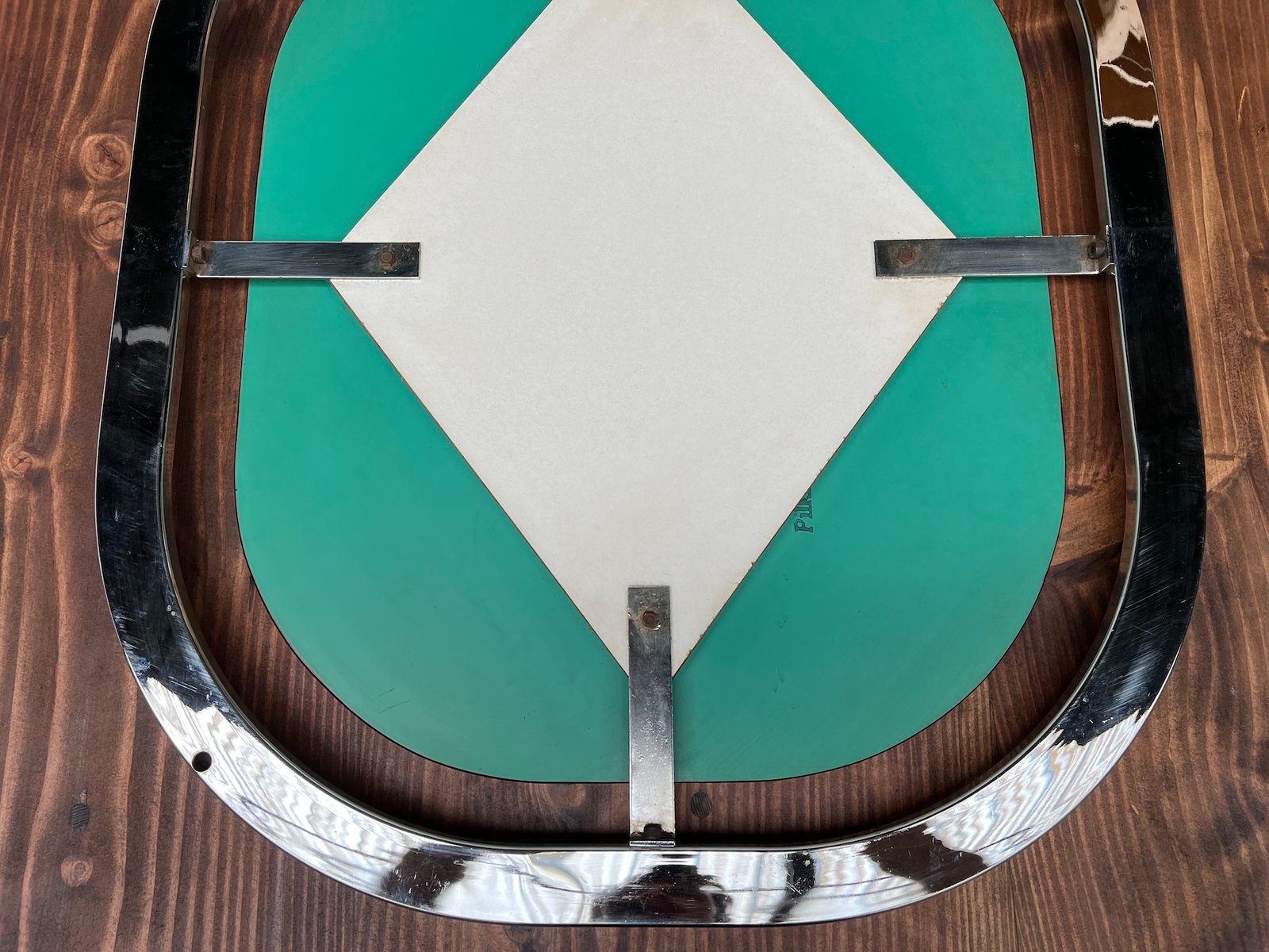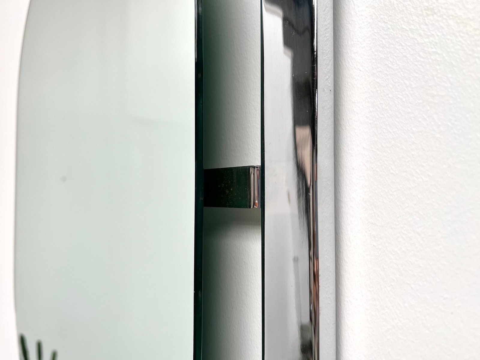 with its assertive geometric lines and chrome metal frame, this wall mirror embodies the functional aesthetic of the Bauhaus. The floating mirror, framed by a thick structure, creates a subtle play of contrasts between industrial rigor and softness of curves. This vintage piece from the 1950s, of French origin, brings a touch of authenticity to your interior.